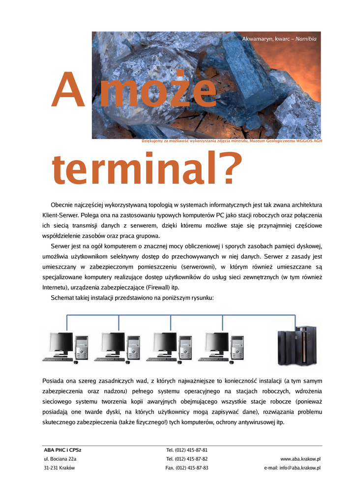 A może Dziękujemy za możliwość wykorzystania zdjęcia minerału, Muzeum Geologicznemu WGGiOŚ AGH terminal? Obecnie najczęściej wykorzystywaną topologią w systemach informatycznych jest tak zwana architektura Klient-Serwer. Polega ona na zastosowaniu typowych komputerów PC jako stacji roboczych oraz połączenia ich siecią transmisji danych z serwerem, dzięki któremu możliwe staje się przynajmniej częściowe współdzielenie zasobów oraz praca grupowa. Serwer jest na ogół komputerem o znacznej mocy obliczeniowej i sporych zasobach pamięci dyskowej, umożliwia użytkownikom selektywny dostęp do przechowywanych w niej danych. Serwer z zasady jest umieszczany w zabezpieczonym pomieszczeniu (serwerowni), w którym również umieszczane są specjalizowane komputery realizujące dostęp użytkowników do usług sieci zewnętrznych (w tym również Internetu), urządzenia zabezpieczające (Firewall) itp. Schemat takiej instalacji przedstawiono na poniższym rysunku: Posiada ona szereg zasadniczych wad, z których najważniejsze to konieczność instalacji (a tym samym zabezpieczenia oraz nadzoru) pełnego systemu operacyjnego na stacjach roboczych, wdrożenia sieciowego systemu tworzenia kopii awaryjnych obejmującego wszystkie stacje robocze (ponieważ posiadają one twarde dyski, na których użytkownicy mogą zapisywać dane), rozwiązania problemu skutecznego zabezpieczenia (także fizycznego!) tych komputerów, ochrony antywirusowej itp. ABA PHC i CPSz Tel. (012) 415-87-81 ul. Bociana 22a Tel. (012) 415-87-82 www.aba.krakow.pl 31-231 Kraków Fax. (012) 415-87-83 e-mail: [email protected] Współczesna technologia umożliwia bardzo proste i skuteczne rozwiązanie tych problemów – pozostawienie w pomieszczeniach, w których pracują użytkownicy monitorów, klawiatur, myszek, drukarek itp., zaś przeniesienie „mocy obliczeniowej” systemu do zabezpieczonej serwerowni. Dzięki takiemu rozwiązaniu redukowane są zarówno koszty eksploatacji systemu, jak i znacząco (a co najważniejsze bezinwestycyjnie) wzrasta jego poziom bezpieczeństwa. Jak to można zrealizować? Istnieje kilka podstawowych sposobów budowy scentralizowanego środowiska komputerowego. Mogą być one wykorzystywane zależnie od potrzeb także w tej samej instalacji, co zapewnia wymaganą obecnie elastyczność. System terminalowy Każdy współczesny profesjonalny system operacyjny (MS Windows, LINUX itp.) pozwala na pracę w trybie terminalowym. Oczywiście współczesne terminale nie przypominają już wcale klasycznych terminali znakowych – umożliwiają wielosesyjną pracę w trybie graficznym, transmisję dźwięku, obsługę różnych urządzeń peryferyjnych praktycznie bez ograniczeń itp. Cena kompletnego (wraz z oprogramowaniem) terminala jest przy tym niższa niż cena komputera PC, a ponieważ jest on wyposażony w specjalizowany system operacyjny oraz nie umożliwia lokalnego przechowywania danych, nie wymaga praktycznie żadnej dodatkowej ochrony (np. antywirusowej) lub sieciowego systemu obsługi kopii awaryjnych. Większość typów terminali jest wyposażana w efektywne systemy zdalnego monitorowania oraz zdalnej administracji i konfiguracji. Użytkownicy systemu terminalowego współdzielą zarówno zasoby sprzętowe, jak i oprogramowanie maszyny centralnej, dzięki czemu znacznie ułatwiona jest administracja tymi zasobami (nie są one rozproszone) oraz prowadzenie kontroli legalności oprogramowania i tworzenie kopii awaryjnych. Zdalny pulpit komputera PC W niektórych przypadkach celowe jest korzystanie z indywidualnego komputera PC – dotyczy to np. prac inżynierskich, zaawansowanej obróbki grafiki itp. Nie wyklucza to jednak możliwości przeniesienia komputera PC do strefy chronionej (serwerowni) – a w dodatku umożliwia wirtualizację środowiska. Komputer umieszczony w serwerowni może zostać wyposażony w specjalistyczne oprogramowanie, które ABA PHC i CPSz Tel. (012) 415-87-81 ul. Bociana 22a Tel. (012) 415-87-82 www.aba.krakow.pl 31-231 Kraków Fax. (012) 415-87-83 e-mail: [email protected] pozwala na uruchomienie kilku (lub nawet kilkunastu) niezależnych maszyn wirtualnych na jednej platformie sprzętowej. Każda z tych maszyn wirtualnych może być wykorzystywana przez osobny system operacyjny. Użytkownik łączy się ze swym wirtualnym systemem za pomocą takiego samego terminala, jak w przypadku systemu terminalowego, jednakże w tym przypadku nie współdzieli on swej maszyny z innymi użytkownikami. Oczywiście, możliwe jest również podłączenie pojedynczego terminala do fizycznego (nie wirtualnego) komputera PC umieszczonego w serwerowni – do takich rozwiązań stworzono najnowocześniejsze platformy sprzętowe zwane „Blade PC”, które pozwalają na bardzo dużą gęstość „upakowania” pakietowych komputerów PC w serwerowni i tym samym oszczędności miejsca oraz poboru energii elektrycznej. Rozwiązanie to jest co najmniej tak efektywne, jak popularne już „Blade Servers”. Dysponowanie pełnymi zasobami fizycznego lub wirtualnego komputera PC zachowuje zalety środowiska terminalowego (centralizacja obsługi) lecz likwiduje problemy związane z pracą niektórych programów w klasycznym środowisku terminalowym. W dalszym ciągu dane organizacji pozostają na nośnikach zainstalowanych w pomieszczeniach chronionych fizycznie. Terminale WWW (Web terminals): Przeglądarka WWW stała się już standardowym interfejsem użytkownika umożliwiając kontakt nie tylko z typowymi stronami WWW, lecz również korzystanie z poczty elektronicznej, a nawet aplikacji biurowych. Technologia JAVA pozwala także na tworzenie specjalistycznych aplikacji (np. obsługi agencji bankowych, bibliotek itp.). Uruchamianie pełnego systemu operacyjnego jedynie w tym celu, aby skorzystać z przeglądarki WWW jest nie tylko nieuzasadnione ekonomicznie, lecz wiąże się również z koniecznością wprowadzenia dodatkowych zabezpieczeń do takiego systemu. W