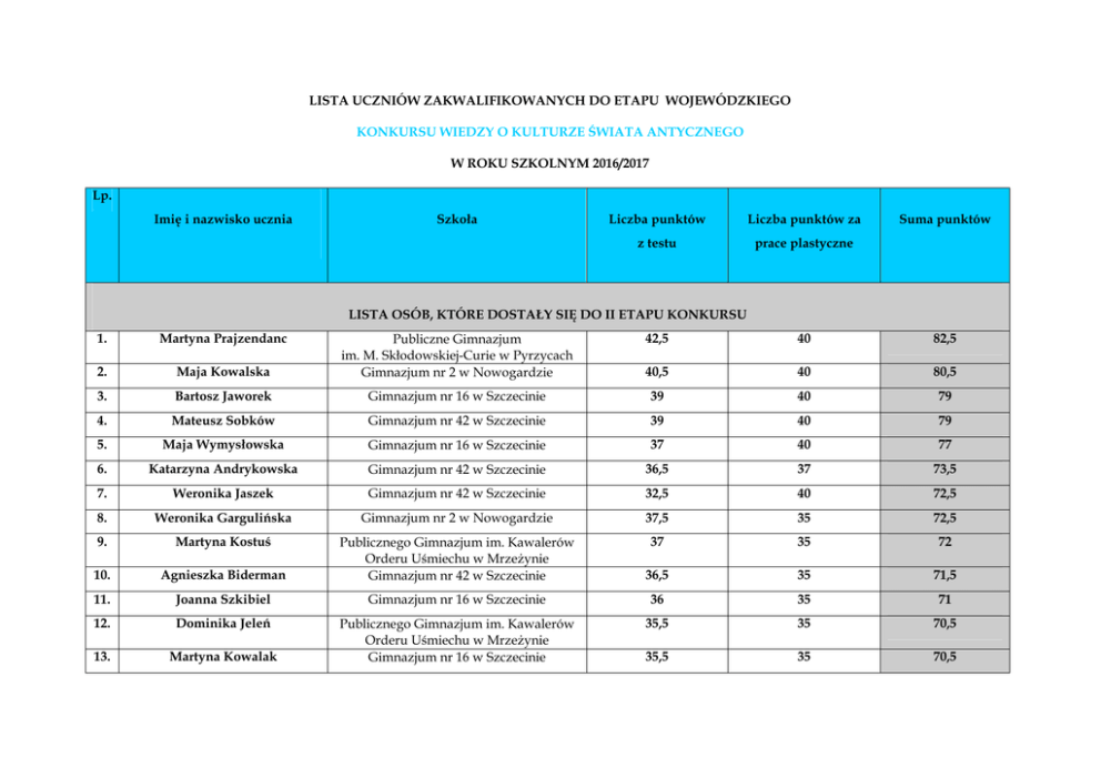 LISTA UCZNIÓW ZAKWALIFIKOWANYCH DO ETAPU WOJEWÓDZKIEGO KONKURSU WIEDZY O KULTURZE ŚWIATA ANTYCZNEGO W ROKU SZKOLNYM 2016/2017 Lp. Imię i nazwisko ucznia Szkoła Liczba punktów Liczba punktów za z testu prace plastyczne Suma punktów LISTA OSÓB, KTÓRE DOSTAŁY SIĘ DO II ETAPU KONKURSU 1. Martyna Prajzendanc 42,5 40 82,5 Maja Kowalska Publiczne Gimnazjum im. M. Skłodowskiej-Curie w Pyrzycach Gimnazjum nr 2 w Nowogardzie 2. 40,5 40 80,5 3. Bartosz Jaworek Gimnazjum nr 16 w Szczecinie 39 40 79 4. Mateusz Sobków Gimnazjum nr 42 w Szczecinie 39 40 79 5. Maja Wymysłowska Gimnazjum nr 16 w Szczecinie 37 40 77 6. Katarzyna Andrykowska Gimnazjum nr 42 w Szczecinie 36,5 37 73,5 7. Weronika Jaszek Gimnazjum nr 42 w Szczecinie 32,5 40 72,5 8. Weronika Gargulińska Gimnazjum nr 2 w Nowogardzie 37,5 35 72,5 9. Martyna Kostuś 37 35 72 10. Agnieszka Biderman Publicznego Gimnazjum im. Kawalerów Orderu Uśmiechu w Mrzeżynie Gimnazjum nr 42 w Szczecinie 36,5 35 71,5 11. Joanna Szkibiel Gimnazjum nr 16 w Szczecinie 36 35 71 12. Dominika Jeleń 35,5 35 70,5 13. Martyna Kowalak Publicznego Gimnazjum im. Kawalerów Orderu Uśmiechu w Mrzeżynie Gimnazjum nr 16 w Szczecinie 35,5 35 70,5 14. Oliwia Stecko Gimnazjum nr 16 w Szczecinie 40 30 70 15. Monika Ramel 43 27 70 16. Olimpia Polińska Publiczne Gimnazjum im. M. Skłodowskiej-Curie w Pyrzycach Gimnazjum nr 42 w Szczecinie 32 37 69 17. Adrianna Kukiełko Gimnazjum nr 2 w Nowogardzie 38,5 30 68,5 18. Jowita Cieślak Gimnazjum nr 42 w Szczecinie 33,5 35 68,5 19. Maja Buriak Gimnazjum nr 2 w Nowogardzie 31 37 68 20. Matylda Wernicka Gimnazjum nr 42 w Szczecinie 32,5 35 67,5 21. Paulina Gładysz 32,5 35 67,5 22. Kinga Kubasiewicz Publicznego Gimnazjum im. Kawalerów Orderu Uśmiechu w Mrzeżynie Gimnazjum nr 16 w Szczecinie 37 30 67 23. Kacper Bestry Gimnazjum nr 16 w Szczecinie 37 30 67 24. Magdalena Jelonek 31,5 35 66,5 25. Dominik Pluta 31 35 66 26. Weronika Jędrzejczyk 31 35 66 27. Iga Małachowska Publicznego Gimnazjum im. Kawalerów Orderu Uśmiechu w Mrzeżynie Publicznego Gimnazjum im. Kawalerów Orderu Uśmiechu w Mrzeżynie Publicznego Gimnazjum im. Kawalerów Orderu Uśmiechu w Mrzeżynie Gimnazjum nr 42 w Szczecinie 31 33 64 28. Krzysztof Bestry Gimnazjum nr 16 w Szczecinie 35 28 63 29. Maria Korszeń Gimnazjum nr 2 w Nowogardzie 33 30 63 30. Natalia Jastrzębska Publicznego Gimnazjum im. Kawalerów Orderu Uśmiechu w Mrzeżynie 35 26 61 LISTA OSÓB, KTÓRE ZE WZGLĘDU NA ZBYT MAŁĄ LICZBĘ PUNKTÓW Z TESTU LUB NIEDOSTARCZENIE PRACY PLASTYCZNEJ NIE DOSTAŁY SIĘ DO II ETAPU KONKURSU 31. Joanna Wardak Gimnazjum nr 42 w Szczecinie 27,5 37 64,5 32. Julia Serafin Gimnazjum nr 42 w Szczecinie 24,5 40 64,5 33. Michalina Kiryk Gimnazjum nr 2 w Nowogardzie 25,5 35 60,5 34. Martyna Tchoryk 22,5 37 59,5 35. Julia Szołdra Publicznego Gimnazjum im. Kawalerów Orderu Uśmiechu w Mrzeżynie Gimnazjum nr 32 w Szczecinie 26 33 59 36. Piotr Bethke Gimnazjum nr 16 w Szczecinie 28 30 58 37. Alicja Szczepańska Gimnazjum nr 42 w Szczecinie 24 30 54 38. Martyna Bułło Gimnazjum nr 42 w Szczecinie 26,5 27 53,5 39. Martyna Straszewska Gimnazjum nr 16 w Szczecinie 33 Brak pracy 33 40. Aleksandra Wancerz 32,5 Brak pracy 32,5 41. Maja Hrycan Publiczne Gimnazjum im. M. Skłodowskiej-Curie w Pyrzycach Gimnazjum nr 42 w Szczecinie 25,5 Brak pracy 25,5
