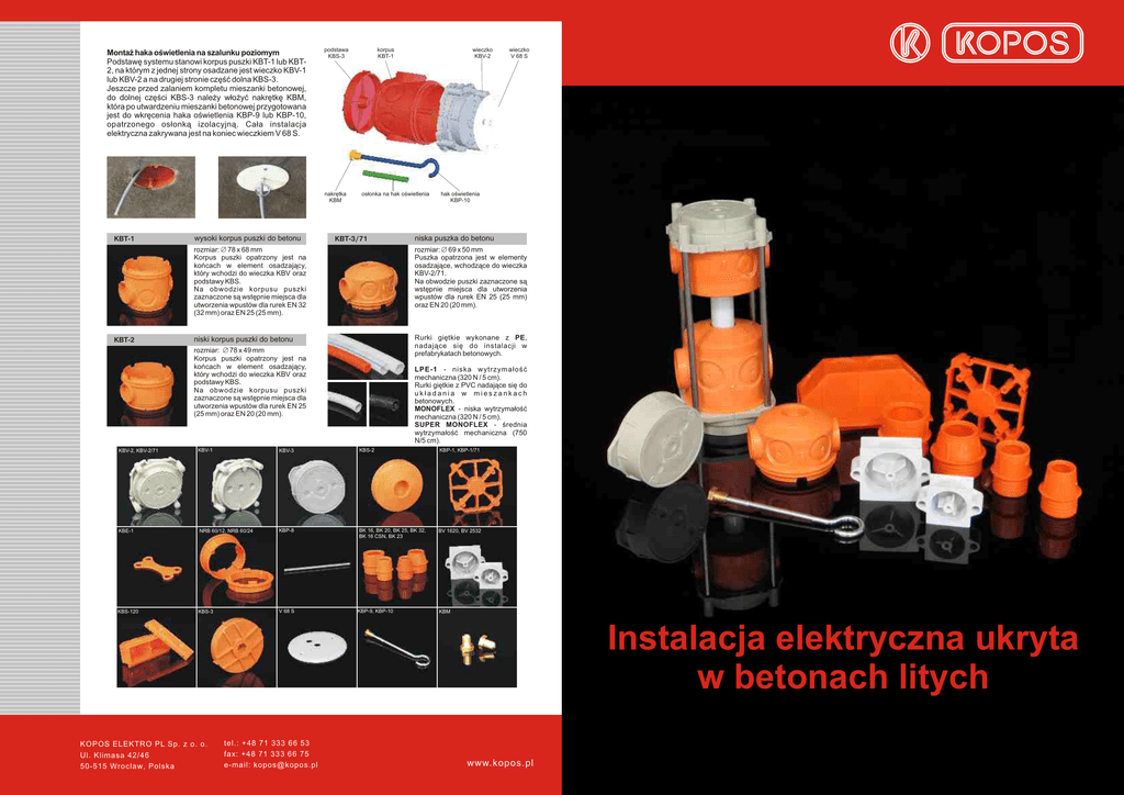 Montaż haka oświetlenia na szalunku poziomym Podstawę systemu stanowi korpus puszki KBT-1 lub KBT2, na którym z jednej strony osadzane jest wieczko KBV-1 lub KBV-2 a na drugiej stronie część dolna KBS-3. Jeszcze przed zalaniem kompletu mieszanki betonowej, do dolnej części KBS-3 należy włożyć nakrętkę KBM, która po utwardzeniu mieszanki betonowej przygotowana jest do wkręcenia haka oświetlenia KBP-9 lub KBP-10, opatrzonego osłonką izolacyjną. Cała instalacja elektryczna zakrywana jest na koniec wieczkiem V 68 S. podstawa KBS-3 nakrętka KBM KBT-1 KBT-2 wysoki korpus puszki do betonu korpus KBT-1 wieczko KBV-2 osłonka na hak oświetlenia KBT-3/71 wieczko V 68 S hak oświetlenia KBP-10 niska puszka do betonu rozmiar: Ć 78 x 68 mm Korpus puszki opatrzony jest na końcach w element osadzający, który wchodzi do wieczka KBV oraz podstawy KBS. Na obwodzie korpusu puszki zaznaczone są wstępnie miejsca dla utworzenia wpustów dla rurek EN 32 (32 mm) oraz EN 25 (25 mm). rozmiar: Ć 69 x 50 mm Puszka opatrzona jest w elementy osadzające, wchodzące do wieczka KBV-2/71. Na obwodzie puszki zaznaczone są wstępnie miejsca dla utworzenia wpustów dla rurek EN 25 (25 mm) oraz EN 20 (20 mm). niski korpus puszki do betonu Rurki giętkie wykonane z PE, nadające się do instalacji w prefabrykatach betonowych. rozmiar: Ć 78 x 49 mm Korpus puszki opatrzony jest na końcach w element osadzający, który wchodzi do wieczka KBV oraz podstawy KBS. Na obwodzie korpusu puszki zaznaczone są wstępnie miejsca dla utworzenia wpustów dla rurek EN 25 (25 mm) oraz EN 20 (20 mm). LPE-1 - niska wytrzymałość mechaniczna (320 N / 5 cm). Rurki giętkie z PVC nadające się do układania w mieszankach betonowych. MONOFLEX - niska wytrzymałość mechaniczna (320 N / 5 cm). SUPER MONOFLEX - średnia wytrzymałość mechaniczna (750 N/5 cm). KBV-2, KBV-2/71 KBV-1 KBV-3 KBS-2 KBP-1, KBP-1/71 KBE-1 NRB 60/12, NRB 60/24 KBP-8 BK 16, BK 20, BK 25, BK 32, BK 16 CSN, BK 23 BV 1620, BV 2532 KBS-120 KBS-3 V 68 S KBP-9, KBP-10 KBM Instalacja elektryczna ukryta w betonach litych KOPOS ELEKTRO PL Sp. z o. o. Ul. Klimasa 42/46 50-515 Wroclaw, Polska tel.: +48 71 333 66 53 fax: +48 71 333 66 75 e-mail: [email protected] www.kopos.pl Firma KOPOS KOLÍN oferuje przemyślany system układania instalacji w betonowych konstrukcjach litych. Elektroinstalacyjny program betonowy składa się z poszczególnych komponentów, których wzajemna kombinacja pozwala na zastosowanie tych wyrobów w różnych wariantach, występujących w obiektach budowlanych realizowanych w oparciu o technologię litych mieszanek betonowych wlewanych do szalunków albo przy produkcji prefabrykatów panelowych, takich jak elementy ścienne lub stropowe. Materiał elektroinstalacyjny przeznaczony dla układania przewodów elektrycznych w betonie musi być odporny na uszkodzenia mechaniczne przykładowo podczas montażu i unieruchamianiu materiału w szalunku; materiał ten musi być również odporny na wypadek przedostania się mieszanki betonowej do rurek. Materiał musi również spełniać wymagania dotyczące obciążeń cieplnych, w sytuacji kiedy temperatura podczas montażu w okresie zimowym może obniżyć się nawet do poziomu -15°C a przy ogrzewaniu mieszanki betonowej może wzrosnąć nawet do +90°C. Program układania instalacji elektrycznych w betonie oferowany przez firmę KOPOS wykonany jest z polipropylenu bezhalogenowego o odporności cieplnej w zakresie -25°C do +105°C oraz z polietylenu bezhalogenowego o odporności cieplnej w zakresie -30°C do +70°C, krótkotrwale nawet +90°C. Zgodnie z wymaganiami normy ČSN EN 60 670-1 art. 18 wyroby z tych materiałów spełniają wymagania próby wytrzymałości na nadmierne ocieplenie oraz palenie pętli cieplnej przy temperaturze 650°C. Program betonowy przeznaczony jest dla instalacji rozdzielczych o napięciu do 400 V. Cały program składa się z indywidualnych komponentów, w oparciu o które - odpowiednio do typu budynku, grubości ścian lub sposobu przeznaczenia kombinowane są odpowiednie zestawy. Głównym punktem w zestawie jest puszka względnie jej korpus, do której dołączane są dolne części puszek oraz wieczka; odpowiednio do przeznaczenia zestaw ten uzupełniany jest o podpórki, System puszek dla montażu samodzielnego przyrządu rozpórki, rurki dystansowe oraz drążki, końcówki wylotowe, końcówki oraz dla sprowadzenia systemu rurkowego w jedno miejsce dodatkowym elementem jest puszka zbiorcza. Nieodłączonym elementem systemu są rurki, przy pomocy których dochodzi do połączenia puszek lub wyprowadzenia przewodów na powierzchnię. Do tego celu nadają się rurki giętkie z PVC lub z PE o wytrzymałości mechanicznej równej lub większej niż 320 N. Rozmiar rurki wynika z wstępnie wytłoczonych przepustów na puszce. Dla instalacji rozdzielczych prowadzonych w budynkach betonowych konieczne jest przygotowanie materiału do układania instalacji elektrycznych przed zalaniem mieszanką betonową. Zestawy puszek muszą być przymocowane do szalunku, cały system elektroinstalacyjny zaleca się przymocować przy pomocy pasków ściągających do u s z t y w n i e ń zbrojeniowych, a przepusty wokół rurek wskazane jest uszczelnić s i l i k o n e m . P o zakończeniu dojrzewania mieszanki betonowej oraz po demontażu szalunku, przy użyciu siły należy usunąć czołowe wieczko wyłamywane i wykonać końcowy montaż elektryczny wewnątrz puszek, ewentualnie wskazane jest włożenie haków żyrandolowych o odpowiedniej długości. Sposoby montażu systemu puszek odpowiednio do wyprowadzenia - montaż jednostronny - wyprowadzenie dla instalacji elektrycznej na jedną stronę ściany - montaż dwustronny - wyprowadzenia na obydwie strony ścian odpowiednio do późniejszego zastosowania przyrządów - przyrząd samodzielny - więcej przyrządów bez wspólnej ramki - więcej przyrządów ze wspólną ramką Program instalacji elektrycznych d