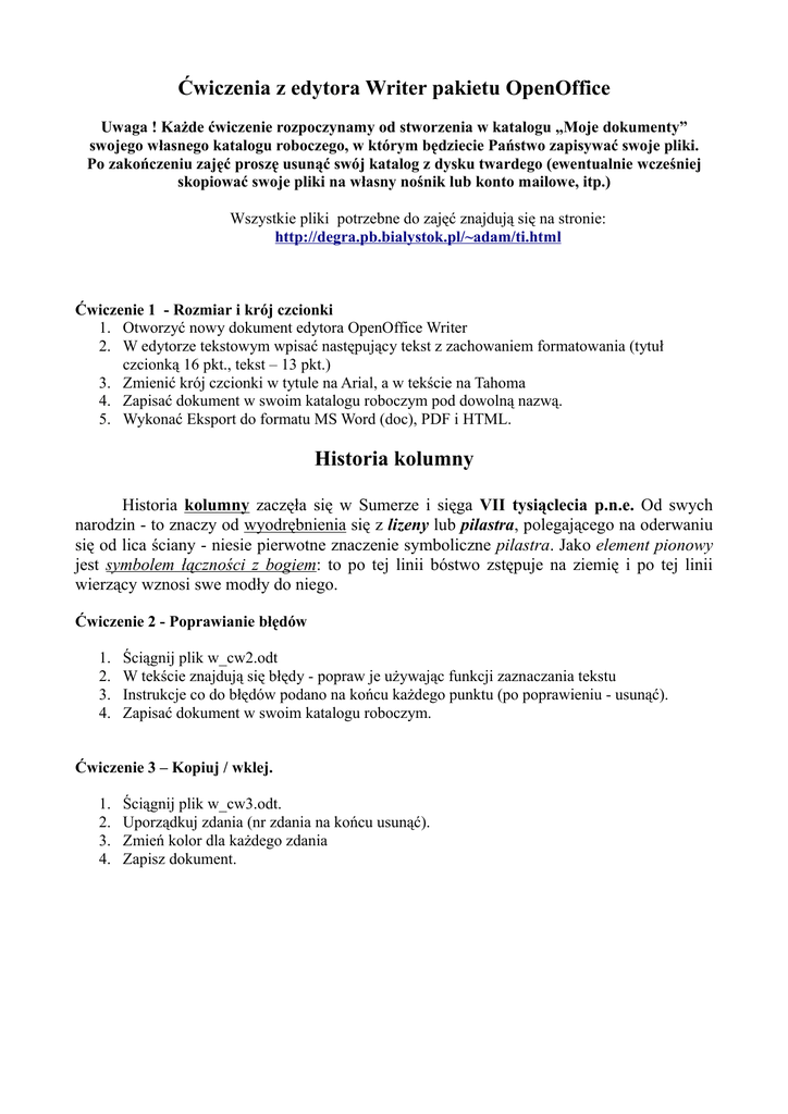 Ćwiczenia z edytora Writer pakietu OpenOffice Uwaga ! Każde ćwiczenie rozpoczynamy od stworzenia w katalogu „Moje dokumenty” swojego własnego katalogu roboczego, w którym będziecie Państwo zapisywać swoje pliki. Po zakończeniu zajęć proszę usunąć swój katalog z dysku twardego (ewentualnie wcześniej skopiować swoje pliki na własny nośnik lub konto mailowe, itp.) Wszystkie pliki potrzebne do zajęć znajdują się na stronie: http://degra.pb.bialystok.pl/~adam/ti.html Ćwiczenie 1 - Rozmiar i krój czcionki 1. Otworzyć nowy dokument edytora OpenOffice Writer 2. W edytorze tekstowym wpisać następujący tekst z zachowaniem formatowania (tytuł czcionką 16 pkt., tekst – 13 pkt.) 3. Zmienić krój czcionki w tytule na Arial, a w tekście na Tahoma 4. Zapisać dokument w swoim katalogu roboczym pod dowolną nazwą. 5. Wykonać Eksport do formatu MS Word (doc), PDF i HTML. Historia kolumny Historia kolumny zaczęła się w Sumerze i sięga VII tysiąclecia p.n.e. Od swych narodzin - to znaczy od wyodrębnienia się z lizeny lub pilastra, polegającego na oderwaniu się od lica ściany - niesie pierwotne znaczenie symboliczne pilastra. Jako element pionowy jest symbolem łączności z bogiem: to po tej linii bóstwo zstępuje na ziemię i po tej linii wierzący wznosi swe modły do niego. Ćwiczenie 2 - Poprawianie błędów 1. 2. 3. 4. Ściągnij plik w_cw2.odt W tekście znajdują się błędy - popraw je używając funkcji zaznaczania tekstu Instrukcje co do błędów podano na końcu każdego punktu (po poprawieniu - usunąć). Zapisać dokument w swoim katalogu roboczym. Ćwiczenie 3 – Kopiuj / wklej. 1. 2. 3. 4. Ściągnij plik w_cw3.odt. Uporządkuj zdania (nr zdania na końcu usunąć). Zmień kolor dla każdego zdania Zapisz dokument. Ćwiczenie 4 – Format czcionki 1. W nowym dokumencie wpisać następujący tekst zgodnie z zachowaniem formatowania. 2. Wykorzystać opcje pogrubienia, kursywy, kapitalików, indeksów, przekreślenia i podkreślenia oraz odstępów. 3. Zapisać dokument w swoim katalogu roboczym INTERFEJS jest to część oprogramowania zajmującą się obsługą urządzeń wejścia/WYJŚCIA przeznaczonych dla i n t e r a k c j i z użytkownikiem. wejścia Ćwiczenie 5 – Wstawianie i czcionki 1. Ściągnąć i otworzyć plik w_cw5.odt 2. Dokument zawiera kilka przysłów i powiedzeń. Każde z nich zapisano inną czcionką. 3. W tekście brakuje kilku słów – uzupełnij pamiętając o kroju pisma. Ćwiczenie 6 – Wstawianie symboli 1. Ściągnij plik w_cw6.odt. 2. Zamień wszystkie słowa alfa, beta i gamma na odpowiednie litery alfabetu greckiego α, β, γ. 3. Zapisz zmiany. Ćwiczenie 7 – Wyszukiwanie i zamiana 1. 2. 3. 4. 5. 6. 7. 8. Ściągnij plik w_cw7.odt W pliku ktoś błędnie zamienił wszystkie wyrazy Białystok na Warszawa – popraw. W pliku ktoś błędnie zamienił Jana Klemensa Branickiego na Mieszka I – popraw. W pliku ktoś błędnie zamienił Nowowschodnich na Starowschodnich – popraw W pliku ktoś błędnie zamienił Izabelą Poniatowską na Izabelą Trojanowską – popraw W pliku ktoś błędnie zamienił Żydów na Romów – popraw W pliku ktoś błędnie zamienił żubrówkę na bimber – popraw Zapisz zmiany. Ćwiczenie 8 – Formatowanie akapitów 1. Napisz podany tekst używając odpowiedniego wyrównania i obramowania akapitu 2. Zapisz plik pod nazwą akapit.odt Ikona „Włącz/wyłacz numerację”- umożliwia utworzenie z zaznaczonego tekstu listy numerowanej. Każdy nowy akapit otrzymuje kolejny numer. Wyłączenie numerowania następuje po ponownym wciśnięciu ikony. Ikona „Włącz/wyłacz wypunktowanie” - umożliwia poprzedzenie kolejnych akapitów wybranym znakiem wyliczania. Ikony „Zmniejsz wcięcie” i „Zwiększ wcięcie” - używane są przy tworzeniu zagłębionych list wielopoziomowych. Formatowanie takiej listy odbywa się przy pomocy opcji „Wyliczanie i formatowanie” z menu „Format” Ćwiczenie 9 – Formatowanie tekstu 1. Utwórz nowy dokument 2. Przygotuj przepisy wg. poniższego formatu. 3. Zapisz dokument na dysku pod dowolną nazwą. COOKIES 'N' CREAM Składniki: 45 ml kremu kakaowego 15 ml likieru waniliowego mleko do uzupełnienia Szkło: szklanka do long drinków Przepis: Wlać do szklanki krem kakaowy i likier waniliowy a następnie uzupełnić mlekiem. ZOMBIE SOUL POWER Składniki: 180 ml whiskey 30 ml czerownego wina Szkło: szklanka do long drinków Przepis: Tego drinka pijał sam "ojciec chrzestny" soul'u - James Brown. Należy najpierw wlać do szklanki dobrą whiskey, a następnie wino. Ćwiczenie 10 – Formatowanie akapitów 1. Ściągnij i otwórz plik w_cw10.odt. 2. W dokumencie zapisano wiersz, który nie jest podzielony na zwrotki. Proszę podzielić go na zwrotki (po 4 wersy w zwrotce) wstawiając odstępy między akapitami (Format --> Akapit). Zwrotki parzyste proszę przesunąć nieco w prawo w stosunku do nieparzystych. 3. Zapisz dokument. Ćwiczenie 11 – Praca z kilkoma dokumentami 1. Ściągnąć i otworzyć pliki o nazwach w_cw11a.odt i w_wc11b.odt. 2. Dokumenty zawierają teksty piosenki przeznaczonej dla dwóch wykonawców. Początkowo śpiewak A miał śpiewać zwrotki 1, 4 i refren a drugi (B) miał śpiewać zwrotki 2, 3. W trakcie prób zaproponowano zmianę i ustalono, że wykonawca A będzie śpiewał zwrotki 1, 3, adrugi zwrotki 2 i 4, natomiast refren zaśpiewają razem. Należy przygotować właściwe dokumenty dla obu śpiewaków (po każdej zwrotce ma się znajdować refren). Należy użyć funkcji : Wytnij, Kopiuj i Wklej oraz funkcji z menu Okno. 3. Zapisać zmiany w dokumentach Ćwiczenie 12 – Podział strony 1. Ściągnąć i otworzyć dokument w_cw12.odt 2. W dokumencie zapisano 3 podania – mylnie na jednej stronie. 3. Rozdzielić je tak, aby każde zawiadomienie znajdowało się na oddzielnej stronie (nie używając ENTERA !!!) 4. Zapisać dokument Ćwiczenie 13 – Wypunktowanie (wyliczanie) 1. Ściągnąć i otwo