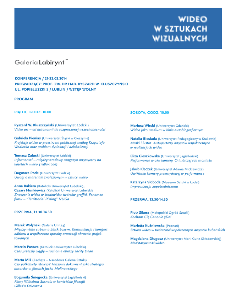 KONFERENCJA / 21-22.02.2014 PROWADZĄCY: PROF. ZW. DR HAB. RYSZARD W. KLUSZCZYŃSKI UL. POPIEŁUSZKI 5 / LUBLIN / WSTĘP WOLNY PROGRAM PIĄTEK, GODZ. 10.00 SOBOTA, GODZ. 10.00 Ryszard W. Kluszczyński (Uniwersytet Łódzki) Video art – od autonomii do rozproszonej wszechobecności Mariusz Wirski (Uniwersytet Gdański) Wideo jako medium w kinie autobiograficznym Gabriela Pienias (Uniwersytet Śląski w Cieszynie) Projekcje wideo w przestrzeni publicznej według Krzysztofa Wodiczko oraz problem dyslokacji i delokalizacji Natalia Biesiada (Uniwersytet Pedagogiczny w Krakowie) Maski i lustra. Autoportrety artystów współczesnych w realizacjach wideo Tomasz Załuski (Uniwersytet Łódzki) Infermental – międzynarodowy magazyn artystyczny na kasetach wideo (1980-1991) Eliza Cieszkowska (Uniwersytet Jagielloński) Performance w oku kamery. O twórczej roli montażu Dagmara Rode (Uniwersytet Łódzki) Uwagi o materiale znalezionym w sztuce wideo Anna Bakiera (Katolicki Uniwersytet Lubelski), Cezary Hunkiewicz (Katolicki Uniwersytet Lubelski) Znaczenie wideo w środowisku twórców graffiti. Fenomen filmu – “Territtorial Pissing” NUGa Jakub Kłeczek (Uniwersytet Adama Mickiewicza) Uwikłania kamery przemysłowej w performance Katarzyna Słoboda (Muzeum Sztuki w Łodzi) Improwizacja zapośredniczona PRZERWA, 13.30-14.30 PRZERWA, 13.30-14.30 Piotr Sikora (Małopolski Ogród Sztuki) Kocham Cię Canonie 5De! Marek Wołyński (Galeria Unit24) Między white cubem a black boxem. Komunikacja i komfort odbioru a współczesne sposoby aranżacji obrazów projektowanych Marietta Kuźniewska (Poznań) Sztuka wideo w twórczości współczesnych artystów kubańskich Marcin Pastwa (Katolicki Uniwersytet Lubelski) Czas przeszły ciągły – ruchome obrazy Tacity Dean Marta Miś (Zachęta – Narodowa Galeria Sztuki) Czy półkobiety istnieją? Fałszywy dokument jako strategia autorska w filmach Jacka Malinowskiego Bogumiła Śniegocka (Uniwersytet Jagielloński) Filmy Wilhelma Sasnala w kontekście filozofii Gilles’a Deleuze’a Magdalena Długosz (Uniwersytet Marii Curie-Skłodowskiej) Medytatywność wideo