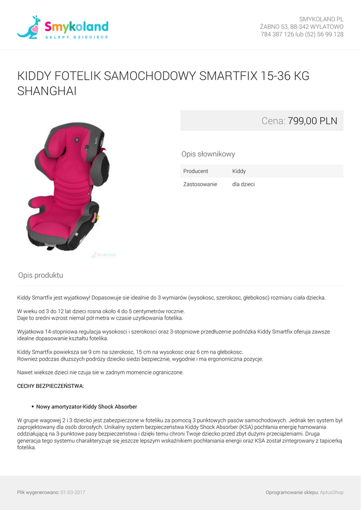 SMYKOLAND.PL ŻABNO 53, 88-342 WYLATOWO 784 387 126 lub (52) 56 99 128 KIDDY FOTELIK SAMOCHODOWY SMARTFIX 15-36 KG SHANGHAI Cena: 799,00 PLN Opis słownikowy Producent Kiddy Zastosowanie dla dzieci Opis produktu Kiddy Smartfix jest wyjatkowy! Dopasowuje sie idealnie do 3 wymiarów (wysokosc, szerokosc, głebokosc) rozmiaru ciała dziecka. W wieku od 3 do 12 lat dzieci rosna około 4 do 5 centymetrów rocznie. Daje to sredni wzrost niemal pół metra w czasie uzytkowania fotelika. Wyjatkowa 14-stopniowa regulacja wysokosci i szerokosci oraz 3-stopniowe przedłuzenie podnózka Kiddy Smartfix oferuja zawsze idealne dopasowanie kształtu fotelika. Kiddy Smartfix powieksza sie 9 cm na szerokosc, 15 cm na wysokosc oraz 6 cm na głebokosc. Równiez podczas dłuzszych podrózy dziecko siedzi bezpiecznie, wygodnie i ma ergonomiczna pozycje. Nawet wieksze dzieci nie czuja sie w zadnym momencie ograniczone. CECHY BEZPIECZEŃSTWA: Nowy amortyzator-Kiddy Shock Absorber W grupie wagowej 2 i 3 dziecko jest zabezpieczone w foteliku za pomocą 3 punktowych pasów samochodowych. Jednak ten system był zaprojektowany dla osób dorosłych. Unikalny system bezpieczeństwa Kiddy Shock Absorber (KSA) pochłania energię hamowania oddziałującą na 3-punktowe pasy bezpieczeństwa i dzięki temu chroni Twoje dziecko przed zbyt dużymi przeciążeniami. Druga generacja tego systemu charakteryzuje się jeszcze lepszym wskaźnikiem pochłaniania energii oraz KSA został zintegrowany z tapicerką fotelika. Plik wygenerowano: 01-03-2017 Oprogramowanie sklepu: AptusShop SMYKOLAND.PL ŻABNO 53, 88-342 WYLATOWO 784 387 126 lub (52) 56 99 128 Idealnie dopasowany! Kiddy smartfix można idealnie dopasować do rozmiarów każdego dziecka zarówno na wysokość jak i szerokość. Dokładnie dopasowany fotelik jest zdecydowanie bardziej bezpieczny. Na każdym etapie wzrostu dziecka dostępna jest taka "bezpieczna regulacja". Zoptymalizowana geometria fotelika Dzięki zaprojektowaniu na nowo osłon bocznych (na głowę i ramiona) nasz materiał high-tech Honey Comb V2 okazał się jeszcze bardziej efektywny. Głowa i ramiona są chronione najlepiej jak to możliwe w razie kolizji bocznej. Jednocześnie dziecko cały czas ma dobrą widoczność na boki. Materiały High-tech Fotelik z jeszcze lepszą ochroną przed uderzeniami z boku! Głowka i ramiona dzieci sa szczególnie wrażliwe ponieważ główka jest stosunkowo ciężka w porównaniu do reszty ciała. Stosując materiał zaawansowany technologicznie pochłaniający energię Honey Comb V2 w zagłówku i osłonach ramion dajemy realną ochronę tym szczególnie ważnym częściom ciała. Plik wygenerowano: 01-03-2017 Powered by TCPDF (www.tcpdf.org) Oprogramowanie sklepu: AptusShop