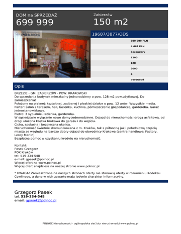 DOM na SPRZEDAŻ 699 999 Zabierzów 150 m2 19687/3877/ODS 699 999 PLN 4 667 PLN Secondary 1200 128 2000 4 VeryGood Opis BRZEZIE - GM. ZABIERZÓW - POW. KRAKOWSKI Do sprzedania budynek mieszkalny jednorodzinny o pow. 128 m2 pow.użytkowej. Do zamieszkania! Położony na pięknej: kształtnej, zadbanej i płaskiej działce o pow. 12 arów. Wszystkie media. Parter: salon z tarasem, hall, łazienka, kuchnia, pomieszczenie gospodarcze, garderoba. Garaż jednostanowiskowy. Pietro: 3 sypialnie, łazienka, garderoba. W sąsiedztwie wyłącznie nowe domy jednorodzinne. Dojazd do nieruchomości drogą asfaltową, od drogi ułożona kostka brukowa do garażu i do wejścia. Cicha, spokojna i bezpieczna okolica. Nieruchomość świetnie skomunikowana z m. Kraków, tak z północną jak i południową częścią miasta ze względu na bardzo dobry dojazd do obwodnicy Krakowa (centra handlowe: Factory, Leroy Merlin). Bezpłatna pomoc w uzyskaniu kredytu na nieruchomość. Kontakt: Pasek Grzegorz POK Kraków tel: 519-334-548 e-mail: [email protected] Więcej ofert na www.polnoc.pl Więcej ofert znajdziesz na naszej stronie www.polnoc.pl * UWAGA! Zamieszczone na naszych stronach oferty nie stanowią oferty w rozumieniu Kodeksu Cywilnego, a dane w nich zawarte mają jedynie charakter informacyjny. Grzegorz Pasek tel. 519-334-548 email: [email protected] PÓŁNOC Nieruchomości - ogólnopolska sieć biur nieruchomości www.polnoc.pl Powered by TCPDF (www.tcpdf.org)