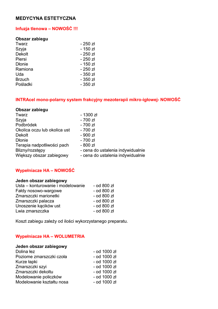 MEDYCYNA ESTETYCZNA Infuzja tlenowa – NOWOŚĆ !!! Obszar zabiegu Twarz Szyja Dekolt Piersi Dłonie Ramiona Uda Brzuch Pośladki - 250 zł - 150 zł - 250 zł - 250 zł - 150 zł - 250 zł - 350 zł - 350 zł - 350 zł INTRAcel mono-polarny system frakcyjny mezoterapii mikro-igłowej- NOWOŚĆ Obszar zabiegu Twarz Szyja Podbródek Okolica oczu lub okolica ust Dekolt Dłonie Terapia nadpotliwości pach Blizny/rozstępy Większy obszar zabiegowy - 1300 zł - 700 zł - 700 zł - 700 zł - 900 zł - 700 zł - 800 zł - cena do ustalenia indywidualnie - cena do ustalenia indywidualnie Wypełniacze HA – NOWOŚĆ Jeden obszar zabiegowy Usta – konturowanie i modelowanie Fałdy nosowo-wargowe Zmarszczki marionetki Zmarszczki palacza Unoszenie kącików ust Lwia zmarszczka - od 800 zł - od 800 zł - od 800 zł - od 800 zł - od 800 zł - od 800 zł Koszt zabiegu zależy od ilości wykorzystanego preparatu. Wypełniacze HA – WOLUMETRIA Jeden obszar zabiegowy Dolina łez Poziome zmarszczki czoła Kurze łapki Zmarszczki szyi Zmarszczki dekoltu Modelowanie policzków Modelowanie kształtu nosa - od 1000 zł - od 1000 zł - od 1000 zł - od 1000 zł - od 1000 zł - od 1000 zł - od 1000 zł Koszt zabiegu zależy od ilości wykorzystanego preparatu. MEZOTERAPIA IGŁOWA BIOMIMETYCZNA - HIT INŻYNIERII GENETYCZNEJ Obszar zabiegu Twarz Szyja Dekolt Okolica oczu lub okolica ust Piersi Brzuch Dłonie Skóra głowy - 650 zł - 400 zł - 650 zł - 400 zł - 500 zł - od 550 zł - 350 zł - 400 zł Lipoliza biomimetyczna - 350 zł jedna ampułka Na 1 zabieg lipolizy średnio do wykorzystania od 1 - do 4 ampułek w zależności od objętości obszaru zabiegowego. Mezoterapia igłowa - KWAS HIALURONOWY / koktajle witaminowe-kompleks odmładzający - Anti-Aging Obszar zabiegu Twarz Okolice oczu; okolice ust Szyja Dekolt Piersi Brzuch Dłonie - 500 zł - 300 zł - 300 zł - 500zł - 400 zł - od 450 zł - 300 zł Mezoterapia igłowa - ŁYSIENIE, UTRATA WŁOSÓW Obszar zabiegu Skóra głowy - 300 zł Zabieg z kwasem hialuronowym - 350 zł Zabieg mezoterapii biomimetycznej na owłosioną skórę głowy - 1x ampułka 400 zł Mezoterapia igłowa - terapii rozstępów / blizn: Cena jest ustalana indywidualnie dla każdego klienta, uzależniona jest od ilości zużytego materiału oraz powierzchni ciała poddanej zabiegowi LIPOLIZA INIEKCYJNA + modelowanie sylwetki Cena jednego zabiegu uzależniona od zużycia materiału Jedna ampułka od Podbródek Ramiona Plecy - góra - od 350 zł - od 350 zł - od 350 zł Plecy - od dół Brzuch Uda - bryczesy Biodra Pośladki Okolice kolan Bawoli kark - od 350 zł - od 350 zł - od 350 zł - od 350 zł - od 350 zł - od 350 zł - od 350 zł Mezoterapia mikro - igłowa - WZMACNIANIE NACZYNEK KRWIONOŚNYCH poprawa mikrocyrkulacji krwi i limfy Cena jednego zabiegu Twarz Okolice oczu Szyja Dekolt - 350 zł - 250 zł - 250 zł - 350 zł Mezoterapia mikro - igłowa - TRĄDZIK POSPOLITY, GRUDKOWY Cena za jeden zabieg Twarz Szyja Dekolt Ramiona Plecy – góra - 350 zł - 250 zł - 350 zł - 350 zł - 350 zł Mezoterapia mikroigłowa - Anti-Aging Twarz Szyja Dekolt Piersi Dłonie - 350 zł - 200 zł - 350 zł - 250 zł - 200 zł Mezoterapia mikroigłowa ciało i skóra głowy Dłonie Piersi Uda przód lub tył Biodra Brzuch Pośladki Plecy góra lub dół Terapia łysienia - 200 zł - od 300 zł - od 300 zł - od 300 zł - od 300 zł - od 300 zł - 300 zł - 300 zł Mezoterapia bezigłowa / ultradźwięki Twarz Szyja - 120 zł - 80 zł Dekolt Ramiona Plecy – góra Dłonie Brzuch Uda - przód Uda – tył Serum + maska do zabiegu - 120 - od 120 zł - od 120 zł - 80 zł - od 120 zł - od 120 zł - od 120 zł - 40 zł
