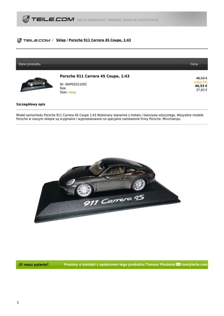 Sklep / Porsche 911 Carrera 4S Coupe, 1:43 Dane produktu Cena Porsche 911 Carrera 4S Coupe, 1:43 Nr: WAP0201100C Rok: Stan: nowy 46,53 € rabat 0% 46,53 € 37,83 € Szczegółowy opis Model samochodu Porsche 911 Carrera 4S Coupe 1:43 Wykonany starannie z metalu i tworzywa sztucznego. Wszystkie modele Porsche w naszym sklepie są oryginalne i wyprodukowane na specjalne zamówienie firmy Porsche. Minichamps. masz pytanie? 1 Prosimy o kontakt z opiekunem tego produktu: Tomasz Pluskota [email protected]