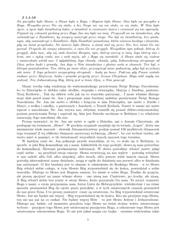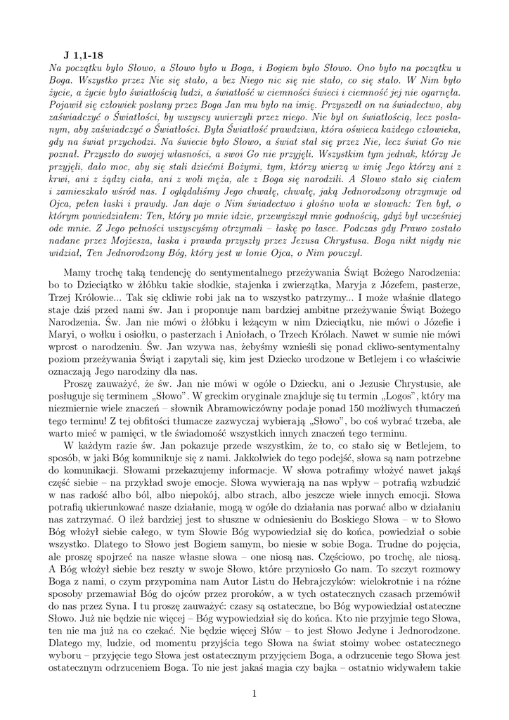 J 1,1-18 Na początku było Słowo, a Słowo było u Boga, i Bogiem było Słowo. Ono było na początku u Boga. Wszystko przez Nie się stało, a bez Niego nic się nie stało, co się stało. W Nim było życie, a życie było światłością ludzi, a światłość w ciemności świeci i ciemność jej nie ogarnęła. Pojawił się człowiek posłany przez Boga Jan mu było na imię. Przyszedł on na świadectwo, aby zaświadczyć o Światłości, by wszyscy uwierzyli przez niego. Nie był on światłością, lecz posłanym, aby zaświadczyć o Światłości. Była Światłość prawdziwa, która oświeca każdego człowieka, gdy na świat przychodzi. Na świecie było Słowo, a świat stał się przez Nie, lecz świat Go nie poznał. Przyszło do swojej własności, a swoi Go nie przyjęli. Wszystkim tym jednak, którzy Je przyjęli, dało moc, aby się stali dziećmi Bożymi, tym, którzy wierzą w imię Jego którzy ani z krwi, ani z żądzy ciała, ani z woli męża, ale z Boga się narodzili. A Słowo stało się ciałem i zamieszkało wśród nas. I oglądaliśmy Jego chwałę, chwałę, jaką Jednorodzony otrzymuje od Ojca, pełen łaski i prawdy. Jan daje o Nim świadectwo i głośno woła w słowach: Ten był, o którym powiedziałem: Ten, który po mnie idzie, przewyższył mnie godnością, gdyż był wcześniej ode mnie. Z Jego pełności wszyscyśmy otrzymali – łaskę po łasce. Podczas gdy Prawo zostało nadane przez Mojżesza, łaska i prawda przyszły przez Jezusa Chrystusa. Boga nikt nigdy nie widział, Ten Jednorodzony Bóg, który jest w łonie Ojca, o Nim pouczył. Mamy trochę taką tendencję do sentymentalnego przeżywania Świąt Bożego Narodzenia: bo to Dzieciątko w żłóbku takie słodkie, stajenka i zwierzątka, Maryja z Józefem, pasterze, Trzej Królowie... Tak się ckliwie robi jak na to wszystko patrzymy... I może właśnie dlatego staje dziś przed nami św. Jan i proponuje nam bardziej ambitne przeżywanie Świąt Bożego Narodzenia. Św. Jan nie mówi o żłóbku i leżącym w nim Dzieciątku, nie mówi o Józefie i Maryi, o wołku i osiołku, o pasterzach i Aniołach, o Trzech Królach. Nawet w sumie nie mówi wprost o narodzeniu. Św. Jan wzywa nas, żebyśmy wznieśli się ponad ckliwo-sentymentalny poziom przeżywania Świąt i zapytali się, kim jest Dziecko urodzone w Betlejem i co właściwie oznaczają Jego narodziny dla nas. Proszę zauważyć, że św. Jan nie mówi w ogóle o Dziecku, ani o Jezusie Chrystusie, ale posługuje się terminem „Słowo”. W greckim oryginale znajduje się tu termin „Logos”, który ma niezmiernie wiele znaczeń – słownik Abramowiczówny podaje ponad 150 możliwych tłumaczeń tego terminu! Z tej obfitości tłumacze zazwyczaj wybierają „Słowo”, bo coś wybrać trzeba, ale warto mieć w pamięci, w tle świadomość wszystkich innych znaczeń tego terminu. W każdym razie św. Jan pokazuje przede wszystkim, że to, co stało się w Betlejem, to sposób, w jaki Bóg komunikuje się z nami. Jakkolwiek do tego podejść, słowa są nam potrzebne do komunikacji. Słowami przekazujemy informacje. W słowa potrafimy włożyć nawet jakąś część siebie – na przykład swoje emocje. Słowa wywierają na nas wpływ – potrafią wzbudzić w nas radość albo ból, albo niepokój, albo strach, albo jeszcze wiele innych emocji. Słowa potrafią ukierunkować nasze działanie, mogą w ogóle do działania nas porwać albo w działaniu nas zatrzymać. O ileż bardziej jest to słuszne w odniesieniu do Boskiego Słowa – w to Słowo Bóg włożył siebie całego, w tym Słowie Bóg wypowiedział się do końca, powiedział o sobie wszystko. Dlatego to Słowo jest Bogiem samym, bo niesie w sobie Boga. Trudne do pojęcia, ale proszę spojrzeć na nasze własne słowa – one niosą nas. Częściowo, po trochę, ale niosą. A Bóg włożył siebie bez reszty w swoje Słowo, które przyniosło Go nam. To szczyt rozmowy Boga z nami, o czym przypomina nam Autor Listu do Hebrajczyków: wielokrotnie i na różne sposoby przemawiał Bóg do ojców przez proroków, a w tych ostatecznych czasach przemówił do nas przez Syna. I tu proszę zauważyć: czasy są ostateczne, bo Bóg wypowiedział ostateczne Słowo. Już nie będzie nic więcej – Bóg wypowiedział się do końca. Kto nie przyjmie tego Słowa, ten nie ma już na co czekać. Nie będzie więcej Słów – to jest Słowo Jedyne i Jednorodzone. Dlatego my, ludzie, od momentu przyjścia tego Słowa na świat stoimy wobec ostatecznego wyboru – przyjęcie tego Słowa jest ostatecznym przyjęciem Boga, a odrzucenie tego Słowa jest ostatecznym odrzuceniem Boga. To nie jest jakaś magia czy bajka – ostatnio widywałem takie 1 plakaty „bajeczne święta”, „magiczne święta” – to jest rzeczywistość bardziej prawdziwa od naszej, bo to rzeczywistość Boga, Jedynego który Jest i który powołuje do istnienia. I tu pojawia się kolejne przesłanie św. Jana. Owo Słowo, w które Bóg włożył całego siebie, niesie w sobie rzecz najważniejszą ze wszystkich: życie samego Boga. Niesie w sobie tchnienie życia, dzięki któremu na początku ludzie stali się istotami żyjącymi. Proszę tu zwrócić uwagę na stwierdzenie „żyjącymi”. To dzięki Bożemu tchnieniu życia, to dzięki temu że Bóg napełnił ludzi swoim własnym życiem człowiek stał się kimś „żyjącym” a nie martwym, nieożywionym. Prawdziwym Żyjącym jest Bóg – On jedyny nie potrzebuje, żeby ktoś Jemu przekazywał życie i żeby ktoś Go przy życiu utrzymywał. Człowiek żyje o tyle, o ile uczestniczy w życiu jedynego Żyjącego – wtedy również staje się żyjący, ale przez uczestnictwo. I to jest najważniejszy dar, jaki otrzymaliśmy od Boga: życie. Prawdziwe życie, które nigdy się nie kończy. Dopiero na tym darze – na darze życia, na tchnieniu życia – jest zbudowana i oparta cała reszta Bożych darów. Człowiek, który nie ma życi