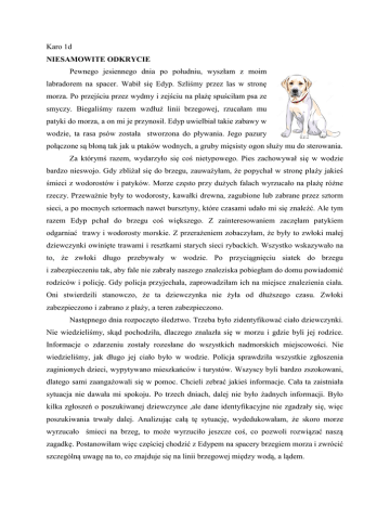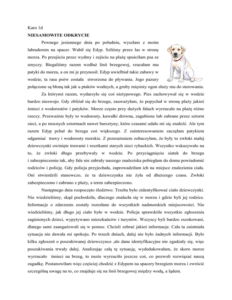 Karo 1d NIESAMOWITE ODKRYCIE Pewnego jesiennego dnia po południu, wyszłam z moim labradorem na spacer. Wabił się Edyp. Szliśmy przez las w stronę morza. Po przejściu przez wydmy i zejściu na plażę spuściłam psa ze smyczy. Biegaliśmy razem wzdłuż linii brzegowej, rzucałam mu patyki do morza, a on mi je przynosił. Edyp uwielbiał takie zabawy w wodzie, ta rasa psów została stworzona do pływania. Jego pazury połączone są błoną tak jak u ptaków wodnych, a gruby mięsisty ogon służy mu do sterowania. Za którymś razem, wydarzyło się coś nietypowego. Pies zachowywał się w wodzie bardzo nieswojo. Gdy zbliżał się do brzegu, zauważyłam, że popychał w stronę plaży jakieś śmieci z wodorostów i patyków. Morze często przy dużych falach wyrzucało na plażę różne rzeczy. Przeważnie były to wodorosty, kawałki drewna, zagubione lub zabrane przez sztorm sieci, a po mocnych sztormach nawet bursztyny, które czasami udało mi się znaleźć. Ale tym razem Edyp pchał do brzegu coś większego. Z zainteresowaniem zaczęłam patykiem odgarniać trawy i wodorosty morskie. Z przerażeniem zobaczyłam, że były to zwłoki małej dziewczynki owinięte trawami i resztkami starych sieci rybackich. Wszystko wskazywało na to, że zwłoki długo przebywały w wodzie. Po przyciągnięciu siatek do brzegu i zabezpieczeniu tak, aby fale nie zabrały naszego znaleziska pobiegłam do domu powiadomić rodziców i policję. Gdy policja przyjechała, zaprowadziłam ich na miejsce znalezienia ciała. Oni stwierdzili stanowczo, że ta dziewczynka nie żyła od dłuższego czasu. Zwłoki zabezpieczono i zabrano z plaży, a teren zabezpieczono. Następnego dnia rozpoczęto śledztwo. Trzeba było zidentyfikować ciało dziewczynki. Nie wiedzieliśmy, skąd pochodziła, dlaczego znalazła się w morzu i gdzie byli jej rodzice. Informacje o zdarzeniu zostały rozesłane do wszystkich nadmorskich miejscowości. Nie wiedzieliśmy, jak długo jej ciało było w wodzie. Policja sprawdziła wszystkie zgłoszenia zaginionych dzieci, wypytywano mieszkańców i turystów. Wszyscy byli bardzo zszokowani, dlatego sami zaangażowali się w pomoc. Chcieli zebrać jakieś informacje. Cała ta zaistniała sytuacja nie dawała mi spokoju. Po trzech dniach, dalej nie było żadnych informacji. Było kilka zgłoszeń o poszukiwanej dziewczynce ,ale dane identyfikacyjne nie zgadzały się, więc poszukiwania trwały dalej. Analizując całą tę sytuację, wydedukowałam, że skoro morze wyrzucało śmieci na brzeg, to może wyrzuciło jeszcze coś, co pozwoli rozwiązać naszą zagadkę. Postanowiłam więc częściej chodzić z Edypem na spacery brzegiem morza i zwrócić szczególną uwagę na to, co znajduje się na linii brzegowej między wodą, a lądem. W następnym tygodniu, gdy po raz kolejny byłam na plaży z moim psem, zauważyłam w pobliżu starego korzenia, wypłukanego podczas sztormu z dna morza i wyrzuconego na brzeg, kawałek kolorowego materiału. Serce mi mocno zabiło. Pomyślałam, że to może być jakiś znak. Pies zaczął się nerwowo zachowywać i razem odgarnęliśmy wodorosty. Kryła się tam torebka. Z niesamowitą ciekawością i drążącymi rękoma rozsunęłam zamek. Zobaczyłam jakieś papiery. Wyjęłam je delikatnie i zobaczyłam coś rozmazanego, ale napis nie był w języku polskim. Po kształcie i wyglądzie stwierdziłam, że to może legitymacja szkolna lub inny dokument, ale bez zdjęcia. Niestety nie było można odczytać imienia i nazwiska. Zgłosiłam to szybko na policję i dowiedziałam się, że dokument został wydany w języku szwedzkim. Po powrocie do domu zaczęłam się zastanawiać nad całym zajściem. Przypomniałam sobie o koleżance Majce, która wyjechała z rodzicami na południe Szwecji i mieszkała tam w nadmorskiej miejscowości Torhamn. Po chwili zastanowienia stwierdziłam, że nie zaszkodziło zapytać ją, czy przypadkiem nie wiedziała czegoś o zaginięciu jakiejś małej dziewczynki. Poprosiłam ją, aby popytała w szkole swoje koleżanki i kolegów. Po dwóch dniach Majka odpisała mi i przekazała informację, że około trzy tygodnie temu zaginęła mała dziewczynka o imieniu Ingrid. Mieszkała w miejscowości niedaleko od Torhamn i trwały jej poszukiwania. Prawdopodobnie fale morskie zabrały ją z plaży i utonęła, ale te informacje nie były potwierdzone. Podała mi krótki opis dziewczynki: miała blond włosy, co by się zgadzało z moim odkryciem. Natychmiast przekazałam te informacje policji i jednocześnie dowiedziałam się, że ona już wiedziała o zaginięciu dziecka w Szwecji. Musieli to sprawdzić swoimi kanałami, ale zaskoczeni byli, skąd ja o tym wiedziałam. Opowiedziałam więc im o mojej koleżance Mai. Byli bardzo zdumieni moją zaradnością i chęcią poznania prawdy. Usłyszałam słowa pochwały i propozycję podjęcia w przyszłości pracy w policji. Cała ta zaistniała sytuacja bardzo mnie zmartwiła, nieszczęście dziecka i jego rodziny na długo zostały w mojej pamięci.
