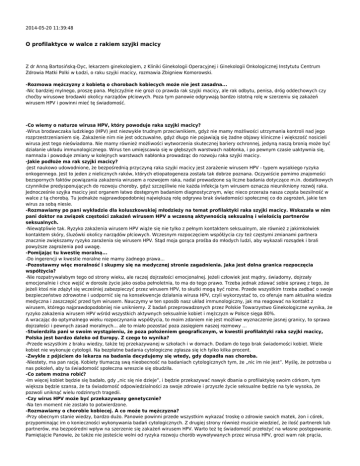 2014-05-20 11:39:48 O profilaktyce w walce z rakiem szyjki macicy Z dr Anną Bartosińską-Dyc, lekarzem ginekologiem, z Kliniki Ginekologii Operacyjnej i Ginekologii Onkologicznej Instytutu Centrum Zdrowia Matki Polki w Łodzi, o raku szyjki macicy, rozmawia Zbigniew Komorowski. -Rozmowa mężczyzny z kobietą o chorobach kobiecych może nie jest zasadna... -Nic bardziej mylnego, proszę pana. Mężczyźnie nie grozi co prawda rak szyjki macicy, ale rak odbytu, penisa, dróg oddechowych czy choćby wirusowe brodawki okolicy narządów płciowych. Poza tym panowie odgrywają bardzo istotną rolę w szerzeniu się zakażeń wirusem HPV i powinni mieć tę świadomość. -Co wiemy o naturze wirusa HPV, który powoduje raka szyjki macicy? -Wirus brodawczaka ludzkiego (HPV) jest niezwykle trudnym przeciwnikiem, gdyż nie mamy możliwości utrzymania kontroli nad jego rozprzestrzenianiem się. Zakażenie nim nie jest odczuwalne, gdyż długo nie pojawiają się żadne objawy kliniczne i większość nosicieli wirusa jest tego nieświadoma. Nie mamy również możliwości wytworzenia skutecznej bariery ochronnej, jedyną naszą bronią może być działanie układu immunologicznego. Wirus ten umiejscawia się w głębszych warstwach nabłonka, i po pewnym czasie uaktywnia się, namnaża i powoduje zmiany w kolejnych warstwach nabłonka prowadząc do rozwoju raka szyjki macicy. -Jakie podłoże ma rak szyjki macicy? -Jest naukowo udowodnione, że bezpośrednią przyczyną raka szyjki macicy jest zarażenie wirusem HPV - typem wysokiego ryzyka onkogennego. Jest to jeden z nielicznych raków, których etiopatogeneza została tak dobrze poznana. Oczywiście pomimo znajomości bezspornych faktów powiązania zakażenia wirusem a rozwojem raka, nadal prowadzone są liczne badania dotyczące m.in. dodatkowych czynników predysponujących do rozwoju choroby, gdyż szczęśliwie nie każda infekcja tym wirusem oznacza nieunikniony rozwój raka. Jednocześnie szyjka macicy jest organem łatwo dostępnym badaniom diagnostycznym, więc nieco przeraża nasza częsta bezsilność w walce z tą chorobą. Tu jednakże najprawdopodobniej największą rolę odgrywa brak świadomości społecznej co do zagrożeń, jakie ten wirus za sobą niesie. -Rozmawiamy po pani wykładzie dla koluszkowskiej młodzieży na temat profilaktyki raka szyjki macicy. Wskazała w nim pani doktor na związek częstości zakażeń wirusem HPV a wczesną aktywnością seksualną i wielością partnerów seksualnych. -Niewątpliwie tak. Ryzyko zakażenia wirusem HPV wiąże się nie tylko z pełnym kontaktem seksualnym, ale również z jakimkolwiek kontaktem skóry, śluzówki okolicy narządów płciowych. Wczesnym rozpoczęciem współżycia czy też częstymi zmianami partnera znacznie zwiększamy ryzyko zarażenia się wirusem HPV. Stąd moja gorąca prośba do młodych ludzi, aby wykazali rozsądek i brali powyższe zagrożenia pod uwagę. -Pomijając tu kwestię moralną... -Do ingerencji w kwestie moralne nie mamy żadnego prawa... -Pozostawmy więc moralność i skupmy się na medycznej stronie zagadnienia. Jaka jest dolna granica rozpoczęcia współżycia? -Nie rozpatrywałabym tego od strony wieku, ale raczej dojrzałości emocjonalnej. Jeżeli człowiek jest mądry, świadomy, dojrzały emocjonalnie i chce wejść w dorosłe życie jako osoba pełnoletnia, to ma do tego prawo. Trzeba jednak zdawać sobie sprawę z tego, że jeżeli ktoś nie zdążył się wcześniej zabezpieczyć przez wirusem HPV, to skutki mogą być rożne. Przede wszystkim trzeba zadbać o swoje bezpieczeństwo zdrowotne i uodpornić się na konsekwencje działania wirusa HPV, czyli wykorzystać to, co oferuje nam aktualna wiedza medyczna i zaszczepić przed tym wirusem. Nauczymy w ten sposób nasz układ immunologiczny, jak ma reagować na kontakt z wirusem, którego najprawdopodobniej nie unikniemy. Z badań przeprowadzonych przez Polskie Towarzystwo Ginekologiczne wynika, że ryzyko zakażenia wirusem HPV wśród wszystkich aktywnych seksualnie kobiet i mężczyzn w Polsce sięga 80%. A wracając do optymalnego wieku rozpoczynania współżycia, to moim zdaniem nie jest możliwe wyznaczenie jasnej granicy, to sprawa dojrzałości i pewnych zasad moralnych… ale to miało pozostać poza zasięgiem naszej rozmowy … -Stwierdziła pani w swoim wystąpieniu, że poza położeniem geograficznym, w kwestii profilaktyki raka szyjki macicy, Polska jest bardzo daleko od Europy. Z czego to wynika? -Przede wszystkim z braku wiedzy, także tej przekazywanej w szkołach i w domach. Dodam do tego brak świadomości kobiet. Wiele kobiet nie wykonuje cytologii. Na bezpłatne badania cytologiczne zgłasza się ich tylko kilka procent. -Zwykle z pójściem do lekarza na badania decydujemy się wtedy, gdy dopadła nas choroba. -Niestety, ma pan rację. Kobiety tłumaczą swą nieobecność na badaniach cytologicznych tym, że „nic im nie jest”. Myślę, że potrzeba u nas pokoleń, aby ta świadomość społeczna wreszcie się obudziła. -Co zatem można robić? -Im więcej kobiet będzie się badało, gdy „nic się nie dzieje”, i będzie przekazywać nawyk dbania o profilaktykę swoim córkom, tym większa będzie szansa, że ta świadomość odpowiedzialności za swoje zdrowie i przyszłe życie seksualne będzie na tyle wysoka, że pozwoli uniknąć wielu rodzinnych tragedii. -Czy wirus HPV może być przekazywany genetycznie? -Na ten moment nie zostało to potwierdzone. -Rozmawiamy o chorobie kobiecej. A co może tu mężczyzna? -Przy obecnym stanie wiedzy, bardzo dużo. Panowie powinni przede wszystkim wykazać troskę o zdrowie swoich matek, żon i córek, przypominając im o konieczności wykonywania badań cytologicznych. Z drugiej strony również musicie wiedzieć, że ilość partnerek lub partnerów, ma bezpośredni wpływ na szerzenie się zakażeń wirusem HPV. Warto też tę świadomość przełożyć na własne postępowanie. Pamiętajcie Pan
