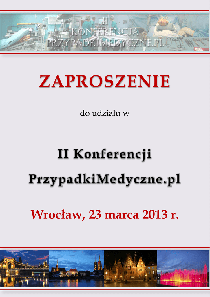 ZAPROSZENIE do udziału w II Konferencji PrzypadkiMedyczne.pl Wrocław, 23 marca 2013 r. Szanowni Państwo, w imieniu Komitetu Organizacyjnego pragniemy zaprosić do udziału w II Konferencji PrzypadkiMedyczne.Pl. Kolejna edycja ogólnopolskiej imprezy naukowej cieszącej się dużą popularnością odbędzie się 23 marca 2013 roku we Wrocławiu. Konferencja ma szczególną rangę ponieważ stanowi publikację wiedzy znamienitych specjalistów i autorytetów z zabiegowych dziedzin medycyny. Wyjątkowy wymiar podkreśla miejsce jej organizacji – Wrocław, stolica malowniczego Dolnego Śląska, jedno z najpiękniejszych miast Europy. O Konferencji: II Konferencja PrzypadkiMedyczne.pl jest kontynuacją I edycji z 2011 roku, która zakończyła się dużym sukcesem i zebrała bardzo dobre opinie. Wspomniana edycja została zainaugurowana przez prof. Marię Siemionow (USA, przeszczep twarzy w 2008 r.), na sali obecnych było 800 uczestników, a kolejne 300 osób obserwowało obrady przez transmisję video on-line. Podobnej frekwencji spodziewamy się w obecnej edycji. Podczas najbliższej konferencji wykład inauguracyjny poprowadzi prof. Grzegorz H. Bręborowicz, uznany ginekolog i położnik, były Rektor Uniwersytetu Medycznego w Poznaniu, autor wielu publikacji i książek o tematyce zabiegowo-ginekologicznej. Jako wykładowcy, zaproszeni zostali także prof. Wojciech Witkiewicz (Dyrektor Wojewódzkiego Szpitala Specjalistycznego we Wrocławiu, konsultant woj. Dolnośląskiego z chirurgii naczyniowej, członek zespołu operacyjnego wykorzystującego Robota Da Vinci), prof. Wojciech Młynarski (Kierownik Katedry i Kliniki Hematologii, Onkologii i Diabetologii Dziecięcej, UM Łódź), prof. Dariusz Patrzałek (konsultant woj. Dolnośląskiego i Opolskiego transplantologii klinicznej), prof. Jan Kulig (Kierownik I Katedry Chirurgii Ogólnej Wydziału Lekarskiego CM UJ), prof. Jerzy Kołodziej (torakochirurgia, Wrocław), dr hab. Damian Czyżewski (torakochirurgia, Zabrze), dr Jakub Trnka (medycyna sądowa, Wrocław), dr Krzysztof Ficek (ortopedia i traumatologia, oraz medycyna sportowa, Bieruń). Planujemy zaproszenie w sumie 12 prelegentów, dobierając ich w sposób zapewniający tej edycji charakter chirurgiczny. Posiadając bogate doświadczenie w organizacji wysoko ocenianych ogólnopolskich i międzynarodowych sympozjów dla lekarzy, pragniemy zapewnić Państwa że dołożymy wszelkich starań aby uczestnicy podczas Konferencji znaleźli odpowiedni klimat, sprzyjający spotkaniom naukowym, edukacyjnym i towarzyskim. Obrady odbędą się w Centrum NaukowoDydaktycznym Uniwersytetu Przyrodnieczego przy Placu Grunwaldzkim 24A, usytuowanym niedaleko Starówki i Rynku we Wrocławiu. Będziemy zaszczyceni, jeśli zechcą Państwo wziąć udział w tak ważnym wydarzeniu. Przewodniczący Komitetu Organizacyjnego www.PrzypadkiMedyczne.pl/Konferencja.html 2 Ra mo wy pla n k on feren cji | | || | | || | ||| 9:00 otwarcie Konferencji (Przewodniczący Komitetu Organizacyjnego) 9:05 rozpoczęcie obrad (Przewodniczący Komitetu Naukowego) SESJA A 9:10 wystąpienie sponsora 9:20 prof. Grzegorz H. Bręborowicz (Ginekologia, Poznań) 9:50 prof. Dariusz Patrzałek (Transplantologia, Wrocław) 10:10 prof. Wojciech Młynarski (Hematologia, Onkologia i Diabetologia, Łódź) 10:40 przerwa kawowa SESJA B 10:55 wystąpienie sponsora 11:00 prof. Jan Kulig (Chirurgia onkologiczna, Kraków) 11:30 dr Jakub Trnka (Medycyna Sądowa, Wrocław) 12:00 prof. Jerzy Kołodziej (Torakochirurgia, Wrocław) 12:30 P R Z E R W A O B I A D O W A SESJA C 14:00 dr Krzysztof Ficek (Ortopedia i Traumatoligia, Medycyna Sportowa, Bieruń) 14:20 dr. hab. Damian Czyżewski (Torakochirurgia, Zabrze) 14:50 prof. Wojciech Witkiewicz (Chirurgia naczyniowa, Wrocław) 15:15 przerwa kawowa SESJA D 15:30 prelegenci (urologia, chirurgia gastroenterologiczna, medycyna ratunkowa)* 16:45 zakończenie konferencji *lista prelegentów jest aktualizowana na bieżąco, www.PrzypadkiMedyczne.pl/Konferencja.html 3 O płat y zjazd owe ||| | | || | ||| | | || | ||| | Koszt opłaty zjadowej dla uczestników Konferencji wyniesie 39pln - płatne w terminie do dnia 28.02.2013r. Po tym terminie koszt opłaty zjadowej wzrośnie do 49pln. Opłata zjazdowa obejmuje: Pełne uczestnictwo w Konferencji i korzystania z wszystkich przewidzianych sesji, Materiały zjazdowe – torba lub teczka, konferencyjną edycję Czasopisma PrzypadkiMedyczne.pl, materiały piśmienne, program, insert dostarczony przez firmy, Przerwę kawową, Lunch (w przypadku dostępnych na to funduszy). Osoba odpowiedzialna za kontakt z mediami: Mateusz Stolarz Tel.: 500 79 30 30 e-mail: [email protected] Przewodniczący Komitetu Organizacyjnego: Mateusz Palczewski Tel.: 503 77 32 14 e-mail: [email protected] C OMV ID EO Ul. Karpacka 18A 54-617 Wrocław Tel./fax. +48 (71) 357 46 79 www.PrzypadkiMedyczne.pl/Konferencja.html 4