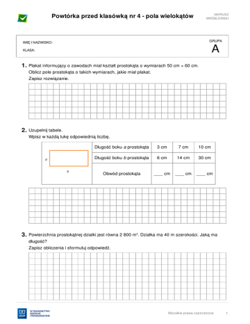 Powtórka przed klasówką nr 4 - pola wielokątów MARIUSZ WRÓBLEWSKI GRUPA IMIĘ I NAZWISKO: A KLASA: 1. Plakat informujący o zawodach miał kształt prostokąta o wymiarach 50 cm × 60 cm. Oblicz pole prostokąta o takich wymiarach, jakie miał plakat. Zapisz rozwiązanie. 2. Uzupełnij tabele. Wpisz w każdą lukę odpowiednią liczbę. 3. Długość boku a prostokąta 3 cm 7 cm 10 cm Długość boku b prostokąta 6 cm 14 cm 30 cm Obwód prostokąta ____ cm ____ cm ____ cm Powierzchnia prostokątnej działki jest równa 2 800 m 2. Działka ma 40 m szerokości. Jaką ma długość? Zapisz obliczenia i sformułuj odpowiedź. Wszelkie prawa zastrzeżone 1 4. Alicja narysowała w zeszycie romb. Suma długości przekątnych tego rombu wynosi 13 cm. Jedna przekątna jest o 5 cm dłuższa od drugiej. Zaznacz poprawną odpowiedź i jej uzasadnienie. Ile wynosi pole narysowanego przez dziewczynkę rombu? A 18 cm 2, C jego przekątne mają długość 5 cm i 8 cm. D jego przekątne mają długość 4 cm i 9 cm. ponieważ B 5. 36 cm 2, Zmierz długość każdego odcinka i wpisz w lukę wynik pomiaru w centymetrach. ____ cm A. ____ cm B. 6. Oceń prawdziwość każdego zdania. Zaznacz P, jeśli zdanie jest prawdziwe, lub F, jeśli jest fałszywe. A. Działka ma pole powierzchni równe 3 ha, czyli 30 a. P F B. Pole kwadratu jest równe 5 cm 2, czyli 500 mm 2. P F Wszelkie prawa zastrzeżone 2 7. Plan mieszkania państwa Nowaków Odczytaj z planu wymiary kuchni i oblicz jej powierzchnię. Zapisz rozwiązanie. 8. Sześciokąt przedstawiony na rysunku zbudowano z trzech jednakowych kwadratów. Obwód tego sześciokąta jest równy 48 cm. Zaznacz poprawną odpowiedź i jej uzasadnienie. Ile wynosi obwód jednego z kwadratów, z których zbudowano sześciokąt? A Obwód kwadratu wynosi 32 cm, C długość boku kwadratu jest sześć razy mniejsza od obwodu sześciokąta ponieważ B 9. Obwód kwadratu wynosi 24 cm, D długość boku kwadratu jest osiem razy mniejsza od obwodu sześciokąta Zaznacz poprawne dokończenie zdania. Pole prostokąta jest równe 700 cm 2, czyli A. 7 mm 2 B. 70 mm 2 C. 7 000 mm 2 D. 70 000 mm 2 Wszelkie prawa zastrzeżone 3 10. Ogródek Stasia ma kształt trójkąta. Plan ogródka Stasia przedstawiono na rysunku poniżej. Zaznacz poprawne dokończenie zdania. Pole ogródka Stasia jest równe A. 4 m 2 B. 6 m 2 C. 7 m 2 D. 12 m 2 11. Zaznacz wszystkie poprawne dokończenia zdania. Pole prostokąta jest równe 700 cm 2, czyli A. 7 000 mm 2 B. 70 000 mm 2 C. 7 dm 2 D. 70 dm 2 E. 7 m 2 F. 0,7 m 2 G. 0,07 m 2 12. Rolnik obsiał pszenicą swego 25-hektarowego pola. Część pola obsiana pszenicą ma kształt prostokąta. Długość jednego z boków tego prostokąta jest równa 300 m. Jaką długość ma drugi bok tego prostokąta? Zapisz rozwiązanie. Wszelkie prawa zastrzeżone 4 13. Obwód prostokąta wynosi 30 cm, a jeden z boków ma długość 6 cm. Oblicz długość drugiego boku prostokąta. Zapisz rozwiązanie. 14. Oceń prawdziwość każdego zdania. Zaznacz P, jeśli zdanie jest prawdziwe, lub F, jeśli jest fałszywe. A. Działka ma pole powierzchni równe 35 a, czyli 0,35 ha. P F B. Pole kwadratu jest równe 5 cm 2, czyli 0,5 dm 2. P F 15. Zaznacz poprawną odpowiedź. Pole której figury można obliczyć za pomocą wyrażenia A. B. C. D. ? 16. Kształt ekranu telewizora Jowisz 04 był zbliżony do prostokąta o wymiarach 320 mm × 240 mm. Zaznacz poprawne dokończenie zdania. Obwód prostokąta o takich wymiarach jest równy A. 560 mm B. 1120 mm C. 7680 mm D. 76 800 mm Wszelkie prawa zastrzeżone 5 17. Zamień na centymetry kwadratowe. Wpisz w każdą lukę odpowiednią liczbę. 50 mm 2 = ________ cm 2 2 730 mm 2 = ________ cm 2 6,2 dm 2 = ________ cm 2 3,45 m 2 = ________ cm 2 18. Ogródek pani Alicji ma kształt prostokąta. Został podzielony na 5 grządek. Poniżej przedstawiono plan tego ogródka. Oblicz pole powierzchni grządki marchwi. Zapisz rozwiązanie. Wszelkie prawa zastrzeżone 6 19. Oblicz obwód trójkąta, którego każdy bok jest o 2 cm dłuższy od odpowiedniego boku trójkąta przedstawionego na rysunku. Zapisz obliczenia i sformułuj odpowiedź. 20. Powierzchnia prostokątnej działki jest równa 8 arów. Działka ma 16 m szerokości. Jaką ma długość? Zapisz obliczenia i sformułuj odpowiedź. Wszelkie prawa zastrzeżone 7 21. Ośmiokąt przedstawiony na rysunku zbudowano z trzech różnych kwadratów. Obwód tego ośmiokąta wynosi 72 cm. Wiadomo, że bok najmniejszego kwadratu jest dwa razy krótszy od boku kwadratu średniego i trzy razy krótszy od boku kwadratu największego. Ile wynosi obwód najmniejszego kwadratu? A 36 cm, C długość boku tego kwadratu jest osiem razy mniejsza od obwodu ośmiokąta. ponieważ B 16 cm, D długość boku tego kwadratu jest osiemnaście razy mniejsza od obwodu ośmiokąta. 22. Ogródek pani Renaty ma kształt prostokąta. Został podzielony na 7 grządek. Poniżej przedstawiono plan tego ogródka. Zaznacz poprawną odpowiedź. Ile m 2 ma pole powierzchni grządek rzodkiewki, ziół i grochu? A. 2 B. 4 C. 8 D. 16 Wszelkie prawa zastrzeżone 8 23. Powierzchnia prostokątnej działki jest równa 1,2 hektarów. Działka ma 60 m szerokości. Jaką ma długość? Zapisz obliczenia i sformułuj odpowiedź. 24. Oceń prawdziwość każdego zdania. Wpisz P, jeśli zdanie jest prawdziwe, lub F, jeśli jest fałszywe A. Obwód obrazka jest równy 88 cm. B. Długość jednego dłuższego boku obrazka stanowi obwodu. P F P F 25. Ogródek pana Adama ma kształt prostokąta o długości 24 m i szerokości 20 m. Grządka ziemniaków zajmuje ogródka pana Adama. Zaznacz poprawną odpowiedź. Ile m 2 ma pole powierzchni grządki ziemniaków? A. 120 m 2 B. 240 m 2 C. 360 m 2 D. 480 m 2 26. Oceń prawdziwość każdego zdania. Zaznacz P, jeśli zdanie jest prawdziwe, lub F, jeśli jest fałszywe. A. Działka ma pole powierzchni równe 6,5 ha, czyli 0,065 km 2. P F B. Pole kwadratu jest równe 0,7 dm 2, czyli 0,07 m 2. P F Wsze