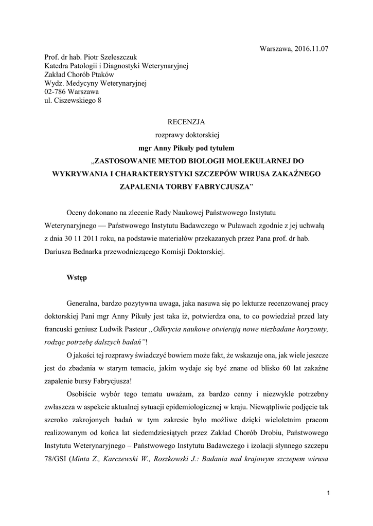 Warszawa, 2016.11.07 Prof. dr hab. Piotr Szeleszczuk Katedra Patologii i Diagnostyki Weterynaryjnej Zakład Chorób Ptaków Wydz. Medycyny Weterynaryjnej 02-786 Warszawa ul. Ciszewskiego 8 RECENZJA rozprawy doktorskiej mgr Anny Pikuły pod tytułem „ZASTOSOWANIE METOD BIOLOGII MOLEKULARNEJ DO WYKRYWANIA I CHARAKTERYSTYKI SZCZEPÓW WIRUSA ZAKAŹNEGO ZAPALENIA TORBY FABRYCJUSZA” Oceny dokonano na zlecenie Rady Naukowej Państwowego Instytutu Weterynaryjnego — Państwowego Instytutu Badawczego w Puławach zgodnie z jej uchwałą z dnia 30 11 2011 roku, na podstawie materiałów przekazanych przez Pana prof. dr hab. Dariusza Bednarka przewodniczącego Komisji Doktorskiej. Wstęp Generalna, bardzo pozytywna uwaga, jaka nasuwa się po lekturze recenzowanej pracy doktorskiej Pani mgr Anny Pikuły jest taka iż, potwierdza ona, to co powiedział przed laty francuski geniusz Ludwik Pasteur „Odkrycia naukowe otwierają nowe niezbadane horyzonty, rodząc potrzebę dalszych badań”! O jakości tej rozprawy świadczyć bowiem może fakt, że wskazuje ona, jak wiele jeszcze jest do zbadania w starym temacie, jakim wydaje się być znane od blisko 60 lat zakaźne zapalenie bursy Fabrycjusza! Osobiście wybór tego tematu uważam, za bardzo cenny i niezwykle potrzebny zwłaszcza w aspekcie aktualnej sytuacji epidemiologicznej w kraju. Niewątpliwie podjęcie tak szeroko zakrojonych badań w tym zakresie było możliwe dzięki wieloletnim pracom realizowanym od końca lat siedemdziesiątych przez Zakład Chorób Drobiu, Państwowego Instytutu Weterynaryjnego – Państwowego Instytutu Badawczego i izolacji słynnego szczepu 78/GSI (Minta Z., Karczewski W., Roszkowski J.: Badania nad krajowym szczepem wirusa 1 choroby Gumboro. Medycyna Wet. 38, 34, 1982), który jest pierwszym na liście izolatów wirusa charakteryzowanych przez Doktorantkę. Z ogólnobiologicznego punktu widzenia należy podkreślić, że IBD jest pierwszą opisaną w weterynarii chorobą immunosupresyjną. Wirus zakaźnego zapalenia bursy (torby) Fabrycjusza (choroby Gumboro, Infectious Bursal Disease – IBD) należy do rodziny Birnaviridae, rodzaju Avibirnavirus, a jego genom złożony jest z dwóch segmentów dwuniciowego RNA. W porównaniu z innymi patogennymi dla drobiu zarazkami, jest to wirus stosunkowo stabilny, występują bowiem tylko dwa serotypy IBDV, choć w obrębie serotypu 1 mamy szczepy klasyczne i szczepy wariantowe. Bez wątpienia choroba Gumboro jest jednym z problemów zdrowotnych bez próby opanowania, którego intensywna produkcja drobiarska nie mogłaby się rozwijać, stąd ważność podjętych przez Panią Magister badań. Ocena pracy doktorskiej Przedstawiona do oceny praca doktorska „Zastosowanie metod biologii molekularnej do wykrywania i charakterystyki szczepów wirusa zakaźnego zapalenia torby Fabrycjusza” została wykonana w Zakładzie Chorób Drobiu Państwowego Instytutu Weterynaryjnego — Państwowego Instytutu Badawczego w Puławach pod kierunkiem prof. dr hab. Zenona Minty. Odnotować należy, że o wysoki poziom merytoryczny rozprawy dbał także dr hab. Krzysztof Śmietanka, prof. nadzw. PIWet – promotor pomocniczy. Dysertacja posiada układ typowy dla opracowań na stopień naukowy i zawarta jest na 142 stronach uwzględniających 22 tabele, 38 rycin (w tym 13 kolorowych fotografii klinicznych) oraz podzielona jest na następujące rozdziały: wstęp, cel, materiał i metody, wyniki, omówienie wyników i dyskusja, wnioski, streszczenie, summary oraz piśmiennictwo. Szata edytorska ocenianej rozprawy jest staranna i estetyczna, zawiera ona dobrej jakości oryginalne fotografie zarówno makro jak i mikroskopowe. Ogólne wrażenie z lektury dysertacji jest bardzo pozytywne i można z pełnym przekonaniem stwierdzić, że recenzowana praca doktorska Pani mgr Anny Pikuły napisana jest poprawnym językiem, spełnia wymogi merytoryczne i formalne stawiane opracowaniom na stopień naukowy doktora. Bardzo bogate i prawidłowo używane w tekście opracowania nazewnictwo fachowe świadczy o dobrym przygotowaniu merytorycznym Doktorantki. Dotyczy to szczególnie części poświęconej badaniom molekularnym i analizie uzyskanych wyników. Na korzyść Doktorantki przemawia i to, że stara się przybliżyć zrozumienie wykonywanych badań opisując krótko i przystępnie zasady stosowanych metodyk. Oczywiście w tak obszernym i obejmującym wiele bardzo specjalistycznych obszarów opracowaniu trudno nie popełnić drobnych nieścisłości i pewnych 2 niezręczności językowych, które zaznaczono w tekście. Jako przykład można podać użycie przymiotnika „najlepszego” do opisu rozwoju bursy Fabrycjusza (str. 84; 6 wiersz od góry) czy użycie określenia „ w hodowli” zamiast „w chowie”(str.8, 15 wiersz od dołu strony) lub „rasy kurcząt brojlerów” (str.97, 14 wiersz od góry). Zdanie „Podobne obserwacje uzyskali Chui i Thorsen” (str.10, 7 wiersz od pierwszego akapitu) lepiej brzmi w wersji „podobne obserwacje poczynili Chui i Thorsen”. Ponadto bardzo nieliczne literówki zaznaczono w tekście pracy. Cytowane w pracy doktorskiej, wydawałoby się bardzo obszerne, piśmiennictwo zamykające się liczbą 225 publikacji jest w istocie wyborem bardzo starannie wyselekcjonowanych pozycji literaturowych poświęconych chorobie Gumboro. Dobór piśmiennictwa wskazuje na pełną dojrzałość naukową i umiejętność wyboru bardzo bogatej w tym zakresie literatury źródłowej. Podkreślić należy, że Autorka równie starannie wyselekcjonowała pozycje piśmiennictwa krajowego wybierając 18 najbardziej reprezentatywnych prac. Ze względów emocjonalnych pozwolę sobie przypomnieć o jeszcze dwóch pracach, które nie zostały uwzględnione przez Panią Magister bowiem powstały w czasach przed elektroniczną rejestracją dorobku naukowego i nie są łatwo dostępne w obiegu bibliotecznym, a zasługują na wyróżnienie, bowiem potwierdziły wzrost epidemiologicznego