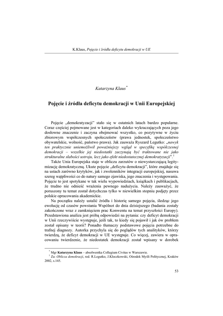 K.Klaus, Pojęcie i źródła deficytu demokracji w UE Katarzyna Klaus * Pojęcie i źródła deficytu demokracji w Unii Europejskiej Pojęcie „demokratyzacji” stało się w ostatnich latach bardzo popularne. Coraz częściej pojmowane jest w kategoriach daleko wykraczających poza jego dosłowne znaczenie i zaczyna obejmować wszystko, co pozytywne w życiu zbiorowym współczesnych społeczeństw (prawa jednostek, społeczeństwo obywatelskie, wolność, państwo prawa). Jak zauważa Ryszard Legutko: „nawyk ten praktycznie uniemożliwił poważniejszy wgląd w specyfikę współczesnej demokracji – wszelkie jej niedostatki zaczynają być traktowane nie jako strukturalne słabości ustroju, lecz jako efekt niedostatecznej demokratyzacji”. 1 Także Unia Europejska staje w obliczu zarzutów o niewystarczającą legitymizację demokratyczną. Ukute pojęcie „deficytu demokracji”, które znajduje się na ustach zarówno krytyków, jak i zwolenników integracji europejskiej, nasuwa szereg wątpliwości co do natury samego zjawiska, jego znaczenia i występowania. Pojęcie to jest spotykane w tak wielu wypowiedziach, książkach i publikacjach, że trudno nie odnieść wrażenia pewnego nadużycia. Należy zauważyć, że poruszony tu temat został dotychczas tylko w niewielkim stopniu podjęty przez polskie opracowania akademickie. Na początku należy ustalić źródła i historię samego pojęcia, śledząc jego ewolucję od czasów powstania Wspólnot do dnia dzisiejszego (badania zostały zakończone wraz z zamknięciem prac Konwentu na temat przyszłości Europy). Przedstawiona analiza jest próbą odpowiedzi na pytania: czy deficyt demokracji w Unii rzeczywiście występuje, jeśli tak, to kiedy się pojawił i jak ów problem został opisany w teorii? Ponadto tłumaczy podstawowe pojęcia potrzebne do trafnej diagnozy. Autorka przychyla się do poglądów tych analityków, którzy twierdzą, że deficyt demokracji w UE występuje. Co więcej, zawiera w opracowaniu twierdzenie, że niedostatek demokracji został wpisany w dorobek * Mgr Katarzyna Klaus – absolwentka Collegium Civitas w Warszawie. Za: Oblicza demokracji, red. R.Legutko, J.Kloczkowski, Ośrodek Myśli Politycznej, Kraków 2002, s.145. 1 53 Studia Europejskie, 2/2004 wspólnotowy przez samych Ojców Europy, tym samym stanowiąc jego immanentną część. 1. Genealogia deficytu demokracji we Wspólnotach 1.1. Zalążek przyszłego kryzysu Architekci integracji europejskiej pokładali wiele nadziei w projekcie Wspólnot, który miał na celu przezwyciężyć wrogość i ksenofobię rozdzierającą kontynent w pierwszej połowie XX wieku. Celem było budowanie wspólnej przyszłości w warunkach pokoju i bezpieczeństwa, opartej na pokrewieństwie losów jako czynniku integrującym. Inną przesłanką zbliżającą państwa Europy Zachodniej był strach przed ekspansywnym komunizmem na wschodzie Europy. Warunkiem wstąpienia do Wspólnot stały się demokratyczne rządy prawa. Jednak Ojcowie Europy większą wagę przywiązywali do efektywnego rozwiązywania problemów WE niż do ich demokratycznego charakteru. Potwierdza to elitarny i technokratyczny charakter Europejskiej Wspólnoty Węgla i Stali (EWWiS) ustanowionej Traktatem Paryskim z 18 kwietnia 1951 r. 2 EWWiS zbudowana została na neofunkcjonalnym modelu integracji, 3 zakładającym współpracę ekspertów i grup interesu w celu stworzenia ponadnarodowych koalicji wspierających polityki wspólnotowe, które miały przewyższać swoją efektywnością działania na poziomie narodowym. Prototyp Wspólnot Europejskich, jakim była EWWiS, miał wbudowaną w swój ład instytucjonalny kontrolę parlamentarną. Zgromadzenie Parlamentarne było jednak celowo umieszczone na peryferiach procesu podejmowania decyzji, a jego wpływy ograniczono do minimum. 4 Rolę ciała ustawodawczego objęła Rada Ministrów oparta na legitymizacji pośredniej (wypływającej z narodowego porządku demokratycznego) i na legitymizacji technokratycznej (podejmowanie przez ekspertów efektywnych decyzji prowadzących do rozwoju gospodarczego państw członkowskich). Na tym etapie integracji legitymizacja demokratyczna 2 Notabene sam projekt EWWiS powstał w zaciszu domu przy ulicy Martignac w Paryżu w gronie wąskiej grupy specjalistów, na czele której stał Jean Monnet. O powstającym szkicu Wspólnoty nie wiedział nawet rząd francuski. Patrz szerzej: R.Schuman, Dla Europy, Znak, Kraków 2003. 3 S.Konopacki, Neofunkcjonalistyczna teoria integracji politycznej Ernesta Haasa i Leona Lindberga, „Studia Europejskie”, nr 3/1998, s.105-115. 4 Minimalna rola Zgromadzenia Parlamentarnego zapisana w Traktacie Paryskim została powielona w Traktatach Rzymskich powołujących do życia w 1957 r. Europejską Wspólnotę Gospodarczą i Euratom. Początkowo w procesie podejmowania decyzji Zgromadzenie (od 1962 r. Parlament Europejski) miało mieć tylko rolę konsultanta, dopiero z czasem wywalczyło sobie np. kompetencje budżetowe – szerzej: D.Judge, D.Earnshaw, The European Parliament, Palgrave, Houdmills 2003. 54 K.Klaus, Pojęcie i źródła deficytu demokracji w UE nie zajmowała priorytetowego miejsca w dyskusjach nad strukturą instytucjonalną i polityczną Wspólnot. Ponadto, ponadnarodowe organy przełamały tradycyjną spójność legitymizacji i demokracji. We WE instytucje posiadały legitymizację, ale nie było nad nimi demokratycznej kontroli, takiej jak w państwach członkowskich. W związku z tym deficyt demokracji 5 został niejako wpisany w istotę WE, zanim one nawet powstały. Postrzegane to było jako konieczne poświęcenie w imię efektywności ponadnarodowego podejmowania decyzji. Prawdopodobnie, gdyby nie elitarno-technokratyczny charakter integracji lat 50., pojednanie powojennej Europy byłoby niemożliwe. Pierwsze dziesięciolecia integracji opierały się na „metodzie Monneta”, polegającej na stopniowej integracji, petits pas (małymi kroczk