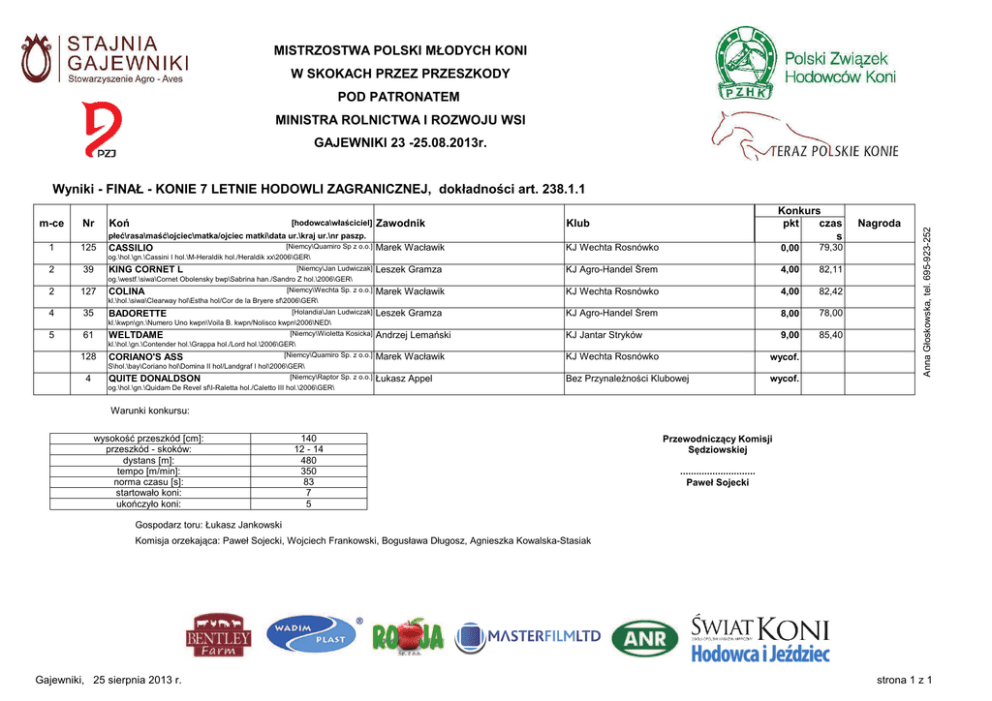 MISTRZOSTWA POLSKI MŁODYCH KONI W SKOKACH PRZEZ PRZESZKODY POD PATRONATEM MINISTRA ROLNICTWA I ROZWOJU WSI GAJEWNIKI 23 -25.08.2013r. m-ce Nr Koń [hodowca\właściciel] Konkurs pkt czas s Zawodnik Klub Marek Wacławik KJ Wechta Rosnówko 0,00 79,30 Leszek Gramza KJ Agro-Handel Śrem 4,00 82,11 Marek Wacławik KJ Wechta Rosnówko 4,00 82,42 Leszek Gramza KJ Agro-Handel Śrem 8,00 78,00 Andrzej Lemański KJ Jantar Stryków 9,00 85,40 Marek Wacławik KJ Wechta Rosnówko wycof. Łukasz Appel Bez Przynależności Klubowej wycof. płeć\rasa\maść\ojciec\matka/ojciec matki\data ur.\kraj ur.\nr paszp. 1 125 CASSILIO [Niemcy\Quamiro Sp z o.o.] og.\hol.\gn.\Cassini I hol.\M-Heraldik hol./Heraldik xx\2006\GER\ 2 39 [Niemcy\Jan Ludwiczak] KING CORNET L og.\westf.\siwa\Cornet Obolensky bwp\Sabrina han./Sandro Z hol.\2006\GER\ 2 127 COLINA [Niemcy\Wechta Sp. z o.o.] kl.\hol.\siwa\Clearway hol\Estha hol/Cor de la Bryere sf\2006\GER\ 4 35 BADORETTE [Holandia\Jan Ludwiczak] kl.\kwpn\gn.\Numero Uno kwpn\Voila B. kwpn/Nolisco kwpn\2006\NED\ 5 61 WELTDAME [Niemcy\Wioletta Kosicka] kl.\hol.\gn.\Contender hol.\Grappa hol./Lord hol.\2006\GER\ 128 CORIANO'S ASS [Niemcy\Quamiro Sp. z o.o.] S\hol.\bay\Coriano hol\Domina II hol/Landgraf I hol\2006\GER\ 4 QUITE DONALDSON [Niemcy\Raptor Sp. z o.o.] Nagroda Anna Głoskowska, tel. 695-923-252 Wyniki - FINAŁ - KONIE 7 LETNIE HODOWLI ZAGRANICZNEJ, dokładności art. 238.1.1 og.\hol.\gn.\Quidam De Revel sf\I-Raletta hol./Caletto III hol.\2006\GER\ Warunki konkursu: wysokość przeszkód [cm]: przeszkód - skoków: dystans [m]: tempo [m/min]: norma czasu [s]: startowało koni: ukończyło koni: 140 12 - 14 480 350 83 7 5 Przewodniczący Komisji Sędziowskiej ............................ Paweł Sojecki Gospodarz toru: Łukasz Jankowski Komisja orzekająca: Paweł Sojecki, Wojciech Frankowski, Bogusława Długosz, Agnieszka Kowalska-Stasiak Gajewniki, 25 sierpnia 2013 r. strona 1 z 1 MISTRZOSTWA POLSKI MŁODYCH KONI W SKOKACH PRZEZ PRZESZKODY POD PATRONATEM MINISTRA ROLNICTWA I ROZWOJU WSI GAJEWNIKI 23 -25.08.2013r. WYNIKI KOŃCOWE - KONIE 7 LETNIE HODOWLI ZAGRANICZNEJ 1 2 3 4 5 - Nr Koń 125 płeć\rasa\maść\ojciec\matka/ojciec matki\data ur.\kraj ur.\nr paszp. [Niemcy\Quamiro Sp z o.o.] CASSILIO Marek Wacławik KJ Wechta Rosnówko og.\hol.\gn.\Cassini I hol.\M-Heraldik hol./Heraldik xx\2006\GER\ [Holandia\Jan Ludwiczak] BADORETTE Leszek Gramza KJ Agro-Handel Śrem kl.\kwpn\gn.\Numero Uno kwpn\Voila B. kwpn/Nolisco kwpn\2006\NED\ [Niemcy\Wechta Sp. z o.o.] COLINA Marek Wacławik KJ Wechta Rosnówko 39 kl.\hol.\siwa\Clearway hol\Estha hol/Cor de la Bryere sf\2006\GER\ [Niemcy\Jan Ludwiczak] KING CORNET L Leszek Gramza KJ Agro-Handel Śrem 61 og.\westf.\siwa\Cornet Obolensky bwp\Sabrina han./Sandro Z hol.\2006\GER\ [Niemcy\Wioletta Kosicka] Andrzej WELTDAME 35 127 128 4 Zawodnik Lemański Nazwa Klubu KJ Jantar Stryków kl.\hol.\gn.\Contender hol.\Grappa hol./Lord hol.\2006\GER\ [Niemcy\Quamiro Sp. z o.o.] CORIANO'S ASS Marek Wacławik KJ Wechta Rosnówko S\hol.\bay\Coriano hol\Domina II hol/Landgraf I hol\2006\GER\ QUITE DONALDSON [Niemcy\Raptor Sp. z o.o.] Łukasz Appel Bez Przynależności Klubowej og.\hol.\gn.\Quidam De Revel sf\I-Raletta hol./Caletto III hol.\2006\GER\ Gospodarz toru: Łukasz Jankowski Komisja orzekająca: Paweł Sojecki, Wojciech Frankowski, Bogusława Długosz, Agnieszka Kowalska-Stasiak I półf. II półf. fin. pkt pkt pkt m-ce m-ce m-ce 4,00 3 0,00 1 4,00 3 4,00 3 0,00 1 12,00 7 4,00 3 4,00 3 0,00 1 0,00 2 4,00 6 4,00 5 4,00 4 21,00 7 0,00 1 8,00 4 4,00 2 4,00 2 9,00 5 wycof. wycof. rozgr. Razem pkt czas 8,00 8,00 8,00 12,00 13,00 0,00 34,69 0,00 36,43 0,00 39,84 Nagroda Anna Głoskowska, tel. 695-923-252 M-ce [hodowca\właściciel] Przewodniczący Komisji Sędziowskiej ............................ Paweł Sojecki Gajewniki, 25 sierpnia 2013 r. strona 1 z 1