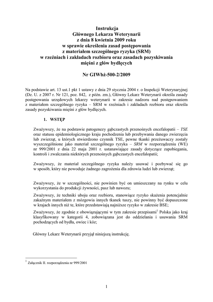 Instrukcja Głównego Lekarza Weterynarii z dnia 8 kwietnia 2009 roku w sprawie określenia zasad postępowania z materiałem szczególnego ryzyka (SRM) w rzeźniach i zakładach rozbioru oraz zasadach pozyskiwania mięśni z głów bydlęcych Nr GIWbŜ-500-2/2009 Na podstawie art. 13 ust.1 pkt 1 ustawy z dnia 29 stycznia 2004 r. o Inspekcji Weterynaryjnej (Dz. U. z 2007 r. Nr 121, poz. 842, z późn. zm.), Główny Lekarz Weterynarii określa zasady postępowania urzędowych lekarzy weterynarii w zakresie nadzoru nad postępowaniem z materiałem szczególnego ryzyka – SRM w rzeźniach i zakładach rozbioru oraz określa zasady pozyskiwania mięśni z głów bydlęcych. 1. WSTĘP ZwaŜywszy, Ŝe na podstawie patogenezy gąbczastych przenośnych encefalopatii – TSE oraz statusu epidemiologicznego kraju pochodzenia lub przebywania danego zwierzęcia lub zwierząt, u których stwierdzono czynnik TSE, pewne tkanki przeŜuwaczy zostały wyszczególnione jako materiał szczególnego ryzyka – SRM w rozporządzeniu (WE) nr 999/2001 z dnia 22 maja 2001 r. ustanawiające zasady dotyczące zapobiegania, kontroli i zwalczania niektórych przenośnych gąbczastych encefalopatii; ZwaŜywszy, Ŝe materiał szczególnego ryzyka naleŜy usuwać i pozbywać się go w sposób, który nie powoduje Ŝadnego zagroŜenia dla zdrowia ludzi lub zwierząt; ZwaŜywszy, Ŝe w szczególności, nie powinien być on umieszczany na rynku w celu wykorzystania do produkcji Ŝywności, pasz lub nawozu; ZwaŜywszy, Ŝe techniki uboju oraz rozbioru, stanowiące ryzyko skaŜenia potencjalnie zakaźnym materiałem z mózgowia innych tkanek tuszy, nie powinny być dopuszczone w krajach innych niŜ te, które przedstawiają najniŜsze ryzyko w zakresie BSE; ZwaŜywszy, Ŝe zgodnie z obowiązującymi w tym zakresie przepisami1 Polska jako kraj klasyfikowany w kategorii 4, zobowiązana jest do oddzielania i usuwania SRM pochodzących od bydła, owiec i kóz; Główny Lekarz Weterynarii przyjął niniejszą instrukcję. 1 Załącznik II. rozporządzenia nr 999/2001 1 2. DEFINICJE a) SRM – tkanki pozyskane od bydła, owiec i kóz, mogące zawierać w sobie czynnik będący przyczyną zachorowań na pasaŜowalne gąbczaste encefalopatie. Szczegółowy wykaz SRM z tych gatunków zwierząt zawiera Załącznik Nr 1; Zgodnie z rozporządzeniem Parlamentu Europejskiego i Rady Nr 1774/2002 z dnia 3 października 2002 r. ustanawiające przepisy sanitarne dotyczące produktów ubocznych pochodzenia zwierzęcego nie przeznaczonych do spoŜycia przez ludzi , SRM stanowi materiał kategorii 1. b) TSE – pasaŜowalne gąbczaste encefalopatie – grupa chorób centralnego układu nerwowego, wywołana przez białka prionowe PrPSC. Choroby te przy braku reakcji zapalnej i immunologicznej, długim kilkuletnim okresie inkubacji oraz chronicznym – kilkumiesięcznym przebiegu kończącym się zawsze zejściem śmiertelnym zwierząt prowadzą docelowo do degeneracji komórek nerwowych CUN (Centralnego Układu Nerwowego). c) BSE – gąbczasta encefalopatia bydła – jedna z chorób zaliczanych do TSE. W obrazie histopatologicznym powstałe w wyniku choroby zmiany mają wygląd gąbki. d) UPPZ – uboczne produkty pochodzenia zwierzęcego, powstające przy uboju bydła, owiec i kóz, rozbiorze tusz tych zwierząt oraz przy pozyskiwaniu mięśni z głów bydlęcych e) Procedury zakładowe dotyczące SRM – zbiór procedur i instrukcji stanowiskowych, zapewniających, Ŝe SRM: • usuwany jest w sposób bezpieczny i prawidłowy (w całkowitym oddzieleniu od innych ubocznych produktów zwierzęcych oraz mięsa przeznaczonego do konsumpcji przez człowieka lub zwierzęta); • jest barwiony i magazynowany w sposób prawidłowy; • nie ma moŜliwości być przeniesiony z miejsca magazynowania do innych zakłaów, za wyjątkiem transportu do uprawnionego zakładu przetwórczego kategorii 1 lub spalarni (określenie dróg przemieszczania SRM). f) SkaŜenie krzyŜowe – jakikolwiek kontakt, co najmniej dwóch tkanek zwierzęcych lub ich części, z których jedną jest SRM , jest zanieczyszczona SRM lub zawiera SRM, (nie dotyczy stykających się ćwierci z kręgosłupem oraz głów bydlęcych w czasie przechowywania i transportu). g) Kwalifikowany odbiorca – zakład, który spełnia wymagania weterynaryjne do odejmowania w trakcie wykonywanego rozbioru: • kręgosłupa z wołowych półtusz/ćwierćtusz, części nie więcej niŜ trzech z półtuszy pozyskanych z bydła starszego niŜ 30 miesięcy; • rdzenia kręgowego z tuszek owiec, kóz, bydła pozyskanych ze zwierząt starszych niŜ 12 miesięcy; • mięśni z głów bydlęcych, pozyskanych od bydła w kaŜdym wieku. 2 3. AKTY PRAWNE 1. Ustawa z dnia 29 stycznia 2004 r. o Inspekcji Weterynaryjnej (Dz. U. z 2007 r. Nr 121, poz. 842, z późn. zm.). 2. Ustawa z dnia 11 marca 2004 r. o ochronie zdrowia zwierząt oraz zwalczaniu chorób zakaźnych zwierząt (Dz. U. z 2008r. Nr 213, poz. 1342). 3. Rozporządzenie Parlamentu Europejskiego i Rady (WE) nr 999/2001 z dnia 22 maja 2001 r. ustanawiające zasady dotyczące zapobiegania, kontroli i zwalczania niektórych przenośnych gąbczastych encefalopatii ( Dz. U. L 147 z 31.5.2001, str. 1—40, z późn. zm. Polskie wydanie specjalne Rozdział 3 Tom 32 P. 289 - 328 ) zwanego dalej Rozporządzeniem 999/2001. 4. Rozporządzenie (WE) nr 1774/2002 Parlamentu Europejskiego i Rady z dnia 3 października 2002 r. ustanawiające przepisy sanitarne dotyczące produktów ubocznych pochodzenia zwierzęcego nie przeznaczonych do spoŜycia przez ludzi (Dz. U. L 273 z 10.10.2002, str. 1—95, z późn. zm, Polskie wydanie specjalne Rozdział 3 Tom 37 P. 92 – 186) zwanego dalej rozporządzeniem 1774/2002 5. Rozporządzenie (WE) nr 882/2004 Parlamentu Europejskiego i Rady z dnia 29 kwietnia 2004 r. w sprawie kontroli urzędowych przeprowadzanych w celu sprawdzenia zgodności z prawem paszowym i Ŝywnościowym oraz regułami dotyczącymi zdrowia zwierząt i 