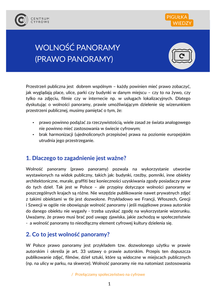 WOLNOŚĆ PANORAMY (PRAWO PANORAMY) Przestrzeń publiczna jest dobrem wspólnym – każdy powinien mieć prawo zobaczyć, jak wyglądają place, ulice, parki czy budynki w danym miejscu – czy to na żywo, czy tylko na zdjęciu, filmie czy w internecie np. w usługach lokalizacyjnych. Dlatego dyskutując o wolności panoramy, prawie umożliwiającym dzielenie się wizerunkiem przestrzeni publicznej, musimy pamiętać o tym, że: • • prawo powinno podążać za rzeczywistością, wiele zasad ze świata analogowego nie powinno mieć zastosowania w świecie cyfrowym; brak harmonizacji (ujednoliconych przepisów) prawa na poziomie europejskim utrudnia jego przestrzeganie. 1. Dlaczego to zagadnienie jest ważne? Wolność panoramy (prawo panoramy) pozwala na wykorzystanie utworów wystawionych na widok publiczny, takich jak: budynki, rzeźby, pomniki, inne obiekty architektoniczne, murale, graffiti bez konieczności uzyskiwania zgody posiadaczy praw do tych dzieł. Tak jest w Polsce – ale przypisy dotyczące wolności panoramy w poszczególnych krajach są różne. Nie wszędzie publikowanie nawet prywatnych zdjęć z takimi obiektami w tle jest dozwolone. Przykładowo we Francji, Włoszech, Grecji i Szwecji w ogóle nie obowiązuje wolność panoramy i jeśli majątkowe prawa autorskie do danego obiektu nie wygasły - trzeba uzyskać zgodę na wykorzystanie wizerunku. Uważamy, że prawo musi brać pod uwagę zjawiska, jakie zachodzą w społeczeństwie - a wolność panoramy to nieodłączny element cyfrowej kultury dzielenia się. 2. Co to jest wolność panoramy? W Polsce prawo panoramy jest przykładem tzw. dozwolonego użytku w prawie autorskim i określa je art. 33 ustawy o prawie autorskim. Przepis ten dopuszcza publikowanie zdjęć, filmów, dzieł sztuki, które są widoczne w miejscach publicznych (np. na ulicy w parku, na skwerze). Wolność panoramy nie ma natomiast zastosowania / Przełączamy społeczeństwo na cyfrowe 1 wobec obiektów znajdujących się w miejscach niepublicznych (np. rzeźba stojąca u kogoś w domu). Prawo panoramy w Polsce ma szeroki zakres i daje dużą pewność i swobodę w korzystaniu z utworów. Jednak to, co u nas jest oczywiste, w innych krajach wygląda zupełnie inaczej. Różnice wynikają z tego, że dyrektywa w sprawie harmonizacji niektórych aspektów praw autorskich i pokrewnych w społeczeństwie informacyjnym (tzw. InfoSoc) zezwala państwom członkowskim na wprowadzenie do prawa lokalnego dozwolonego użytku w postaci wolności panoramy - ale tego od nich nie wymaga. W efekcie w różnych krajach europejskich zdecydowano się na różne regulacje dotyczące prawa panoramy. Polska czy Wielka Brytania wprowadziły szeroki dozwolony użytek, ale już np. Francja czy Włochy w ogóle nie przewidują takiego wyjątku. Na tym tle polska regulacja może być przykładem dobrej implementacji dyrektywy do prawa krajowego. 3. Diagnoza - wyzwania związane z wolnością panoramy • • Prawo niedostosowane do współczesnych potrzeb: wszyscy fotografujemy, kręcimy filmy czy w inny sposób uwieczniamy miejsca, do których podróżujemy lub gdzie spędzamy czas. Niektóre dzieła stały się też elementami popkultury i tym samym zaczęły być wykorzystywane w różny nietypowy sposób - jako nadruki na koszulach czy inne gadżety. Dziś trudno jednoznacznie stwierdzić, które z tych działań mają charakter komercyjny, a które niekomercyjny – ale niezależnie od tego, wszystkie powinny być dozwolone. Dlatego brak prawa panoramy generuje niepewność prawną i hamuje kreatywność. Myślenie kategoriami analogowymi prowadzi do generowania martwych przepisów. Przykładem na takie działanie może być wyrok szwedzkiego Sądu Najwyższego, który uznał, że prawo panoramy dotyczy tylko analogowego wykorzystania zdjęć, a nie cyfrowego. Brak harmonizacji europejskiego prawa: przepisy w różnych krajach Unii Europejskiej różnią się od siebie, co utrudnia ich przestrzeganie. W Polsce obowiązuje szeroki zakres dozwolonego użytku, ale już np. we Francji, aby sfotografować wieżę Eiffla nocą potrzebne jest pozwolenie (oświetlenie wieży jest objęte ochroną prawnoautorską). W Finlandii i Danii na wykorzystanie zdjęć np. rzeźb jest potrzebna zgoda ich twórców. Z kolei w krajach bałtyckich oraz Słowenii zdjęcia można wykorzystywać tylko w celach niekomercyjnych. Prowadzi to do sytuacji, w której jeśli chcemy / Przełączamy społeczeństwo na cyfrowe 2 przestrzegać prawa autorskiego w zakresie prawa panoramy, musimy poznać dokładnie ustawodawstwo każdego kraju. 4. Rekomendacje • • Harmonizacja prawa – potrzebne jest jednolite prawo dla wszystkich w Unii Europejskiej, które da poczucie pewności prawnej i jasność co to tego, co jest dozwolone w kontekście wolności panoramy, a co zabronione. Przepisy dostosowane do współczesnych potrzeb – Unia Europejska musi zapewnić nie tylko jednolite ramy prawne dla wszystkich, ale również takie przepisy, które będą możliwe do przestrzegania i szanowania w cyfrowej rzeczywistości. Polska regulacja może być przykładem dobrej implementacji unijnej dyrektywy do prawa krajowego. W porównaniu z innymi krajami polskie prawo daje dużo większą pewność i swobodę w korzystaniu z utworów, stymuluje kreatywność i innowacje. 5. Materiały Centrum Cyfrowego • • • • Prawo panoramy – 4 powody, dla których jest ważne1. Wolność panoramy – dla wszystkich czy dla wybranych?2. Stanowisko w konsultacjach publicznych w zakresie prawa pokrewnego wydawców i prawa panoramy3. Stanowisko stowarzyszenia Communia w sprawie wolności panoramy w ramach europejskiej reformy prawa autorskiego4. 6. Materiały zewnętrzne • • Wolność Panoramy 2015 - materiały Wikimedia5. Czym jest Prawo panoramy - materiały serwisu Legalna Kultura6. 1 http://centrumcyfrowe.pl/prawo-panoramy-4-powody-dla-ktorych-jest-wazne/. http://centrumcyfrowe.pl/wolnosc-panoramy-dla