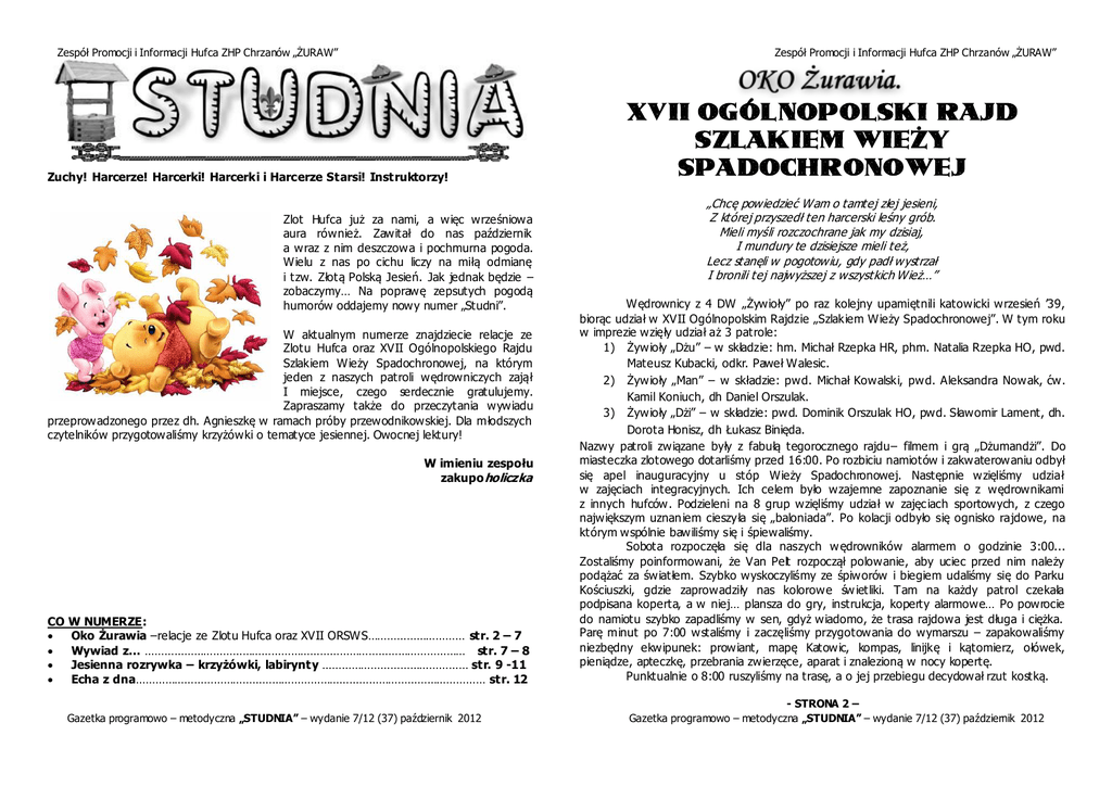Zespół Promocji i Informacji Hufca ZHP Chrzanów „ŻURAW” Zespół Promocji i Informacji Hufca ZHP Chrzanów „ŻURAW” Zuchy! Harcerze! Harcerki! Harcerki i Harcerze Starsi! Instruktorzy! Zlot Hufca już za nami, a więc wrześniowa aura również. Zawitał do nas październik a wraz z nim deszczowa i pochmurna pogoda. Wielu z nas po cichu liczy na miłą odmianę i tzw. Złotą Polską Jesień. Jak jednak będzie – zobaczymy… Na poprawę zepsutych pogodą humorów oddajemy nowy numer „Studni”. W aktualnym numerze znajdziecie relacje ze Zlotu Hufca oraz XVII Ogólnopolskiego Rajdu Szlakiem Wieży Spadochronowej, na którym jeden z naszych patroli wędrowniczych zajął I miejsce, czego serdecznie gratulujemy. Zapraszamy także do przeczytania wywiadu przeprowadzonego przez dh. Agnieszkę w ramach próby przewodnikowskiej. Dla młodszych czytelników przygotowaliśmy krzyżówki o tematyce jesiennej. Owocnej lektury! W imieniu zespołu zakupo holiczka CO W NUMERZE: Oko Żurawia –relacje ze Zlotu Hufca oraz XVII ORSWS………………………… str. 2 – 7 Wywiad z… ……………………………………………………………………………………… str. 7 – 8 Jesienna rozrywka – krzyżówki, labirynty ……………………………………… str. 9 -11 Echa z dna……………………………………………………………………………………………… str. 12 Gazetka programowo – metodyczna „STUDNIA” – wydanie 7/12 (37) październik 2012 XVII Ogólnopolski Rajd Szlakiem Wieży Spadochronowej „Chcę powiedzieć Wam o tamtej złej jesieni, Z której przyszedł ten harcerski leśny grób. Mieli myśli rozczochrane jak my dzisiaj, I mundury te dzisiejsze mieli też, Lecz stanęli w pogotowiu, gdy padł wystrzał I bronili tej najwyższej z wszystkich Wież…” Wędrownicy z 4 DW „Żywioły” po raz kolejny upamiętnili katowicki wrzesień ’39, biorąc udział w XVII Ogólnopolskim Rajdzie „Szlakiem Wieży Spadochronowej”. W tym roku w imprezie wzięły udział aż 3 patrole: 1) Żywioły „Dżu” – w składzie: hm. Michał Rzepka HR, phm. Natalia Rzepka HO, pwd. Mateusz Kubacki, odkr. Paweł Walesic. 2) Żywioły „Man” – w składzie: pwd. Michał Kowalski, pwd. Aleksandra Nowak, ćw. Kamil Koniuch, dh Daniel Orszulak. 3) Żywioły „Dżi” – w składzie: pwd. Dominik Orszulak HO, pwd. Sławomir Lament, dh. Dorota Honisz, dh Łukasz Binięda. Nazwy patroli związane były z fabułą tegorocznego rajdu– filmem i grą „Dżumandżi”. Do miasteczka zlotowego dotarliśmy przed 16:00. Po rozbiciu namiotów i zakwaterowaniu odbył się apel inauguracyjny u stóp Wieży Spadochronowej. Następnie wzięliśmy udział w zajęciach integracyjnych. Ich celem było wzajemne zapoznanie się z wędrownikami z innych hufców. Podzieleni na 8 grup wzięliśmy udział w zajęc iach sportowych, z czego największym uznan iem cieszyła się „baloniada”. Po kolacji odbyło się ognisko rajdowe, na którym wspólnie bawiliśmy się i śpiewaliśmy. Sobota rozpoczęła się dla naszych w ędrowników alarmem o godzinie 3:00... Zostaliśmy poinformowani, że Van Pelt rozpoczął polowanie, aby uciec przed nim należy podążać za światłem. Szybko wyskoczyliśmy ze śpiworów i biegiem udaliśmy się do Parku Kościuszki, gdzie zaprowadziły nas kolorowe św ietliki. Tam na każdy patrol czekała podpisana koperta, a w niej… plansza do gry, instrukcja, koperty alarmowe… Po powrocie do namiotu szybko zapadliśmy w sen, gdyż wiadomo, że trasa rajdowa jest długa i ciężka. Parę minut po 7:00 wstaliśmy i zaczęliśmy przygotowania do wymarszu – zapakowaliśmy niezbędny ekwipunek: prowiant, mapę Katowic, kompas, linijkę i kątomierz, ołówek, pieniądze, apteczkę, przebrania zwierzęce, aparat i znalezioną w nocy kopertę. Punktualnie o 8:00 ruszyliśmy na trasę, a o jej przebiegu decydował rzut kostką. - STRONA 2 – Gazetka programowo – metodyczna „STUDNIA” – wydanie 7/12 (37) październik 2012 Zespół Promocji i Informacji Hufca ZHP Chrzanów „ŻURAW” Na każdym punkcie wykonywaliśmy zadanie, za które otrzymywaliśmy naklejkę ze zwierzakiem (w zależności od ilości zdobytych punktów) oraz wskazówkę dotyczącą następnego punktu – azymut lub współrzędne oraz krótką rymowankę. Trasa rajdu biegłą przez centrum Katowic, ale nie tylko… Patrole musiały dotrzeć także na oddalone nieco Muchowiec i Koszutkę. W tym roku jednak można było korzystać z komunikacji miejskiej, z czego niektóre patrole ochoczo skorzystały… Na naszej trasie m.in.: strzelaliśmy z łuku i wiatrówki, piliśmy mleko z rękawiczki, piekliśmy bułkę w centrum miasta, robiliśmy zdjęcia, ćwiczyliśmy naszą sprawność fizyczną i intelekt, robiliśmy zakupy, szukaliśmy zaszyfrowanej wiadomości przez lornetkę, rysowaliśmy… Do największych atrakcji należało jednak wejście na Wieżę Spadochronową, na której znajdował się punkt zadaniowy, a która jest zazwyczaj zamknięta dla zwiedzających. Nasza trasa rajdowa kończyła się o 16:00. Po powrocie do miasteczka rajdowego czekał na nas obiad oraz autobusy, które zawiozły nas na Galę Dębowych Liści, w czasie której odznaczono zasłużonych instruktorów katowickiego hufca. Następnie wróciliśmy na ko lację i koncert pod Wieżą Spadochronową. Niektórzy z nas, zmęczeni całodniową wędrówką zasnęli jeszcze przed ogłoszeniem ciszy nocnej… Niedziela up łynęła szybko, nawet „za szybko”… Po pobudce i śniadaniu, spakowaliśmy nasze plecaki i zło żyliśmy namioty. Następnie udaliśmy się pod Wieżę, gdzie odbył się apel kończący i podsumowujący XVII Ogólnopolski Rajd „Szlakiem Wieży Spadochronowej”. Miło nam poinformować, że na 19 patroli wędrowniczych z całej Polski, nasz patrol „Żywioły Dżu” zajął I miejsce! Satysfakcja była ogromna, że nasze zmęczenie i trud