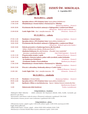 DZIEŃ ŚW. MIKOŁAJA 4 – 6 grudnia 2015 04.12.2015 r. – piątek 14.00-20.00 17.00-23.00 Specjalna oferta w SPA Księżnej Anny (opcja płatna dodatkowo) Obiadokolacja w formie bufetu w Restauracji św. Mikołaja 18.00-20.00 Wytchnienie dla Dorosłych: animacje w Bajkogrodzie z zamkowymi Elfami 21.00-02.00 Castle Night Club – bar i muzyka taneczna - DJ (Restauracja Refektarz – Poziom I) (Zbrojownia – Budynek naprzeciwko Zamku ) (Winiarnia – Poziom „0”) 05.12.2015 r. – sobota 07.00-11.00 09.00-20.00 10.00-18.00 Śniadanie w formie bufetu (Restauracja Refektarz – Poziom I) Specjalna oferta w SPA Księżnej Anny (opcja płatna dodatkowo) Wytchnienie dla Dorosłych: animacja w Bajkogrodzie z zamkowymi Elfami 10.00-18.00 Fabryka prezentów u Zamkowego krawca dla Dorosłych (sklep z ekskluzywną odzieżą „Moda przy Kawie”) Akademia Kulinarna dla całej Rodziny: „Pierniki i inne smakołyki” (prosimy o punktualne przybycie) (Sala Wielki Kapitularz – Poziom II) Wypożyczalnie strojów z epoki (Budynek Zbrojowni – Poziom I) Spotkanie z historią (zabawy, pokaz walk rycerskich, nauka fechtunku (Dziedziniec – Poziom I) na Zamkowym Dziedzińcu Zwiedzanie Zamku z Przewodnikiem (Spotkanie przy Recepcji ) Obiadokolacja w formie bufetu w Restauracji św. Mikołaja (Zbrojownia – Budynek naprzeciwko Zamku ) 12.00 12.30-13.30 13.30-15.30 16.00 17.00-23.00 (Restauracja Refektarz – Poziom I) 20.00-23.00 21.00-2.00 Wieczór z adrenaliną i doskonałą zabawą w Castle Casino Castle Night Club – bar i muzyka taneczna - DJ (Budynek Zbrojowni– Poziom I) (Winiarnia – Poziom „0”) 06.12.2015 r. – niedziela 07.00-11.00 09.00-12.00 10.00 12.00 Śniadanie w formie bufetu (Restauracja Refektarz – Poziom I) Specjalna oferta w SPA Księżnej Anny (opcja płatna dodatkowo) Spotkanie z Elfem co zna historię ową – Spacer śladami historii miasteczka Ryn (Spotkanie przy Recepcji ) Zakończenie doby hotelowej Prośba o wymeldowanie Usługi dodatkowe – bezpłatne • Bajkogród (Klub Malucha) - działa codziennie (do dyspozycji zabawki, farby, kredki, wycinanki, gry planszowe, gry Xbox ) • Korzystanie z Sali Fitness i stołu do tenisa w Zbrojowni (codziennie w godzinach 7.00-23.00) • Korzystanie z basenu, jacuzzi i saun (codziennie w godzinach 8.00-22.00) Usługi dodatkowe – płatne • Zbrojownia (czynna : piątek w godz. 15.00-22.00, sobota w godz. 12.00-23.00, rezerwacja tel. 803) kręgle, bilard, piłkarzyki, • Sklep Smaki Mazur (czynny : piątek – sobota 10.00-18.00, niedziela 10.00-17.00) • Restauracja w Gościńcu Ryński Młyn (czynna codziennie w godz. 12.00-22.00)
