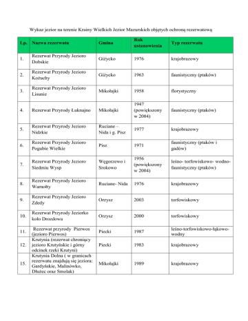 Wykaz jezior na terenie Krainy Wielkich Jezior Mazurskich objętych ochroną rezerwatową Lp. Nazwa rezerwatu Gmina Rok ustanowienia Typ rezerwatu 1. Rezerwat Przyrody Jezioro Dobskie Giżycko 1976 krajobrazowy 2. Rezerwat Przyrody Jezioro Kożuchy Giżycko 1963 faunistyczny (ptaków) 3. Rezerwat Przyrody Jezioro Lisunie Mikołajki 1958 florystyczny faunistyczny (ptaków) 4. Rezerwat Przyrody Łuknajno Mikołajki 1947 (powiększony w 2004) 5. Rezerwat Przyrody Jezioro Nidzkie Ruciane – Nida i g. Pisz 1977 krajobrazowy 6. Rezerwat Przyrody Jezioro Pogubie Wielkie Pisz 1971 faunistyczny (ptaków i gadów) 7. Rezerwat Przyrody Jezioro Siedmiu Wysp Węgorzewo i Srokowo 1956 (powiększony w 2004) leśno- torfowiskowo- wodnofaunistyczny (ptaków) 8. Rezerwat Przyrody Jezioro Warnołty Ruciane- Nida 1976 krajobrazowy 9. Rezerwat Przyrody Jezioro Zdedy Orzysz 2003 torfowiskowy 10. Rezerwat Przyrody Jeziorko koło Drozdowa Orzysz 2000 torfowiskowy Piecki 1987 leśno-torfowiskowo-łąkowowodny Piecki 1983 krajobrazowy Mikołajki 1989 krajobrazowy 11. 12. 15. Rezerwat przyrody Pierwos (jezioro Pierwos) Krutynia (rezerwat chroniący jezioro Krutyńskie i górny odcinek rzeki Krutyni) Krutynia Dolna ( w granicach rezerwatu znajdują się jeziora: Gardyńskie, Malinówko, Dłużec oraz Smolak)