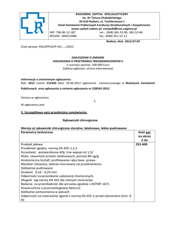 RADOMSKI SZPITAL SPECJALISTYCZNY im. Dr Tytusa Chałubińskiego 26-610 Radom, ul. Tochtermana 1 Dział Zamówień Publicznych Funduszy Strukturalnych i Zaopatrzenia www.szpital.radom.pl; [email protected] NIP: 796-00-12-187 tel.: (048) 361-52-85, 361-52-84 REGON: 000315086 fax.: (048) 361-52-13 Radom, dnia 2012.07.03 Znak sprawy: RSS/ZPFSiZ/P-43/…../2012 OGŁOSZENIE O ZMIANIE OGŁOSZENIA O PRZETRARGU NIEOGRANICZONYM II o wartości poniżej 200 000 Euro (tablica ogłoszeń, strona internetowa) Informacje o zmienianym ogłoszeniu: Rok: 2012 numer 212450 data: 29.06.2012 ogłoszenia zamieszczonego w Biuletynie Zamówień Publicznych oraz ogłoszenia o zmianie ogłoszenia nr 228542-2012 Zmiany w ogłoszeniu: I. W ogłoszeniu jest: 5. Szczegółowy opis przedmiotu zamówienia: Rękawiczki chirurgiczne Wersja a) rękawiczki chirurgiczne sterylne, lateksowe, lekko pudrowane Parametry techniczne Produkt jałowy Przedmiot zgodny normą EN 455-1,2,3 Szczelność potwierdzona AQL /nie więcej niż 1,5/ Niska zawartość protein lateksowych, poniżej 80 ug/g Anatomiczny kształt, profilowanie ręka lewa -prawa Mankiet rolowany, dobrze mocowany na przedramieniu Delikatnie pudrowane Grubość 0,16 - 0,24 mm Odporność na przenikanie substancji chemicznych, Długość wg normy EN 455 dla różnych rozmiarów Badania na przenikalność dla wirusów zgodnie z ASTMF 1671 Powierzchnia o przeciwślizgowej fakturze Delikatne wzmocnienia w palcach Odporność na rozerwanie zgonie z normą EN 455-2 przed starzeniem (min. 9 N) Ilość par na okres 2 lat 252.400 Wersja b) rękawiczki chirurgiczne, bezlateksowe, bezpudrowe, wykonane z neoprenu Parametry techniczne Ilość par na okres 2 lat Produkt jałowy 6.000 Przedmiot zgodny normą EN 455-1,2,3 Szczelność potwierdzona AQL /nie więcej niż 1,5/ Niska zawartość protein lateksowych, poniżej 50 ug/g Bezpudrowe z wewnętrzną warstwą bezlateksową - polimerową Grubość 0,16 - 0,24 mm Anatomiczny kształt, profilowanie ręka lewa –prawa pozwalający na dobre dopasowanie Mankiet rolowany, dobrze mocowany na przedramieniu Odporność na przenikanie substancji chemicznych, Długość wg normy EN 455 dla różnych rozmiarów Badania na przenikalność dla wirusów zgodnie z ASTMF 1671 Powierzchnia o przeciwślizgowej fakturze Delikatne wzmocnienia w palcach Odporność na rozerwanie zgonie z normą EN 455-2 przed starzeniem (min. 9 N) W ogłoszeniu powinno być: 5. Szczegółowy opis przedmiotu zamówienia: Rękawiczki chirurgiczne Wersja a) rękawiczki chirurgiczne sterylne, lateksowe, lekko pudrowane Parametry techniczne Produkt jałowy Przedmiot zgodny normą EN 455-1,2,3 Szczelność potwierdzona AQL /nie więcej niż 1,5/ Niska zawartość protein lateksowych, poniżej 80 ug/g Anatomiczny kształt, profilowanie ręka lewa -prawa Mankiet rolowany lub prosty lub inny z poprzecznymi lub podłużnymi lub innymi wzmocnieniami , dobrze mocowany na przedramieniu Delikatnie pudrowane Grubość : Palec- 0,22mm +/- 2mm Dłoń- 0,18mm +/- 2mm Mankiet- 0,16mm +/- 2mm Odporność na przenikanie substancji chemicznych, Długość wg normy EN 455 dla różnych rozmiarów : 6, 6,5 ; 7, 7,5; 8, 8,5; 9 nie dłuższe jednak niż 300mm Badania na przenikalność dla wirusów zgodnie z ASTMF 1671 Powierzchnia o przeciwślizgowej fakturze Ilość par na okres 2 lat 252.400 Delikatne wzmocnienia w palcach Odporność na rozerwanie zgonie z normą EN 455-2 przed starzeniem (min. 9 N) Wersja b) rękawiczki chirurgiczne, bezlateksowe, bezpudrowe, wykonane z neoprenu LUB POLIIZOPRENU Parametry techniczne Produkt jałowy Przedmiot zgodny normą EN 455-1,2,3 Szczelność potwierdzona AQL /nie więcej niż 1,5/ Niska zawartość protein lateksowych, poniżej 50 ug/g Bezpudrowe z wewnętrzną warstwą bezlateksową - polimerową Grubość Palec- 0,22mm +/- 2mm Dłoń- 0,18mm +/- 2mm Mankiet- 0,16mm +/- 2mm Anatomiczny kształt, profilowanie ręka lewa –prawa pozwalający na dobre dopasowanie Mankiet rolowany lub prosty lub inny z poprzecznymi lub podłużnymi lub innymi wzmocnieniami , dobrze mocowany na przedramieniu Odporność na przenikanie substancji chemicznych, Długość zgodnie z poszczególnymi rozmiarami : : 6, 6,5 ; 7, 7,5; 8, 8,5; 9 nie dłuższe jednak niż 300mm Badania na przenikalność dla wirusów zgodnie z ASTMF 1671 Powierzchnia o przeciwślizgowej fakturze Delikatne wzmocnienia w palcach Odporność na rozerwanie zgonie z normą EN 455-2 przed starzeniem (min. 9 N) Ogłoszenie zamieszczono w Biuletynie Zamówień Publicznych 232628-2012. Ilość par na okres 2 lat 6.000 dnia 2012.07.03 pod nr Andrzej Pawluczyk ……………………………………………. Podpis osoby upoważnionej -sporządziła Agata Surma