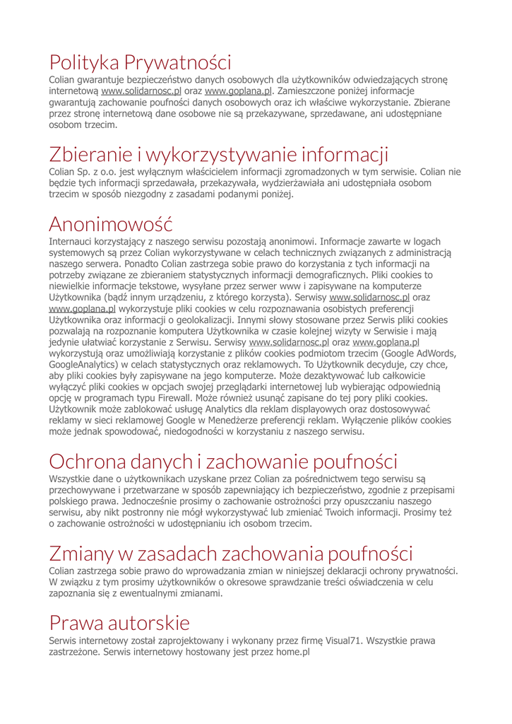 Polityka Prywatności Colian gwarantuje bezpieczeństwo danych osobowych dla użytkowników odwiedzających stronę internetową www.solidarnosc.pl oraz www.goplana.pl. Zamieszczone poniżej informacje gwarantują zachowanie poufności danych osobowych oraz ich właściwe wykorzystanie. Zbierane przez stronę internetową dane osobowe nie są przekazywane, sprzedawane, ani udostępniane osobom trzecim. Zbieranie i wykorzystywanie informacji Colian Sp. z o.o. jest wyłącznym właścicielem informacji zgromadzonych w tym serwisie. Colian nie będzie tych informacji sprzedawała, przekazywała, wydzierżawiała ani udostępniała osobom trzecim w sposób niezgodny z zasadami podanymi poniżej. Anonimowość Internauci korzystający z naszego serwisu pozostają anonimowi. Informacje zawarte w logach systemowych są przez Colian wykorzystywane w celach technicznych związanych z administracją naszego serwera. Ponadto Colian zastrzega sobie prawo do korzystania z tych informacji na potrzeby związane ze zbieraniem statystycznych informacji demograficznych. Pliki cookies to niewielkie informacje tekstowe, wysyłane przez serwer www i zapisywane na komputerze Użytkownika (bądź innym urządzeniu, z którego korzysta). Serwisy www.solidarnosc.pl oraz www.goplana.pl wykorzystuje pliki cookies w celu rozpoznawania osobistych preferencji Użytkownika oraz informacji o geolokalizacji. Innymi słowy stosowane przez Serwis pliki cookies pozwalają na rozpoznanie komputera Użytkownika w czasie kolejnej wizyty w Serwisie i mają jedynie ułatwiać korzystanie z Serwisu. Serwisy www.solidarnosc.pl oraz www.goplana.pl wykorzystują oraz umożliwiają korzystanie z plików cookies podmiotom trzecim (Google AdWords, GoogleAnalytics) w celach statystycznych oraz reklamowych. To Użytkownik decyduje, czy chce, aby pliki cookies były zapisywane na jego komputerze. Może dezaktywować lub całkowicie wyłączyć pliki cookies w opcjach swojej przeglądarki internetowej lub wybierając odpowiednią opcję w programach typu Firewall. Może również usunąć zapisane do tej pory pliki cookies. Użytkownik może zablokować usługę Analytics dla reklam displayowych oraz dostosowywać reklamy w sieci reklamowej Google w Menedżerze preferencji reklam. Wyłączenie plików cookies może jednak spowodować, niedogodności w korzystaniu z naszego serwisu. Ochrona danych i zachowanie poufności Wszystkie dane o użytkownikach uzyskane przez Colian za pośrednictwem tego serwisu są przechowywane i przetwarzane w sposób zapewniający ich bezpieczeństwo, zgodnie z przepisami polskiego prawa. Jednocześnie prosimy o zachowanie ostrożności przy opuszczaniu naszego serwisu, aby nikt postronny nie mógł wykorzystywać lub zmieniać Twoich informacji. Prosimy też o zachowanie ostrożności w udostępnianiu ich osobom trzecim. Zmiany w zasadach zachowania poufności Colian zastrzega sobie prawo do wprowadzania zmian w niniejszej deklaracji ochrony prywatności. W związku z tym prosimy użytkowników o okresowe sprawdzanie treści oświadczenia w celu zapoznania się z ewentualnymi zmianami. Prawa autorskie Serwis internetowy został zaprojektowany i wykonany przez firmę Visual71. Wszystkie prawa zastrzeżone. Serwis internetowy hostowany jest przez home.pl