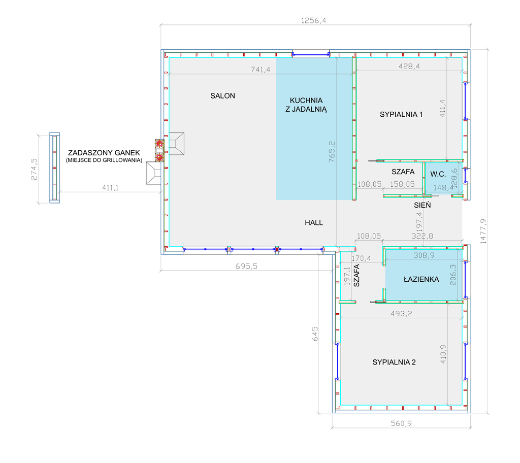 SALON KUCHNIA Z JADALNIĄ SYPIALNIA 1 ZADASZONY GANEK (MIEJSCE DO GRILLOWANIA) SZAFA W.C. SIEŃ SZAFA HALL ŁAZIENKA SYPIALNIA 2