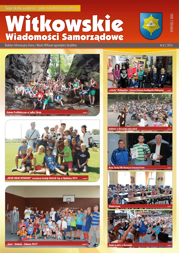 Twoje lokalne wiadomości społeczno-kulturalno-gospodarcze ISSN 1730-606X Biuletyn informacyjny Gminy i Miasta Witkowo egzemplarz bezpłatny Kolonia Profilaktyczna w Lądku Zdroju „OKSIR ORLIK WITKOWO” zwycięzcą turnieju Hattrick Cup w Opalenicy 2014 „Sport - Uśmiech - Zabawa 2014” Nr 8 / 2014 „eSzkoła” Wielkopolska - Cyfrowa Dziecięca Encyklopedia Wielkopolan strona 9 Amfiteatr w Skorzęcinie pełen dzieci! strona 4 Nocny Turniej Piłki Nożnej na Sztucznej Trawie strona 4 Wiejska Farma strona 6 Zumba na plaży w Skorzęcinie strona 15 strona 3 strona 2 strona 10 „OKSIR ORLIK WITKOWO” zwycięzcą turnieju Hattrick Cup w Opalenicy 2014 W piątek 08.08.2014r. wychowankowie „OKSIR ORLIK WITKOWO” zakończyli rywalizację w kategorii U-12 w turnieju HATTRICK Cup w Opalenicy, który jest reaktywacją znanego w całej Polsce turnieju REMES CUP Opalenica. Starostowie Dożynek Gminnych - Witkowo 2014 W tym roku zaszczytną funkcję Starostów Dożynkowych, będą pełnić: Pani Renata Nowacka - Starościna Dożynek Gminnych oraz Rafał Manuszak - Starosta Dożynek Gminnych. Dożynki Gminne odbędą się w niedzielę 24 sierpnia. Poniżej prezentujemy kilka informacji o bohaterach nadchodzącego wydarzenia. Turniej trwał od poniedziałku 4 sierpnia do soboty 9 sierpnia. Drużyna z Witkowa wygrała cały turniej pokonując w finale zespół SALOS POZNAŃ. W ostatniej minucie wyrównującą bramkę str zelił Filip Wędzikowski doprowadzając do rzutów karnych. Pani Renata Nowacka wraz z mężem Arkadiuszem i jego rodzicami od roku 2003 prowadzi gospodarstwo rolne w miejscowości Ruchocinek. Pani Renata i Pan Arkadiusz mają dwie córki w wieku 7 i 13 lat. Gospodarują na powierzchni 14,88 ha, w tym użytków rolnych 12,50 ha. Uprawiają rośliny z przeznaczeniem na paszę dla bydła opasowego. Roczna produkcja żywca wołowego w gospodarstwie wynosi 7 ton. Gospodarstwo dysponuje kompletem niezbędnych maszyn rolniczych. Ze środków unijnych wykorzystano około 22 tys. złotych na dostosowanie gospodarstwa do standardów UE budując płytę obornikową i zbiornik na gnojowicę. Pan Rafał Manuszak wraz z żoną Renatą i jego rodzicami prowadzi gospodarstwo rolne w miejscowości Wiekowo od roku 2012. Państwo Manuszak mają córkę w wieku 10 lat i dwóch synów w wieku 7,5 i 5 lat. Gospodarują na powierzchni około 22 ha, w tym użytków rolnych 21 ha. Uprawiają rośliny z przeznaczeniem na paszę dla bydła mlecznego i opasowego oraz trzody chlewnej. Roczna produkcja mleka to 42 tysięcy litrów, żywca wołowego 3 tony, żywca wieprzowego 5 ton. Gospodarstwo dysponuje kompletem niezbędnych maszyn rolniczych. (A.K.) 8-2014 str. 2 Kropkę nad „i” postawił Maks Machyński pokonując w ostatniej serii rzutów karnych bramkarza SALOSU POZNAŃ, co przypieczętowało wspaniały występ witkowian na turnieju HATTRICK CUP w Opalenicy. Tym samym ogromny puchar trafił w ręce zawodników z Witkowa. Nagrodą główną, którą wygrali chłopcy z Witkowa jest darmowy udział w kolejnej edycji w turnieju HATRICK CUP. Jest to kwota niebagatelna 6.600 zł. Na turnieju zwycięzcami opiekowali się pani Renata Stranc, Tomasz Machyński, Jan Szturomski kierownik, Konrad Plucner trener. (J.S.) ZAWODNICY TURNIEJU PIŁKI NOŻNEJ HATTRICK CUP OPALENICA 2014r. Stoją od lewej: Jan Szturomski - kier. drużyny Filip Wędzikowski - kapitan drużyny - Maks Machyński, Fabian Piątek, Patryk Budzyński - bramkarz, Martyna Stefaniak, Cezary Stranc, Łukasz Musidlak, Michał Mroziński, Paweł Mróz, Konrad Plucner - trener; siedzą od lewej: Oskar Smużniak, Kamil Dałek, Sebastian Matelski, Olaf Warkocki, Kacper Pluciński, Bartosz Biłyk, Igor Perlicki, Zuzanna Sowa. Kolonia Profilaktyczna w Lądku Zdroju Wakacje to czas odpoczynku i regenerowania sił do pracy w nowym roku szkolnym, zwłaszcza, że towarzyszy temu wspaniała, słoneczna pogoda i okolica, w której wypoczywamy. W dniach 14 - 24 lipca br. dzieci i młodzież z gminy Witkowo, dzięki Gminnej Komisji Profilaktyki i Rozwiązywania Problemów Alkoholowych, mogła wypoczywać na Ziemi Kłodzkiej. Uczestnicy wyjazdu zakwaterowani byli w Ośrodku Wypoczynkowym „Bankowy”, który położony jest wśród gór i lasów w części uzdrowiskowej miasta - Lądka Zdroju. Głównym celem kolonii profilaktycznych było tak wpłynąć na młodego człowieka, by mógł lepiej radzić sobie z problemami i wyzwaniami otaczającego świata. Ponadto ważnym elementem oczekiwanej pracy profilaktycznej było tworzenie atmosfery dającej dzieciom i młodzieży poczucie zaufania, bezpieczeństwa, ciepła i radości. Aby powyższy cel zrealizować, turnus miał w swoim programie trzy bloki zajęciowe: blok edukacyjny, sportowy i profilaktyczny. niezapomniane miejsca: źródło wód mineralnych „Jadwiga”, Arboretum - ogród botaniczny, Stawy Biskupie. Wyjątkowa okazała się wycieczka piesza - górska do Śnieżnickiego Parku Krajobrazowego. W czasie wędrówki mijaliśmy: skałę „Samotnik”, punkt widokowy „Trojan”, „Skalną Basztę”. Witkowianie zwiedzali nie tylko najbliższą okolicę zamieszkania, czyli Lądek Zdrój, ale także mieli okazję poznać Ziemię Kłodzką i jej przepiękne miejsca. Całodniową wyprawę (z przewodnikiem) odbyli do Kłodzka, gdzie zwiedzili m.in. most na Nysie, starówkę, Kościół gotycko barokowy NMP oraz atrakcję tego miasta, W bloku edukacyjnym uczestnicy nabywali różnych zdolności manualnych i artystycznych, np. wykonując wizytówki i plakaty o tematyce profilaktycznej (omawianej na zajęciach). Ponadto kadra kolonii przygotowała dla uczestników konkurs plastyczny pt. „Wakacyjnym szlakiem”, w którym nagrodzono trzech wykonawców najciekawszych prac. Uczestnicy kolonii odbyli wiele wycieczek pieszych i autokarowych po najbliższej okolicy. Już pierwszego dnia zwiedzili Lądek Zdrój- rynek, najstarszą pijalnię wód mineralnych - „Wojciech Zdrój”. W kolejnych dniach w c