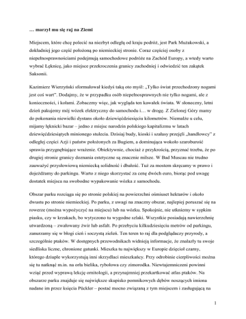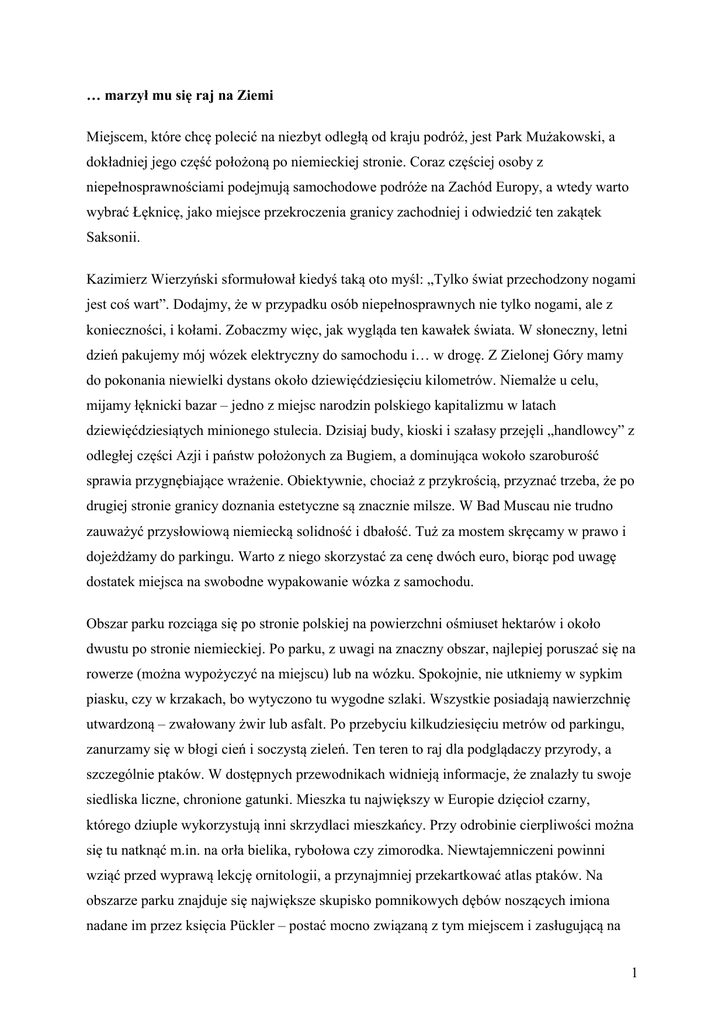 … marzył mu się raj na Ziemi Miejscem, które chcę polecić na niezbyt odległą od kraju podróż, jest Park Mużakowski, a dokładniej jego część położoną po niemieckiej stronie. Coraz częściej osoby z niepełnosprawnościami podejmują samochodowe podróże na Zachód Europy, a wtedy warto wybrać Łęknicę, jako miejsce przekroczenia granicy zachodniej i odwiedzić ten zakątek Saksonii. Kazimierz Wierzyński sformułował kiedyś taką oto myśl: „Tylko świat przechodzony nogami jest coś wart”. Dodajmy, że w przypadku osób niepełnosprawnych nie tylko nogami, ale z konieczności, i kołami. Zobaczmy więc, jak wygląda ten kawałek świata. W słoneczny, letni dzień pakujemy mój wózek elektryczny do samochodu i… w drogę. Z Zielonej Góry mamy do pokonania niewielki dystans około dziewięćdziesięciu kilometrów. Niemalże u celu, mijamy łęknicki bazar – jedno z miejsc narodzin polskiego kapitalizmu w latach dziewięćdziesiątych minionego stulecia. Dzisiaj budy, kioski i szałasy przejęli „handlowcy” z odległej części Azji i państw położonych za Bugiem, a dominująca wokoło szaroburość sprawia przygnębiające wrażenie. Obiektywnie, chociaż z przykrością, przyznać trzeba, że po drugiej stronie granicy doznania estetyczne są znacznie milsze. W Bad Muscau nie trudno zauważyć przysłowiową niemiecką solidność i dbałość. Tuż za mostem skręcamy w prawo i dojeżdżamy do parkingu. Warto z niego skorzystać za cenę dwóch euro, biorąc pod uwagę dostatek miejsca na swobodne wypakowanie wózka z samochodu. Obszar parku rozciąga się po stronie polskiej na powierzchni ośmiuset hektarów i około dwustu po stronie niemieckiej. Po parku, z uwagi na znaczny obszar, najlepiej poruszać się na rowerze (można wypożyczyć na miejscu) lub na wózku. Spokojnie, nie utkniemy w sypkim piasku, czy w krzakach, bo wytyczono tu wygodne szlaki. Wszystkie posiadają nawierzchnię utwardzoną – zwałowany żwir lub asfalt. Po przebyciu kilkudziesięciu metrów od parkingu, zanurzamy się w błogi cień i soczystą zieleń. Ten teren to raj dla podglądaczy przyrody, a szczególnie ptaków. W dostępnych przewodnikach widnieją informacje, że znalazły tu swoje siedliska liczne, chronione gatunki. Mieszka tu największy w Europie dzięcioł czarny, którego dziuple wykorzystują inni skrzydlaci mieszkańcy. Przy odrobinie cierpliwości można się tu natknąć m.in. na orła bielika, rybołowa czy zimorodka. Niewtajemniczeni powinni wziąć przed wyprawą lekcję ornitologii, a przynajmniej przekartkować atlas ptaków. Na obszarze parku znajduje się największe skupisko pomnikowych dębów noszących imiona nadane im przez księcia Pückler – postać mocno związaną z tym miejscem i zasługującą na 1 przybliżenie Czytelnikom. Jak twierdzą znawcy, obszar parkowy należy do najwybitniejszych osiągnięć europejskiej architektury ogrodniczej XIX wieku. Leży w naturalnym wnętrzu doliny Nysy Łużyckiej, która prawie idealnie w połowie przecina Łuk Mużakowski – podobno największą na świecie morenę czołową. Uroku temu miejscu dodają liczne zagłębienia wypełnione wodą. To pozostałości po blisko sześćdziesięciu małych kopalniach węgla brunatnego, eksploatowanych w XIX wieku. Las po prawej stronie przerzedza się i wyłaniają się kwieciste łąki, gdzieniegdzie drzewa – nawet owocowe. Ścieżki łączą się, rozchodzą i wiodą do nowych miejsc urzekających swą niezwykłą urodą. Na całym obszarze parku rozsiane są liczne altanki i ławeczki służące różnorakim przemyśleniom i kto wie jeszcze czemu, pamiętające być może romantyczne spacery byłych właścicieli, a nawet jego założyciela. Może w jednej z takich uroczych altanek czytano lub nawet szeptano ten wiersz: Na rozłogu zakwitł krzew – Różyczka w czerwieni, Młody chłopiec ku niej biegł, Cieszył się, że pośród drzew Kwiat jak świt się mieni. Róży, róży, róży kwiat – Różyczka w czerwieni. Rzecze młody: „Zerwać chcę Różyczkę w czerwieni”. A różyczka na to: „Nie”. Ostrym kolcem ręce tnie Za takie zachcenie. Róży, róży, róży kwiat – Różyczka w czerwieni. Złamał dziki chłopiec krzew – Różyczkę w czerwieni. Kłują kolce, płynie krew, Lecz zapłaci za ten gniew Bólem i cierpieniem. Róży, róży, róży kwiat – Różyczka w czerwieni. (Johann Wolfgang von Goethe „Dzika różyczka”; przełożyła Hanna Januszewska) Poruszając się głównym traktem, po kilku minutach znajdujemy się nad strumykiem. Nad nim zbudowano kładki i wymyślnie zdobione metalowe mostki tonące w kwiatach. To nie jedyny 2 strumyk. Zwiedzając obszar parkowy, napotykamy następne – przecinające łąki lub wijące się między zalesionymi pagórkami. W kilku miejscach podziwiamy urok szemrzących, małych wodospadów. Całość jest zaś imponująca. Można tu godzinami włóczyć się wśród malowniczych krajobrazów. Dookoła tylko bujna zieleń, ptaki i bezkres nieba. Najważniejsze miejsca można objechać w dwie- trzy godziny, ale po co spieszyć się? Najlepiej poświęcić na to cały dzień, od świtu do zmierzchu, bo i park został tak pomyślany, żeby o każdej porze dnia odsłaniać inne oblicze. Przy jednym z mostków podchodzą do nas Niemcy – starsza pani i jej mąż. Proszą abyśmy zrobili im kilka zdjęć. Nawiązujemy rozmowę. Zauważają, że nie jesteśmy ich rodakami – zdradza nas akcent. Mówimy im, że jesteśmy z Polski, że pierwszy raz zwiedzamy park, że oczarowuje nas od pierwszych chwil niepowtarzalny urok tego miejsca. Starszy pan podaje Januszowi „wypasionego” Canona. Trwa prawie półgodzinna sesja zdjęciowa przy mostkach, na tle panoramy po prawej i lewej stronie parku oraz nad małymi oczkami wodnymi, w których roi się od ptactwa wodnego. W pewnej chwili starsza pani nie może opanować ciekawości i zadaje pytanie: jak to się stało, że ja tak