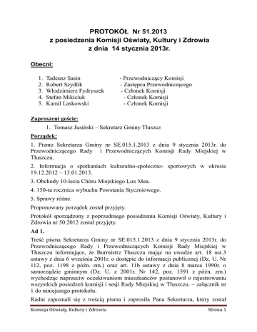 PROTOKÓŁ Nr 51.2013 z posiedzenia Komisji Oświaty, Kultury i Zdrowia z dnia 14 stycznia 2013r. Obecni: 1. 2. 3. 4. 5. Tadeusz Sasin Robert Szydlik Włodzimierz Fydryszek Stefan Mikiciuk Kamil Laskowski - Przewodniczący Komisji - Zastępca Przewodniczącego - Członek Komisji - Członek Komisji - Członek Komisji Zaproszeni goście: 1. Tomasz Jusiński – Sekretarz Gminy Tłuszcz Porządek: 1. Pismo Sekretarza Gminy nr SE.015.1.2013 z dnia 9 stycznia 2013r. do Przewodniczącego Rady i Przewodniczących Komisji Rady Miejskiej w Tłuszczu. 2. Informacja o spotkaniach kulturalno-społeczno- sportowych w okresie 19.12.2012 – 13.01.2013. 3. Obchody 10-lecia Chóru Miejskiego Lux Mea. 4. 150-ta rocznica wybuchu Powstania Styczniowego. 5. Sprawy różne. Proponowany porządek został przyjęty. Protokół sporządzony z poprzedniego posiedzenia Komisji Oświaty, Kultury i Zdrowia nr 50.2012 został przyjęty. Ad 1. Treść pisma Sekretarza Gminy nr SE.015.1.2013 z dnia 9 stycznia 2013r. do Przewodniczącego Rady i Przewodniczących Komisji Rady Miejskiej w Tłuszczu informujące, że Burmistrz Tłuszcza mając na uwadze art. 18 ust.3 ustawy z dnia 6 września 2001r. o dostępie do informacji publicznej (Dz. U. Nr 112, poz. 1198 z późn. zm.) oraz art. 11b ustawy z dnia 8 marca 1990r. o samorządzie gminnym (Dz. U. z 2001r. Nr 142, poz. 1591 z późn. zm.) wychodząc naprzeciw oczekiwaniom mieszkańców postanowił o rejestrowaniu wszystkich posiedzeń komisji i sesji Rady Miejskiej w Tłuszczu. – załącznik nr 1 do niniejszego protokołu. Radni zapoznali się z treścią pisma i zaprosiła Pana Sekretarza, który został Komisja Oświaty, Kultury i Zdrowia Strona 1 poproszony o wyjaśnienie zaistniałej sytuacji, oraz w celu poinformowania radnych o możliwościach używania danych osobowych w trakcie posiedzeń komisji, np. w trakcie rozpatrywania pism od mieszkańców. Tomasz Jusiński Sekretarz Gminy wyjaśnił, że użycie samego imienia i nazwiska nie stanowi nadużycia danych osobowych. Definicja danych osobowych mówi o tym, że musi być użyte imię i nazwisko plus np. miejscowość. Radny Szydlik odniósł się do używania imienia i nazwiska mieszkańca przez radnych podczas posiedzeń i stwierdził, że jeśli będzie podawane wyłącznie imię i nazwisko, tak jak zostało to powiedziane przez Sekretarza, to wszystko będzie w porządku. T,o że dane nazwisko pojawia się częściej, bądź rzadziej na danym terenie, to nie jest niczyją winą. Pan Tomasz Jusiński dodał, iż lepiej byłoby używać określeń „mieszkaniec miejscowości takiej i takiej” bez imienia i nazwiska, m.in. dlatego, że konkretne nazwisko nie powinno mieć znaczenia przy rozpatrywaniu danej sprawy. W ocenie sekretarza ujawnienie imienia i nazwiska nie jest naruszeniem ustawy o ochronie danych osobowych. Podczas dyskusji radni poruszyli wiele aspektów w czasie których mogą zostać użyte pełne dane osobę np. uczestnika konkursu. Radny Szydlik wyraził swoje zdanie, że jest za tym, aby posiedzenia komisji były nagrywane, gdyż mieszkańcy mogą to zobaczyć oraz, że nie powinno podawać się więcej informacji oprócz imienia i nazwiska (z wyjątkiem laureatów różnego rodzaju konkursów). Radny Laskowski Kamil – czy na stronie internetowej tłuszcz.pl oraz ewentualnie w momencie składania pism przez mieszkańców mieszkańcy będą mieli możliwość zapoznać się z informacją, że wyrażają zgodę na publikowanie swoich danych osobowych? Sekretarz Gminy odparł, że nie widzi problemu w tym, żeby taka informacja została zamieszczona, lecz nikogo nie można przymusić do tego, aby takie oświadczenie wypełnił. Ad 2. 20.12.2012r. – opłatkowe spotkanie w Szkole Podstawowej im. Jana Pawła II w Tłuszczu, 21.12.2012r. – spotkanie opłatkowe Klubu Sportowego TKS Bóbr, 22.12.2012r. – opłatkowe spotkanie w OSP w Tłuszczu, 28.12.2012r. – koncert kolęd w CKSiR, 31.12.2012r. – wspólne zebranie podsumowujące rok 2012 - działalność Towarzystwa Przyjaciół Ziemi Tłuszczańskiej i Sekcji Emerytów, Rencistów i Komisja Oświaty, Kultury i Zdrowia Strona 2 Nauczycieli, 03.01.2013r. – spotkanie wszystkich członków Sekcji Emerytów, Rencistów i Nauczycieli, 07.01.2013r. – zebranie Terenowego Koła Pszczelarzy w Tłuszczu, 08.01.2013r. – spotkanie, szkolenie dla organizacji pozarządowych w Urzędzie Miejskim w Tłuszczu, 08.01.2013r. – dokonanie oceny i wykonanie dokumentacji fotograficznej zgłoszonych do konkursu na dekorację bożonarodzeniową posesji w Gminie Tłuszcz, 09.01.2013r. – narada dyrektorów placówek oświatowych, 11.01.2013r. – spotkanie z Panem Michałem Książkiem, który zaprezentował swoja prelekcję pt. „Jakuck – miasto Jakutów, mrozu i zesłańców”, 11.01.2013r. – spotkanie Zarządu Klubu Sportowego TKS Bóbr i przedstawicieli Równiny Wołomińskiej w sprawie możliwości pozyskiwania zewnętrznych środków finansowych na rozwój lokalnego sportu, 13.01.2013r. - XXI Finał Wielkiej Orkiestry Świątecznej Pomocy w Tłuszczu – organizacja Stowarzyszenie Kastor; radny Sasin Tadeusz wykonał dokumentację fotograficzną; Przewodniczący Komisji podziękował radnemu Włodzimierzowi Malinowskiemu, radnemu Szydlikowi Robertowi oraz radnemu Włodzimierzowi Fydryszkowi za udział w zbiórce. Ad 3. Przewodniczący Komisji Oświaty, Kultury i Zdrowia przypomniał, że obchody 10-lecia Chóru Miejskiego Lux Mea są ujęte w Planie Pracy Komisji na 2013 rok i zwrócił się z prośbą do całej Komisji, aby wspólnie dołożono wysiłku, żeby wspomniane obchody były widoczne w środowisku. - 20.01.2013r. Chór Lux Mea wystąpi z koncertem kolęd oraz będzie zajmował się oprawą Mszy Świętej oraz rozpocznie obchody 150 rocznicy wybuchu Powstania Styczniowego w Strachówce. - 27.01.2013r. – kolędowanie, - 31.01.2013r. – „Jaką wielką moc posiada śpiew” – patronat Burmistrz Tłuszcz i Przewodniczący Rady Mi