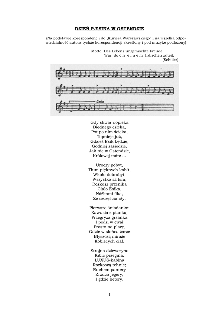 DZIEŃ P.ESIKA W OSTENDZIE (Na podstawie korespondencji do „Kuriera Warszawskiego” i na wszelką odpowiedzialność autora tychże korespondencji skreślony i pod muzykę podłożony) Motto: Des Lebens ungemischte Freude War do c h e i n e m Irdischen zuteil. (Schiller) Gdy skwar dopieka Biednego człeka, Pot po nim ścieka, Topnieje już, Gdzież Esik będzie, Godniej zasiędzie, Jak nie w Ostendzie, Królowej mórz ... Uroczy pobyt, Tłum pięknych kobit, Wkoło dobrobyt, Wszystko aż lśni; Rozkosz przenika Ciało Esika, Nóżkami fika, Ze szczęścia rży. Pierwsze śniadanko: Kawusia z pianką, Przegryza grzanką I pędzi w cwał Prosto na plażę, Gdzie w słońca żarze Błyszczą miraże Kobiecych ciał. Strojna dziewczyna Kibić przegina, LUXUS-kabina Rozkoszą tchnie; Ruchem pantery Zrzuca jegery, I gdzie hetery, 1 Tam Esik mknie. Barwne półświatki, Pulchne mężatki, Obcisłe gatki Śmieją się doń; Esik się nurza, Szczypie w odnóża, To znów jak burza Wciąga je w toń. Lecz dość na dziś z tym, Na piasku czystym Jeszcze „mój system” Przez minut sześć; Potem swobodnie Nakłada spodnie I nim ochłodnie, Pędzi coś zjeść. Ostryga tłusta Wpada mu w usta, Potem langusta, Potem chablis: Otwiera paszczę, Językiem mlaszcze, W brzuszek się głaszcze, I dalej ji. Znikł potraw szereg, Mały szlumerek, Potem spacerek Przez pyszną sień; Przybił do portu W cieniach abortu; Co tu komfortu: Uroczy dzień! Wychodzi letki Z cichej klozetki, Znów na kobietki Popatrzeć rad; Z tłumem się miesza, Gdzie strojna rzesza Gwarnie pospiesza Pięknym jest świat! Koncert w kurhauzie: Esik zdrzymał się, Budzi go w pauzie Oklasków szum; Potem nos wetka, Kędy ruletka, Stara kokietka, 2 Przywabia tłum. Złoto się toczy, Wszystko się tłoczy, Wyłażą oczy, W piersiach brak tchu Lecz Esik nie gra, Bo niechże przegra, Dałaby świekra Ruletkę mu! Tak niespożycie To szczęścia dzicię Studiuje życie I jego brud, Gdy wtem latarnie Gasną i gwarnie Wszystko się garnie Do tinglu wrót. Włazi i Esik W ten interesik; Figlarny biesik Jakiś go prze, Umoczyć usta Tam, gdzie rozpusta Najskrrrrytsze gusta Zgadywać śmie. Sala stłoczona, Dyszące łona, Nagie ramiona Wśród fraków tła; Tańczą skłębieni W ciasnej przestrzeni, Szampan się pieni, Muzyka gra. Dwa biusty snieżne Trą się, lubieżne, To znów, rozbieżne, Prężą się wstecz Płoną oblicza, Idzie m a c z i c z a, Zabawa bycza; „Baeczna - prosz paa - rzecz!” Trzęsie się buda, Pęka obłuda: Cóż to za uda! Esik aż drży; Pyta nieśmiele: „Ma toute belle ... Rajskie wesele ... 3 Quel est votre priź?” Spojrzy dziewczyna: Zamożna mina, Duża łysina I nóżki w „x”; „Bez długich krzyków Dla starych pryków Dziesięć ludwików C’est mon prix fix”. Nie głupi Esik Swój pularesik Zapina gdziesik, Ochłonął w mig; Płaci co żywo Za małe piwo, Z miną złośliwą Za drzwiami znikł. Wśród nocy chłodnej Po plaży modnej Idzie pogodny, Wolny od burz; Jeszcze dwie gruszki Zjadł do poduszki, Wyciągnął nóżki, I chrapie już! ... Pisane w r. 1907 4