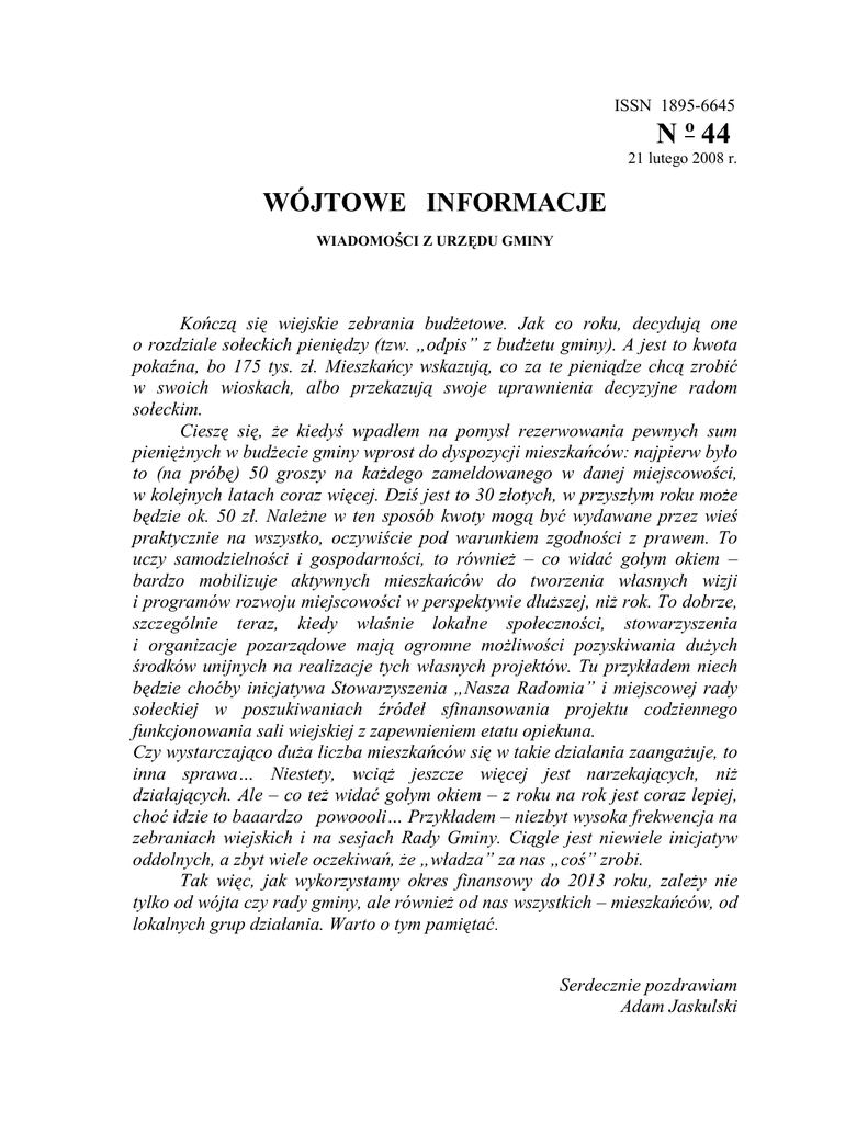 ISSN 1895-6645 N º 44 21 lutego 2008 r. WÓJTOWE INFORMACJE WIADOMOŚCI Z URZĘDU GMINY Kończą się wiejskie zebrania budŜetowe. Jak co roku, decydują one o rozdziale sołeckich pieniędzy (tzw. „odpis” z budŜetu gminy). A jest to kwota pokaźna, bo 175 tys. zł. Mieszkańcy wskazują, co za te pieniądze chcą zrobić w swoich wioskach, albo przekazują swoje uprawnienia decyzyjne radom sołeckim. Cieszę się, Ŝe kiedyś wpadłem na pomysł rezerwowania pewnych sum pienięŜnych w budŜecie gminy wprost do dyspozycji mieszkańców: najpierw było to (na próbę) 50 groszy na kaŜdego zameldowanego w danej miejscowości, w kolejnych latach coraz więcej. Dziś jest to 30 złotych, w przyszłym roku moŜe będzie ok. 50 zł. NaleŜne w ten sposób kwoty mogą być wydawane przez wieś praktycznie na wszystko, oczywiście pod warunkiem zgodności z prawem. To uczy samodzielności i gospodarności, to równieŜ – co widać gołym okiem – bardzo mobilizuje aktywnych mieszkańców do tworzenia własnych wizji i programów rozwoju miejscowości w perspektywie dłuŜszej, niŜ rok. To dobrze, szczególnie teraz, kiedy właśnie lokalne społeczności, stowarzyszenia i organizacje pozarządowe mają ogromne moŜliwości pozyskiwania duŜych środków unijnych na realizacje tych własnych projektów. Tu przykładem niech będzie choćby inicjatywa Stowarzyszenia „Nasza Radomia” i miejscowej rady sołeckiej w poszukiwaniach źródeł sfinansowania projektu codziennego funkcjonowania sali wiejskiej z zapewnieniem etatu opiekuna. Czy wystarczająco duŜa liczba mieszkańców się w takie działania zaangaŜuje, to inna sprawa… Niestety, wciąŜ jeszcze więcej jest narzekających, niŜ działających. Ale – co teŜ widać gołym okiem – z roku na rok jest coraz lepiej, choć idzie to baaardzo powoooli… Przykładem – niezbyt wysoka frekwencja na zebraniach wiejskich i na sesjach Rady Gminy. Ciągle jest niewiele inicjatyw oddolnych, a zbyt wiele oczekiwań, Ŝe „władza” za nas „coś” zrobi. Tak więc, jak wykorzystamy okres finansowy do 2013 roku, zaleŜy nie tylko od wójta czy rady gminy, ale równieŜ od nas wszystkich – mieszkańców, od lokalnych grup działania. Warto o tym pamiętać. Serdecznie pozdrawiam Adam Jaskulski Nowe kierownictwo ZPO Przedwcześnie zmarły Bolek Strzelczyk, ostatni kierownik Zespołu ds. Placówek Oświatowych, zawsze będzie przeze mnie, moich współpracowników, na pewno równieŜ przez nauczycieli i społeczeństwo gminy wspominany z wielkim ciepłem. Funkcji, którą tyle lat wspaniale sprawował, zgodziła się podjąć przejściowo pani ElŜbieta Lubieniecka. Robiła to z duŜym zaangaŜowaniem, ale w końcu „stanęła dęba”. BliŜsze jej są problemy księgowości, mniej – ogólno-menedŜerskie. Tak stwierdziła, zostało mi więc uznać jej ambicje przejścia juŜ wkrótce na stanowisko głównej księgowej Zespołu (pani Ania Łopuch niedługo odejdzie na emeryturę). To jest moŜliwe i zasadne, tak więc i sprawa jest jasna. W ten sposób powstaje jednak wakat na stanowisku kierownika tej jednostki organizacyjnej Gminy. Ogłosiłem więc nabór (konkurs) na kierownika ZPO. Termin składania ofert minął wczoraj. Zainteresowanych konkursem było 5 potencjalnych kandydatów, ale po szczegółowym zapoznaniu się z zakresem obowiązków kierownika aŜ czworo spośród nich nie zdecydowało się na start. Nowym kierownikiem Zespołu ds. Placówek Oświatowych został pan Krzysztof Stefański, który nie przestraszył się ogromu zadań. Cieszę się, bo to bardzo dobra kandydatura. Gratuluję serdecznie i Ŝyczę powodzenia ! Do końca roku szkolnego będzie jednak musiał jeszcze pracować na część etatu w szkole, ale juŜ od 1 lipca znajdziemy nowego kierownika wyłącznie w Zespole ds. Placówek Oświatowych, na pełnym etacie. Nagroda za wskazanie złodzieja Ze złodziejami kostki brukowej z okolic bunkrów walczymy od dawna. Raczej mało skutecznie. Co jeden zrezygnuje, to zjawia się następny. Podejmuję róŜne kroki, aby zniechęcić kaŜdego chętnego, który za przysłowiowe „pięć minut strachu” chce sobie wybrukować podjazd, wybudować grilla, itp. Teraz pora na kolejną inicjatywę: WYZNACZAM NAGRODĘ W WYSOKOŚCI 1.000 ZŁOTYCH ZA WSKAZANIE ZŁODZIEJA KOSTKI BRUKOWEJ. Potwierdzam: wyznaczam nagrodę w wysokości 1 tysiąca złotych za pomoc w ujęciu złodzieja. Jak ktoś powiedział, „pieniądze piechotą nie chodzą – one leŜą na bruku”. Dowody osobiste Powtarza się historia z końca ubiegłego roku. Jest obecnie spora kolejka po odbiór nowych dowodów osobistych, na wnioski składane w grudniu. Kończy się luty, a jeszcze około 250 osób nie złoŜyło dotychczas wniosku o nowy dowód! Co urzędników, ale głównie osoby spóźnialskie czeka w marcu? Stres, nerwówka, pretensje … Bardzo proszę – nie czekajmy na ostatni tydzień !!! Śmieci i ścieki AŜ przykro się robi, Ŝe wciąŜ musimy wracać do przepisów o utrzymaniu czystości w gminach. Kilka lat temu, posiadając zawarte umowy na zorganizowany wywóz odpadów przez właścicieli prawie wszystkich posesji, mogliśmy się cieszyć, Ŝe faktycznie zaczynamy dbać o czystość wokół siebie. Ale czas biegnie, inne gminy „podciągają się”, ogólne wymagania i rygory rosną, a u nas wciąŜ tak samo. A jeśli nie ma postępu, to się cofamy. StraŜ Gminna z uparciuchami „pracuje” na co dzień. Na naszej gminnej stronie internetowej w zakładce „StraŜ Gminna”, w załączniku „ewidencja wyników działań straŜy gminnej za rok 2007” czytamy m.in., Ŝe w sumie wykonano 536 kontroli, w wyniku których udzielono aŜ 259 pouczeń, nałoŜono tylko 25 mandatów, a zaledwie 8 spraw skierowano do sądu grodzkiego. I takie dotąd miały być działania StraŜy – nakierowane na edukację społeczeństwa, mało represyjne. Teraz profil działania musi się zmienić, bo czas nauki się kończy. Uprzedza