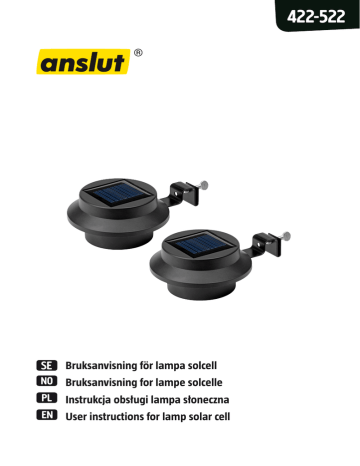422-522 Bruksanvisning för lampa solcell Bruksanvisning for lampe solcelle Instrukcja obsługi lampa słoneczna User instructions for lamp solar cell SE - NO - PL - EN - Bruksanvisning i original Bruksanvisning i original Instrukcja obsługi w oryginale Operating instructions in original Date of production: 2014-11-10 © Jula AB SVENSKA������������������������������������������������������������������������������������������������������������������ 4 SÄKERHETSANVISNINGAR����������������������������������������������������������������������������������������������������������������������4 TEKNISKA DATA ��������������������������������������������������������������������������������������������������������������������������������������4 montering��������������������������������������������������������������������������������������������������������������������������������������������4 HANDHAVANDE��������������������������������������������������������������������������������������������������������������������������������������4 NORSK���������������������������������������������������������������������������������������������������������������������� 7 SIKKERHETSANVISNINGER����������������������������������������������������������������������������������������������������������������������7 TEKNISKE DATA����������������������������������������������������������������������������������������������������������������������������������������7 MONTERING��������������������������������������������������������������������������������������������������������������������������������������������7 HÅNDTERING����������������������������������������������������������������������������������������������������������������������������������������� 8 POLSKI�������������������������������������������������������������������������������������������������������������������� 10 ZASADY BEZPIECZEŃSTWA��������������������������������������������������������������������������������������������������������������������10 DANE TECHNICZNE��������������������������������������������������������������������������������������������������������������������������������10 montaż������������������������������������������������������������������������������������������������������������������������������������������������10 OBSŁUGA������������������������