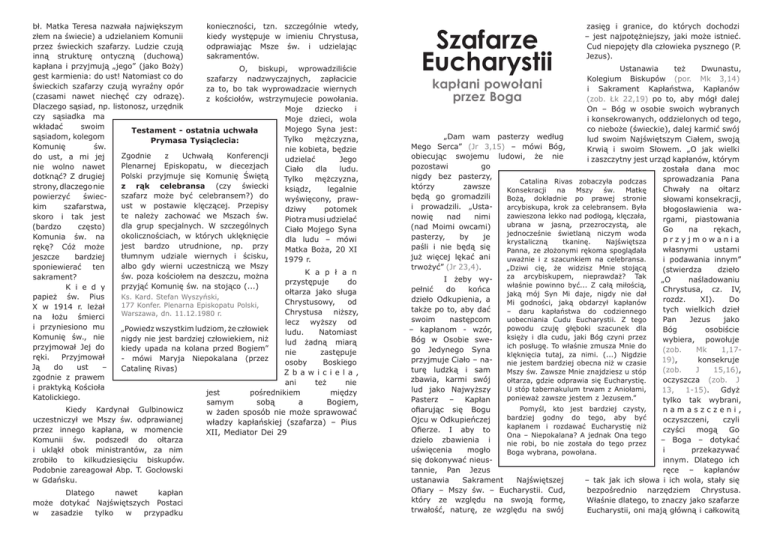 bł. Matka Teresa nazwała największym konieczności, tzn. szczególnie wtedy, złem na świecie) a udzielaniem Komunii kiedy występuje w imieniu Chrystusa, przez świeckich szafarzy. Ludzie czują odprawiając Msze św. i udzielając inną strukturę ontyczną (duchową) sakramentów. kapłana i przyjmują „jego” (jako Boży) O, biskupi, wprowadziliście gest karmienia: do ust! Natomiast co do szafarzy nadzwyczajnych, zapłacicie świeckich szafarzy czują wyraźny opór za to, bo tak wyprowadzacie wiernych (czasami nawet niechęć czy odrazę). z kościołów, wstrzymujecie powołania. Dlaczego sąsiad, np. listonosz, urzędnik Moje dziecko i czy sąsiadka ma Moje dzieci, wola wkładać swoim Mojego Syna jest: Testament - ostatnia uchwała sąsiadom, kolegom Tylko mężczyzna, Prymasa Tysiąclecia: Komunię św. nie kobieta, będzie Zgodnie z Uchwałą Konferencji do ust, a mi jej udzielać Jego Plenarnej Episkopatu, w diecezjach nie wolno nawet Ciało dla ludu. Polski przyjmuje się Komunię Świętą dotknąć? Z drugiej Tylko mężczyzna, z rąk celebransa (czy świecki strony, dlaczego nie ksiądz, legalnie szafarz może być celebransem?) do powierzyć świecwyświęcony, prawust w postawie klęczącej. Przepisy kim szafarstwa, dziwy potomek te należy zachować we Mszach św. skoro i tak jest Piotra musi udzielać dla grup specjalnych. W szczególnych (bardzo często) Ciało Mojego Syna okolicznościach, w których uklęknięcie Komunia św. na dla ludu – mówi jest bardzo utrudnione, np. przy rękę? Cóż może Matka Boża, 20 XI tłumnym udziale wiernych i ścisku, jeszcze bardziej 1979 r. albo gdy wierni uczestniczą we Mszy sponiewierać ten K a p ł a n św. poza kościołem na deszczu, można sakrament? przystępuje do przyjąć Komunię św. na stojąco (...) K i e d y ołtarza jako sługa Ks. Kard. Stefan Wyszyński, papież św. Pius Chrystusowy, od 177 Konfer. Plenarna Episkopatu Polski, X w 1914 r. leżał Chrystusa niższy, Warszawa, dn. 11.12.1980 r. na łożu śmierci lecz wyższy od i przyniesiono mu „Powiedz wszystkim ludziom, że człowiek ludu. Natomiast Komunię św., nie nigdy nie jest bardziej człowiekiem, niż lud żadną miarą przyjmował Jej do kiedy upada na kolana przed Bogiem” nie zastępuje ręki. Przyjmował - mówi Maryja Niepokalana (przez osoby Boskiego Ją do ust – Catalinę Rivas) Z b a w i c i e l a , zgodnie z prawem ani też nie i praktyką Kościoła jest pośrednikiem między Katolickiego. samym sobą a Bogiem, Kiedy Kardynał Gulbinowicz w żaden sposób nie może sprawować uczestniczył we Mszy św. odprawianej władzy kapłańskiej (szafarza) – Pius przez innego kapłana, w momencie XII, Mediator Dei 29 Komunii św. podszedł do ołtarza i ukląkł obok ministrantów, za nim zrobiło to kilkudziesięciu biskupów. Podobnie zareagował Abp. T. Gocłowski w Gdańsku. Dlatego nawet kapłan może dotykać Najświętszych Postaci w zasadzie tylko w przypadku Szafarze Eucharystii zasięg i granice, do których dochodzi – jest najpotężniejszy, jaki może istnieć. Cud niepojęty dla człowieka pysznego (P. Jezus). Ustanawia też Dwunastu, Kolegium Biskupów (por. Mk 3,14) i Sakrament Kapłaństwa, Kapłanów (zob. Łk 22,19) po to, aby mógł dalej On – Bóg w osobie swoich wybranych i konsekrowanych, oddzielonych od tego, co nieboże (świeckie), dalej karmić swój „Dam wam pasterzy według lud swoim Najświętszym Ciałem, swoją Mego Serca” (Jr 3,15) – mówi Bóg, Krwią i swoim Słowem. „O jak wielki obiecując swojemu ludowi, że nie i zaszczytny jest urząd kapłanów, którym pozostawi go została dana moc nigdy bez pasterzy, sprowadzania Pana Catalina Rivas zobaczyła podczas którzy zawsze Chwały na ołtarz Konsekracji na Mszy św. Matkę będą go gromadzili Bożą, dokładnie po prawej stronie słowami konsekracji, i prowadzili. „Ustaarcybiskupa, krok za celebransem. Była błogosławienia wazawieszona lekko nad podłogą, klęczała, nowię nad nimi rgami, piastowania ubrana w jasną, przezroczystą, ale (nad Moimi owcami) Go na rękach, jednocześnie świetlaną niczym woda pasterzy, by je p r z y j m o w ania krystaliczną tkaninę. Najświętsza paśli i nie będą się własnymi ustami Panna, ze złożonymi rękoma spoglądała już więcej lękać ani uważnie i z szacunkiem na celebransa. i podawania innym” trwożyć” (Jr 23,4). „Dziwi cię, że widzisz Mnie stojącą (stwierdza dzieło za arcybiskupem, nieprawdaż? Tak I żeby wy„O naśladowaniu właśnie powinno być... Z całą miłością, pełnić do końca Chrystusa, cz. IV, jaką mój Syn Mi daje, nigdy nie dał dzieło Odkupienia, a rozdz. XI). Do Mi godności, jaką obdarzył kapłanów także po to, aby dać tych wielkich dzieł – daru kapłaństwa do codziennego swoim następcom Pan Jezus jako uobecniania Cudu Eucharystii. Z tego powodu czuję głęboki szacunek dla – kapłanom - wzór, Bóg osobiście księży i dla cudu, jaki Bóg czyni przez Bóg w Osobie swewybiera, powołuje ich posługę. To właśnie zmusza Mnie do go Jedynego Syna (zob. Mk 1,17klęknięcia tutaj, za nimi. (...) Nigdzie przyjmuje Ciało – na19), konsekruje nie jestem bardziej obecna niż w czasie turę ludzką i sam (zob. J 15,16), Mszy św. Zawsze Mnie znajdziesz u stóp zbawia, karmi swój oczyszcza (zob. J ołtarza, gdzie odprawia się Eucharystię. U stóp tabernakulum trwam z Aniołami, lud jako Najwyższy 13, 1-15). Gdyż ponieważ zawsze jestem z Jezusem.” Pasterz – Kapłan tylko tak wybrani, Pomyśl, kto jest bardziej czysty, ofiarując się Bogu namaszczeni, bardziej godny do tego, aby być Ojcu w Odkupieńczej oczyszczeni, czyli kapłanem i rozdawać Eucharystię niż Ofierze. I aby to czyści mogą Go Ona – Niepokalana? A jednak Ona tego dzieło zbawienia i – Boga – dotykać nie robi, bo nie została do tego przez uświęcenia mogło i przekazywać Boga wybrana, powołana. się dokonywać nieusinnym. Dlatego ich tannie, P