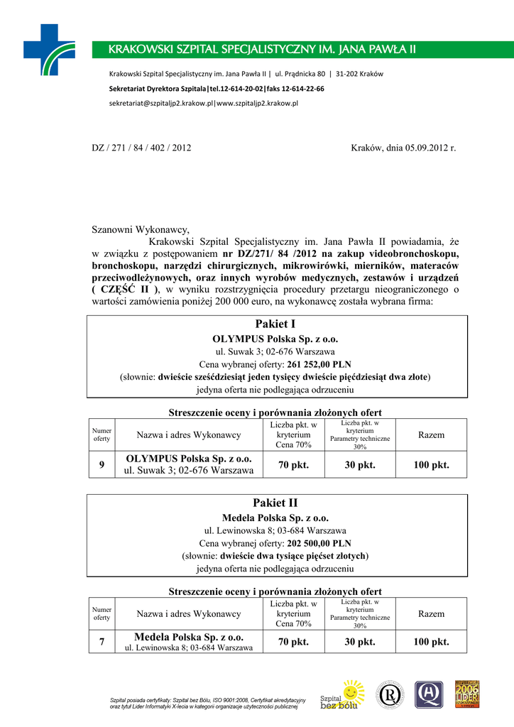 Krakowski Szpital Specjalistyczny im. Jana Pawła II | ul. Prądnicka 80 | 31-202 Kraków Sekretariat Dyrektora Szpitala|tel.12-614-20-02|faks 12-614-22-66 [email protected]|www.szpitaljp2.krakow.pl DZ / 271 / 84 / 402 / 2012 Kraków, dnia 05.09.2012 r. Szanowni Wykonawcy, Krakowski Szpital Specjalistyczny im. Jana Pawła II powiadamia, Ŝe w związku z postępowaniem nr DZ/271/ 84 /2012 na zakup videobronchoskopu, bronchoskopu, narzędzi chirurgicznych, mikrowirówki, mierników, materaców przeciwodleŜynowych, oraz innych wyrobów medycznych, zestawów i urządzeń ( CZĘŚĆ II ), w wyniku rozstrzygnięcia procedury przetargu nieograniczonego o wartości zamówienia poniŜej 200 000 euro, na wykonawcę została wybrana firma: Pakiet I OLYMPUS Polska Sp. z o.o. ul. Suwak 3; 02-676 Warszawa Cena wybranej oferty: 261 252,00 PLN (słownie: dwieście sześćdziesiąt jeden tysięcy dwieście pięćdziesiąt dwa złote) jedyna oferta nie podlegająca odrzuceniu Streszczenie oceny i porównania złoŜonych ofert Numer oferty Nazwa i adres Wykonawcy Liczba pkt. w kryterium Cena 70% Liczba pkt. w kryterium Parametry techniczne 30% Razem 9 OLYMPUS Polska Sp. z o.o. ul. Suwak 3; 02-676 Warszawa 70 pkt. 30 pkt. 100 pkt. Pakiet II Medela Polska Sp. z o.o. ul. Lewinowska 8; 03-684 Warszawa Cena wybranej oferty: 202 500,00 PLN (słownie: dwieście dwa tysiące pięćset złotych) jedyna oferta nie podlegająca odrzuceniu Streszczenie oceny i porównania złoŜonych ofert Numer oferty 7 Nazwa i adres Wykonawcy Medela Polska Sp. z o.o. ul. Lewinowska 8; 03-684 Warszawa Liczba pkt. w kryterium Cena 70% Liczba pkt. w kryterium Parametry techniczne 30% Razem 70 pkt. 30 pkt. 100 pkt. Krakowski Szpital Specjalistyczny im. Jana Pawła II | ul. Prądnicka 80 | 31-202 Kraków Sekretariat Dyrektora Szpitala|tel.12-614-20-02|faks 12-614-22-66 [email protected]|www.szpitaljp2.krakow.pl Pakiet III OLYMPUS Polska Sp. z o.o. ul. Suwak 3; 02-676 Warszawa Cena wybranej oferty: 49 649,76 PLN (słownie: czterdzieści dziewięć tysięcy sześćset czterdzieści dziewięć 76/100) jedyna oferta nie podlegająca odrzuceniu Streszczenie oceny i porównania złoŜonych ofert Liczba pkt. w kryterium Numer oferty Nazwa i adres Wykonawcy 9 OLYMPUS Polska Sp. z o.o. ul. Suwak 3; 02-676 Warszawa Cena 70% Liczba pkt. w kryterium Parametry techniczne 30% Razem 30 pkt. 100 pkt. 70 pkt. Pakiet IV Eppendorf Poland Sp. z o.o. Al. Jerozolimskie 212; 02-486 Warszawa Cena wybranej oferty: 4 243,31 PLN (słownie: cztery tysiące dwieście czterdzieści trzy 31/100) jedyna oferta nie podlegająca odrzuceniu Streszczenie oceny i porównania złoŜonych ofert Numer oferty 5 Nazwa i adres Wykonawcy Eppendorf Poland Sp. z o.o. Al. Jerozolimskie 212; 02-486 Warszawa Liczba pkt. w kryterium Cena 70% Liczba pkt. w kryterium Parametry techniczne 30% Razem 70 pkt. 30 pkt. 100 pkt. Pakiet V Aesculap Chifa Sp. z o.o. ul. Tysiąclecia 14; 64-300 Nowy Tomyśl Cena wybranej oferty: 26 767,26 PLN (słownie: dwadzieścia sześć tysięcy siedemset sześćdziesiąt siedem 26/100) jedyna oferta nie podlegająca odrzuceniu Streszczenie oceny i porównania złoŜonych ofert Numer oferty 11 Nazwa i adres Wykonawcy Aesculap Chifa Sp. z o.o. ul. Tysiąclecia 14; 64-300 Nowy Tomyśl Liczba pkt. w kryterium Cena 100% 100 pkt. Razem 100 pkt. Krakowski Szpital Specjalistyczny im. Jana Pawła II | ul. Prądnicka 80 | 31-202 Kraków Sekretariat Dyrektora Szpitala|tel.12-614-20-02|faks 12-614-22-66 [email protected]|www.szpitaljp2.krakow.pl Pakiet VI Aesculap Chifa Sp. z o.o. ul. Tysiąclecia 14; 64-300 Nowy Tomyśl Cena wybranej oferty: 1 468,80 PLN (słownie: jeden tysiąc czterysta sześćdziesiąt osiem 80/100) jedyna oferta nie podlegająca odrzuceniu Streszczenie oceny i porównania złoŜonych ofert Numer oferty 11 Liczba pkt. w kryterium Nazwa i adres Wykonawcy Cena 100% Aesculap Chifa Sp. z o.o. 100 pkt. ul. Tysiąclecia 14; 64-300 Nowy Tomyśl Razem 100 pkt. Pakiet nr VII Pakiet uniewaŜniono na podstawie art. 93 ust. 1 pkt. 1 ustawy Prawo zamówień publicznych - nie złoŜono Ŝadnej oferty niepodlegającej odrzuceniu. Pakiet IX abcMED Sp. z o.o. ul. J. Lea 114; 30-133 Kraków Cena wybranej oferty: 79 224,48 PLN (słownie: siedemdziesiąt dziewięć tysięcy dwieście dwadzieścia cztery 48/100) jedyna oferta nie podlegająca odrzuceniu Streszczenie oceny i porównania złoŜonych ofert Numer oferty 3 Nazwa i adres Wykonawcy abcMED Sp. z o.o. ul. J. Lea 114; 30-133 Kraków Liczba pkt. w kryterium Cena 100% 100 pkt. Razem 100 pkt. Krakowski Szpital Specjalistyczny im. Jana Pawła II | ul. Prądnicka 80 | 31-202 Kraków Sekretariat Dyrektora Szpitala|tel.12-614-20-02|faks 12-614-22-66 [email protected]|www.szpitaljp2.krakow.pl Pakiet X KONKRET Dagmara Fik, Marcin Mazurkiewicz Spółka Jawna ul. Dworcowa 15a; 86-200 Chełmno Cena wybranej oferty: 86 886,00 PLN (słownie: osiemdziesiąt sześć tysięcy osiemset osiemdziesiąt sześć złotych) jedyna oferta nie podlegająca odrzuceniu Streszczenie oceny i porównania złoŜonych ofert Numer oferty Nazwa i adres Wykonawcy Liczba pkt. w kryterium Cena 70% Liczba pkt. w kryterium Parametry techniczne 30% Razem 70 pkt. 30 pkt. 100 pkt. KONKRET Dagmara Fik, Marcin 10 Mazurkiewicz Spółka Jawna ul. Dworcowa 15a; 86-200 Chełmno Pakiet XI PROMED S.A. ul. Krajewskiego 1B; 01-520 Warszawa Cena wybranej oferty: 30 024,00 PLN (słownie: trzydzieści tysięcy dwadzieścia cztery złote) jedyna oferta nie podlegająca odrzuceniu Streszczenie oceny i porównania złoŜonych ofert Numer oferty 8 Nazwa i adres Wykonawcy Liczba pkt. w kryterium Cena 100% PROMED S.A. 100 pkt. ul. Krajewskiego 1B; 01-520 Warszawa Razem 100 pkt. Pakiet XII MEDLINE Sp. z o.o. ul. Fabryczna 17; 65-410 Zielona Góra Cena wybranej oferty: 9 522,66 PLN (słownie: dziewięć tysięcy pięćset dwadzieścia dwa 66/100) jedyna oferta nie podlegająca odrzuceniu Streszczenie oceny i porównania złoŜonych ofert Numer oferty 6 Nazwa i adres Wykonawcy M