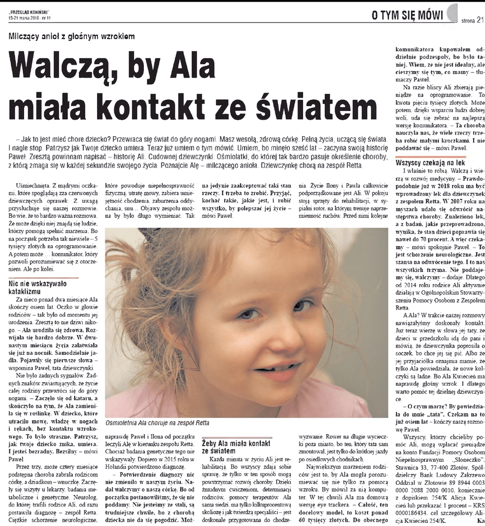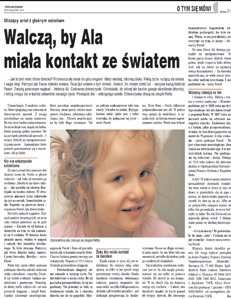 .PRZEGLĄD KONIŃSKI" O TYM SIĘ MÓWI 15-21 marca 2016 nr 11 strona 21 Milczący anioł z głośnym wzrokiem Walczą, by Ala miała kontakt ze światem - Jak to jest mieć chore dziecko? Przewraca się świat do góry nogami. Masz wesołą, zdrową córkę. Pełną życia, uczącą się świata. I nagle stop. Patrzysz jak Twoje dziecko umiera. Teraz już umiem o tym mówić. Umiem, bo minęło sześć lat - zaczyna swoją historię Paweł. Zresztą powinnam napisać - historię Ali. Cudownej dziewczynki. Ośmiolatki, do której tak bardzo pasuje określenie choroby, z którą zmaga się w każdej sekundzie swojego życia. Poznajcie Alę - milczącego anioła. Dziewczynkę chorą na zespół Retta. Uśmiechnięta. Z mądrymi oczka mi, które spoglądają zza czerwonych dziewczęcych oprawek. Z uwagą przysłuchuje się naszej rozmowie. Bo wie, że to bardzo ważna rozmowa. Że może dzięki niej znajdą się ludzie, którzy pomogą spełnić marzenia. Bo na początek potrzeba tak niewiele - 5 tysięcy złotych na oprogramowanie. A potem m oże... komunikator, który pozwoli porozumiewać się z otocze niem. Ale po kolei. które powroduje niepełnosprawność fizyczną, utratę mowy, zabiera umie jętność chodzenia, zaburzenia oddy chania, snu... Objawy zespołu moż na by było długo wymieniać. Tak na jedynie zaakceptować taki stan rzeczy. I trzeba to zrobić. Przyjąć, kochać takie, jakie jest, i robić wszystko, by polepszać jej życie mówi Paweł. nia. Życie Dony i Pawła całkowicie podporządkowane jest Ali. W pokoju stoją sprzęty do rehabilitacji, w sy pialni rotor, na którym trenuje naprzemienność ruchów. Przed nimi kolejne Nic nie wskazywało kataklizmu Za nieco ponad dwa miesiące Ala skończy osiem lat. Oczko w głowie rodziców - tak było od momentu jej urodzenia. Zresztą to nie dziwi niko go. -A la urodziła się zdrowa. Roz wijała się bardzo dobize. W dwu nastym miesiącu żyda załatwiała się już na nocnik. Samodzielnie ja dła. Pojawiły się pierwsze słowa wspomina Paweł, tata dziewczynki. Nie było żadnych sygnałów. Żad nych znaków zwiastuj ących, że życie całej rodziny przewróci się do góry nogami. - Zaczęło się od kataru, a skończyło na tym. że Ala zamieni ła się w roślinkę. \Y dziecko, które utraciło mowę, władzę w nogach i rękach, bez kontaktu wzroko wego. To było straszne. Patrzysz, ja k twoje dziecko znika, umiera. I jesteś bezradny. Bezsilny - mówi Paweł. Przez trzy, może cztery miesiące podstępna choroba zabrała rodzicom córkę, a dziadkom-wnuczkę. Zaczę ty się wizyty u lekarzy, badania me taboliczne i genetyczne. Neurolog, do której trafili rodzice Ali, od razu postawiła diagnozę - zespól Retta. Ciężkie schorzenie neurologiczne. Ośmioletnia Ala choruje na zespół Retta naprawdę Paweł i Ilona od początku leczyli Alę w kierunku zespołu Retta. Chociaż badania genetyczne tego nie wskazywały. Dopiero w 2015 roku w Holandii potwierdzono diagnozę. - Potwierdzenie diagnozy nic nie zmieniło w naszym życiu. Na dal w alczymy o naszą córkę. Bo od początku postanowiliśmy, że się nie poddamy. Nie jesteśmy ze stali, są trudniejsze chwile, bo z chorobą dziecka nie da się pogodzić. Moż Żeby Ala miała kontakt ze światem Każda minuta w życiu Ali jest re habilitacją. Bo wszyscy zdają sobie sprawę, że tylko w ten sposób mogą pow'strzymać rozwój choroby. Dzięki żmudnym ćwiczeniom, determinacji rodziców, pomocy terapeutów' Ala sama siedzi, ma tylko kilkuprocentową skoliozę i jak twierdzą specjaliści-jest doskonale przygotowrana do chodze wyzwanie. Rower na długie wyciecz ki poza miasto, bo ten. który tata sam zmontował, jest tylko do krótkiej jazdy po osiedlowych chodnikach. Największym marzeniem rodzi ców' jest to, by Ala mogła porozu miewać się nie tylko za pomocą wzroku. By mówił za nią kompu ter. W tej chwili Ala ma domową wersję eye trackera. - Całość, ten docelowy model, to koszt ponad 60 tysięcy złotych. Do obecnego kom unikatora kupow ałem od dzielnie podzespoły, bo było ta niej. Wiem, ze nie jest idealny, ale cieszymy się tym, co mam y - tłu maczy Paweł. Na razie bliscy Ali zbieraj ą pie niądze na oprogramowanie. To kwota pięciu tysięcy złotych. Może potem, dzięki w'sparciu ludzi dobrej woli, uda się zebrać na najlepszą wersję komunikatora. - Ta choroba nauczyła nas, że wiele rzeczy trze ba robić małymi kroczkami. I nie poddaw ać się - mówi Paweł. Wszyscy czekają na lek I właśnie to robią. Walczą i wie rzą w rozwój medycyny. - Prawdo podobnie już w 2018 roku ma być wprow adzony lek dla dziewczynek z zespołem Retta. W 2007 roku na myszach udało się odwrócić na stępstwa choroby. Znaleziono lek, a z badań, jakie przeprowadzono, wynika, że stan dzieci poprawia się nawet do 70 procent. A więc czeka my - mówi spokojnie Pawreł. - To jest schorzenie neurologiczne. Jest szansa na odwrócenie tego. I to nas wszystkich trzyma. Nie poddaje my się, walczymy - dodaje. Dlatego od 2014 roku rodzice Ali aktywnie działaj ą wr Ogólnopolskim Stowarzy szeniu Pomocy Osobom z Zespołem Retta. A Ala? W trakcie naszej rozmowy nawiązałyśmy doskonały kontakt. Już teraz wierzę w słowra jej taty, że dzieci w przedszkolu idą do pani i mówią, że dziewczynka poprosiła o soczek, bo chce jej się pić. Albo że jej przyjaciółka oznajmia mamie, że tylko Ala powiedziała, że nowre kol czyki są ładne. Bo Ala Kwiecień ma napraw'de głośny w'zrok. I dlatego warto pomóc tej dzielnej dziewczyn ce. - O czym m aizę? By powiedzia ła do mnie „tata”. Czekam na to już osiem lat - kończy naszą rozmo wę Paweł. Wszyscy, którzy chcieliby po móc Ali, mogą wpłacać pieniądze na konto Fundacji Pomocy Osobom Niepełnosprawnym „Słoneczko”. Stawnica 33, 77-400 Złotów'. Spół dzielczy Bank Ludowy Zakrzewo Oddział w Złotowie 89 8944 0003 0000 2088 2000 0010, koniecznie z dopiskiem 254/K Alicja Kwie cie