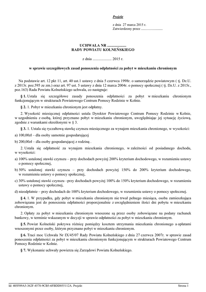 Projekt z dnia 27 marca 2015 r. Zatwierdzony przez ......................... UCHWAŁA NR .................... RADY POWIATU KOLNEŃSKIEGO z dnia .................... 2015 r. w sprawie szczegółowych zasad ponoszenia odpłatności za pobyt w mieszkaniu chronionym Na podstawie art. 12 pkt 11, art. 40 ust.1 ustawy z dnia 5 czerwca 1998r. o samorządzie powiatowym ( tj. Dz.U. z 2013r. poz.595 ze zm.) oraz art. 97 ust. 5 ustawy z dnia 12 marca 2004r. o pomocy społecznej ( tj. Dz.U. z 2015r., poz.163) Rada Powiatu Kolneńskiego uchwala, co następuje: § 1. Ustala się szczegółowe zasady ponoszenia odpłatności za pobyt w mieszkaniu funkcjonującym w strukturach Powiatowego Centrum Pomocy Rodzinie w Kolnie. chronionym § 2. 1. Pobyt w mieszkaniu chronionym jest odpłatny. 2. Wysokość miesięcznej odpłatności ustala Dyrektor Powiatowego Centrum Pomocy Rodzinie w Kolnie, w uzgodnieniu z osobą, której przyznano pobyt w mieszkaniu chronionym, uwzględniając jej sytuację życiową, zgodnie z warunkami określonymi w § 3. § 3. 1. Ustala się ryczałtową stawkę czynszu miesięcznego za wynajem mieszkania chronionego, w wysokości: a) 100,00zł – dla osoby samotnie gospodarującej b) 200,00zł – dla osoby gospodarującej z rodziną . 2. Ustala się odpłatność za wynajem mieszkania chronionego, w zależności od posiadanego dochodu, w wysokości: a) 100% ustalonej stawki czynszu – przy dochodach powyżej 200% kryterium dochodowego, w rozumieniu ustawy o pomocy społecznej, b) 50% ustalonej stawki czynszu – przy dochodach powyżej 150% do 200% kryterium dochodowego, w rozumieniu ustawy o pomocy społecznej, c) 30% ustalonej stawki czynszu –przy dochodach powyżej 100% do 150% kryterium dochodowego, w rozumieniu ustawy o pomocy społecznej, d) nieodpłatnie – przy dochodach do 100% kryterium dochodowego, w rozumieniu ustawy o pomocy społecznej. § 4. 1. W przypadku, gdy pobyt w mieszkaniu chronionym nie trwał pełnego miesiąca, osoba zamieszkująca zobowiązana jest do ponoszenia odpłatności proporcjonalnie z uwzględnieniem ilości dni pobytu w mieszkaniu chronionym. 2. Opłaty za pobyt w mieszkaniu chronionym wnoszone są przez osoby zobowiązane na podany rachunek bankowy, w terminie wskazanym w decyzji w sprawie odpłatności za pobyt w mieszkaniu chronionym. § 5. Powiat Kolneński pokrywa różnicę pomiędzy kosztem utrzymania mieszkania chronionego a opłatami wnoszonymi przez osoby, którym przyznano pobyt w mieszkaniu chronionym. § 6. Traci moc Uchwała Nr IX/45/07 Rady Powiatu Kolneńskiego z dnia 27 czerwca 2007r. w sprawie zasad ponoszenia odpłatności za pobyt w mieszkaniu chronionym funkcjonującym w strukturach Powiatowego Centrum Pomocy Rodzinie w Kolnie. § 7. Wykonanie uchwały powierza się Zarządowi Powiatu Kolneńskiego. Id: 405F09A5-362F-4578-9CB5-6FBDD055112A. Projekt Strona 1 § 8. Uchwala podlega ogłoszeniu w Dzienniku Urzędowym Województwa Podlaskiego i wchodzi w życie po upływie 14 dni od dnia jej ogłoszenia. Przewodniczacy Rady Andrzej Mieczkowski Id: 405F09A5-362F-4578-9CB5-6FBDD055112A. Projekt Strona 2