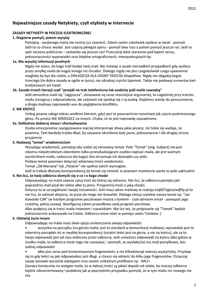 2012 Najważniejsze zasady Netykiety, czyli etykiety w Internecie ZASADY NETYKIETY W POCZCIE ELEKTRONICZNEJ 1. Najpierw pomyśl, potem wysyłaj Pamiętaj - wysłanego maila nie można już zawrócid. Zatem zanim cokolwiek wyślesz w świat - pomyśl. Jeśli to co chcesz wysład jest częścią jakiegoś sporu - pomyśl dwa razy a potem pomyśl jeszcze raz. Jeśli to spór toczony publicznie – zastanów się jeszcze raz! Przeczytaj tekst starannie pod kątem sensu, jednoznaczności wypowiedzi oraz błędów ortograficznych, interpunkcyjnych itp. 1a. Nie wysyłaj informacji poufnych Nigdy nie wiesz, do kogo trafi kiedyś twój mail. Nie mówiąc o wcale nierzadkich przypadkach gdy wyślesz przez omyłkę maila do kogoś innego niż chciałeś. Dlatego nigdy nie pisz czegokolwiek czego ujawnienie mogłoby by byd dla ciebie, a ZWŁASZCZA DLA OSOBY TRZECIEJ kłopotliwe. Nigdy nie obgaduj kogoś trzeciego (to dobra zasada w ogóle w życiu), nie zdradzaj czyichś tajemnic. Także nie podawaj numerów kart kredytowych ani haseł. 1b. Zasada trzech iteracji czyli "przejdź na tryb telefoniczny lub osobisty jeśli maile zawodzą" Jeśli atmosfera maili się "zagęszcza", stosowane są coraz mocniejsze argumenty, to najpóźniej przy trzecim mailu zrezygnuj z odpowiadania, ale zadzwoo lub spotkaj się z tą osobą. Dojdziesz wtedy do porozumienia, a droga mailowa zaprowadzi was do pogłębienia kionfliktu. 2. NIE KRZYCZ Unikaj pisania całego tekstu wielkimi literami, gdyż jest to powszechnie rozumiane jak użycie podniesionego głosu. Po prostu NIE WRZESZCZ na innych. Chyba, że to jest naprawdę uzasadnione. 2a. Delikatnie dobieraj słowa i sformułowania Osoba emocjonalnie zaangażowana inaczej interpretuje słowa jakie piszesz, niż tobie się wydaje, że powinna. Tym bardziej trzeba dbad, by używane określenia były jasne, jednoznaczne i dla drugiej strony przyjemne. 3. Nadawaj "temat" wiadomościom Wysyłając wiadomośd, pamiętaj aby nadad jej sensowny temat. Pole "Temat" (ang. Subject) nie jest nikomu-niepotrzebnym-okienkiem-tylko-przeszkadzającym-szybko-napisad-maila, ale jest ważnym wyróżnikiem maila, zwłaszcza dla kogoś, kto otrzymuje ich dziesiątki czy setki. Podany temat powinien dotyczyd właściwej treści wiadomości. Temat „Od Mariana” lub „Pytanie” nie spełnia takich wymogów. Jeśli w trakcie dłuższej korespondencji jej temat się zmienił, w pewnym momencie warto to pole uaktualnid. 4. Nie licz, że twój odbiorca domyśli się o co i o kogo chodzi Odpowiadając na maila zawsze cytuj treśd do której się odnosisz. Nie licz, że odbiorca pamięta jaki poprzednio mail pisał do ciebie albo ty jemu. Przypomnij treśd o jaką chodzi. Dotyczy to w szczególności twojej tożsamości. Jeśli masz adres mailowy w rodzaju [email protected] to nie licz, że adresat skojarzy, że pisze do niego Jan Kowalski. Dlatego stosuj czytelne nazwy konta np. "Jan Kowalski CdR" (w każdym programie pocztowym można z kontem - czyli adresem email - powiązad jego czytelną, pełną nazwę). Skonfiguruj zatem prawidłowo swój program pocztowy. Albo podpisuj się w treści maila imieniem i nazwiskiem. Nie licz też, że podpisanie się "Tomek" będzie jednoznacznie wskazywało na Ciebie. Odbiorca może mied w pamięci wielu Tomków :) 5. Ułatwiaj życie innym Odpowiadając na maila masz dwie opcje umieszczania swojej odpowiedzi: • wszystko na początku (na górze) maila; jest to standard w komunikacji mailowej; wprawdzie jest to odwrotny porządek niż w zwykłej korespondencji (ostatni tekst jest na górze, a nie na koocu), ale za to twoja odpowiedź jest od razu widoczna przez odbiorcę. Jeśli umieścisz odpowiedź na koocu albo gdzieś w środku maila, to odbiorca może tego nie zauważyd, i pomyśli, że wysłałeś/aś mu mail pomyłkowo, bez żadnej odpowiedzi • albo pisz zaraz pod komentowanym fragmentem, a nie kilkadziesiąt wierszy wyżej/niżej. Przydaje się to gdy tekst na jaki odpowiadasz jest długi, a chcesz się odnieśd do kilku jego fragmentów. Oznaczaj swoje wstawki wyraźnie odstępem oraz swoim unikalnym prefiksem np. WK1> Zaznacz koniecznie na wstępie maila, że w dalszej treści są jakieś dopiski od ciebie, bo inaczej odbiorca będzie zdezorientowany i podobnie jak w poprzednim przypadku pomyśli, że w tym mailu nic nowego nie ma. 1 2012 Staraj się pomijad niepotrzebne fragmenty z poprzednich wypowiedzi, skracaj maila, wstawiając oznaczenie (...). Ale nie tak, by nie było wiadomo o co chodzi. Nie zakładaj, że każdy będzie pamiętał, co pisałeś w poprzednim mailu. 6. Nie spamuj Nie rozsyłaj żadnych reklam bądź innych informacji do odbiorców, którzy wcześniej nie wyrazili zgody na taka korespondencję. Takie masowe wysyłanie listów często przynosi efekt odwrotny od zamierzonego, a do tego jest sprzeczne z aktualnie obowiązującym prawem. 6a. Weryfikuj listy adresatów Czyli wysyłaj maile tylko tym osobom, których te maile rzeczywiście dotyczą. Usuwaj z listy niepotrzebne adresy. 6b. Szanuj czyjąś prywatnośd Nie rozszerzaj listy adresatów. Zwłaszcza jeśli ktoś w trakcie wymiany zdao zawęził listę adresatów i napisał tylko do Ciebie. Odpisz mu osobiście, a gdybyś chciał rozszerzyd listę, zapytaj czy możesz. 7. Nie wysyłaj łaocuszków Nie rozsyłaj żadnych łaocuszków, a jeżeli, to tylko takie, które sprawdziłeś/aś osobiście, że są autentyczne. Opinia twojej koleżanki od której dostałeś maila może byd tu niewystarczająca. Dobra wiadomośd: wystarczy przekopiowad do Googli fragment podejrzanego tekstu (Ctrl-C, Ctrl-V) i najczęściej od razu dostaniesz odpowiedź, że to łaocuszek krążący po sieci od miesięcy albo... już od lat. 7a. Jeśli już wysłałeś łaocuszek... Nie obrażaj się, jeśli dostaniesz od kogoś uwagę, albo tzw. rózgę. Wyślij krótkie przeprosiny, oraz skontaktuj się z osobami, które przysłały ci łaocuszek, żeby i one posłały wstecznie przeprosiny. Pr