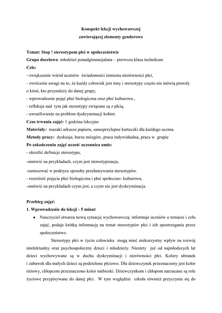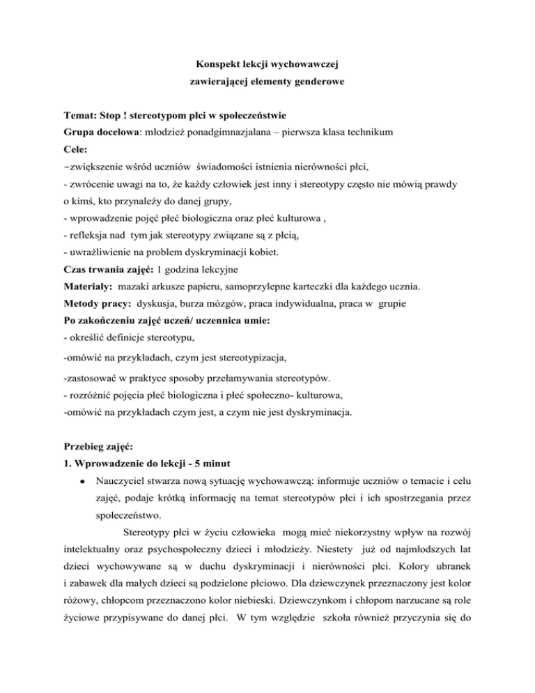 Konspekt lekcji wychowawczej zawierającej elementy genderowe Temat: Stop ! stereotypom płci w społeczeństwie Grupa docelowa: młodzież ponadgimnazjalana – pierwsza klasa technikum Cele: -zwiększenie wśród uczniów świadomości istnienia nierówności płci, - zwrócenie uwagi na to, że każdy człowiek jest inny i stereotypy często nie mówią prawdy o kimś, kto przynależy do danej grupy, - wprowadzenie pojęć płeć biologiczna oraz płeć kulturowa , - refleksja nad tym jak stereotypy związane są z płcią, - uwrażliwienie na problem dyskryminacji kobiet. Czas trwania zajęć: 1 godzina lekcyjne Materiały: mazaki arkusze papieru, samoprzylepne karteczki dla każdego ucznia. Metody pracy: dyskusja, burza mózgów, praca indywidualna, praca w grupie Po zakończeniu zajęć uczeń/ uczennica umie: - określić definicje stereotypu, -omówić na przykładach, czym jest stereotypizacja, -zastosować w praktyce sposoby przełamywania stereotypów. - rozróżnić pojęcia płeć biologiczna i płeć społeczno- kulturowa, -omówić na przykładach czym jest, a czym nie jest dyskryminacja. Przebieg zajęć: 1. Wprowadzenie do lekcji - 5 minut Nauczyciel stwarza nową sytuację wychowawczą: informuje uczniów o temacie i celu zajęć, podaje krótką informację na temat stereotypów płci i ich spostrzegania przez społeczeństwo. Stereotypy płci w życiu człowieka mogą mieć niekorzystny wpływ na rozwój intelektualny oraz psychospołeczny dzieci i młodzieży. Niestety już od najmłodszych lat dzieci wychowywane są w duchu dyskryminacji i nierówności płci. Kolory ubranek i zabawek dla małych dzieci są podzielone płciowo. Dla dziewczynek przeznaczony jest kolor różowy, chłopcom przeznaczono kolor niebieski. Dziewczynkom i chłopom narzucane są role życiowe przypisywane do danej płci. W tym względzie szkoła również przyczynia się do powielania stereotypów. Dyskusje nad charakterem płci trwają od wielu lat. Badaczki feministyczne posługują się podziałem na płeć biologiczną (ang. sex) i płeć społecznokulturową (ang. gender). Płeć biologiczna to cielesny wymiar płciowości, natomiast płeć społecznokulturowa to zespół cech płciowych, które jednostka nabywa w toku wychowania i przebywania w określonej kulturze. W ramach tego podziału określana jest różnica płci. Kobiety określane są poprzez pryzmat kobiecych cech narządów rozrodczych, kobiecej budowy ciała itd., posiadające dodatkowo określone cechy społeczno-kulturowe. Analogicznie definiuje się mężczyzn. Dzisiejszy temat zajęć jest ważny, ponieważ, w relacjach międzygrupowych bardzo często patrzymy na siebie przez pryzmat stereotypów. A stereotyp to wyidealizowany, uproszczony obraz własnej grupy oraz równie jednostronna, upraszczająca i negatywna wizja innych grup. Stereotyp wprowadza nieufność i wrogość oraz wiedzie do uprzedzeń i dyskryminacji między ludźmi. 2. Ćwiczenie: Stereotyp – co to takiego?- jak im przeciwdziałać? – 10 minut Cel : Wypracowanie definicji stereotypu, uświadomienie inności każdego człowieka, zwrócenie uwagi na fakt, że posługiwanie się stereotypami płci, często spycha człowieka do uproszczeń w ocenie. Przebieg ćwiczenia: Dzielimy uczniów na pary, każda para otrzymuje dwie kartki na jednej uczniowie zapisują wypracowaną definicję stereotypu, na drugiej kartce podany jest przykład stereotypu. Przykłady stereotypów: 1 Osoby rude są zawsze fałszywe. 2. Wszyscy Murzyni są czarni. 3. Wszyscy Niemcy są fałszywi. 4. Wszyscy chudzi są niejaki. 5. Wszyscy Żydzi mają żyłkę do interesów. 6. Kobiety są mniej sprawne intelektualnie od mężczyzn. 7. Murzyni mają wrodzone poczucie rytmu. 8. Baby do garów. Polecenie nauczyciela: Na podstawie przeprowadzonej rozmowy w parze, wypracuj definicję stereotypu oraz argumenty, które udowodnią, że podany przykład stereotypu jest krzywdzący i niesprawiedliwy w odniesieniu do grupy, której dotyczy. Opracowana definicja i argumenty zostaną umieszczone na tablicy i przedstawione na forum klasy. Podsumowując Po wypracowaniu przez uczniów jednej wspólnej definicji stereotypu, argumentów ,które mogą obalić stereotypowe przekonania, prosimy o zastanowienie się i udzielenie odpowiedzi na postawione pytania: Czym jest stereotyp dotyczący płci? Proszę o przykłady, Skąd przychodzą nam do głowy stereotypy płci? Czy zdarzają się ludzie wolni od stereotypów? Czy stereotypy są zjawiskiem pozytywnym czy negatywnym? Dlaczego stereotypy w określonej społeczeństwie są tak mocno zakorzenione? 2. Ćwiczenie: Pielęgniarze i hydrauliczki − 10 minut Przebieg ćwiczenia: Dzielimy tablicę na dwie kolumny. Jedna kolumna jest męska, druga jest kobieca. Polecenie nauczyciela: wymień zawody i czynności, które tradycyjnie przypisywane są do określonej płci. Wpisz zawody do odpowiednich kolumn. Postaraj się, żeby wśród czynności kobiecych znalazło się rodzenie dzieci i karmienie piersią( uczniowie powinni wymienić przynajmniej 10 czynności uznawanych za kobiece oraz 10 uznawanych za męskie).Zamień nazwy kolumn. Zajęcia i zawody, które dotychczas były podpisane jako męskie podpisz kobiece i odwrotnie. Przyjrzyj się obu kolumnom i skomentuj efekty. Przykładowe pytania do dyskusji Czy na tej liście są zajęcia, których nie mogą wykonywać kobiety? Czy na tej liście są zajęcia, których nie mogą wykonywać mężczyzn? Jeśli na tej liście są czynności, których nie mogą wykonywać kobiety lub mężczyźni, to podaj przyczynę? To ćwiczenie służy wprowadzeniu pojęć płeć kulturowa (ang. gender) i płeć biologiczna (ang. sex).. Podsumowując to ćwiczenie podkreślamy, że różnice w traktowaniu kobiet, mężczyzn i ocenianie ich predyspozycji, co do określonych czynności, zawodów wynikają najczęściej ze stereotypów. 3. Ćwiczenie: plakat dotyczące równości płci−20 minut Cel: Ustalenie niezbędnych w