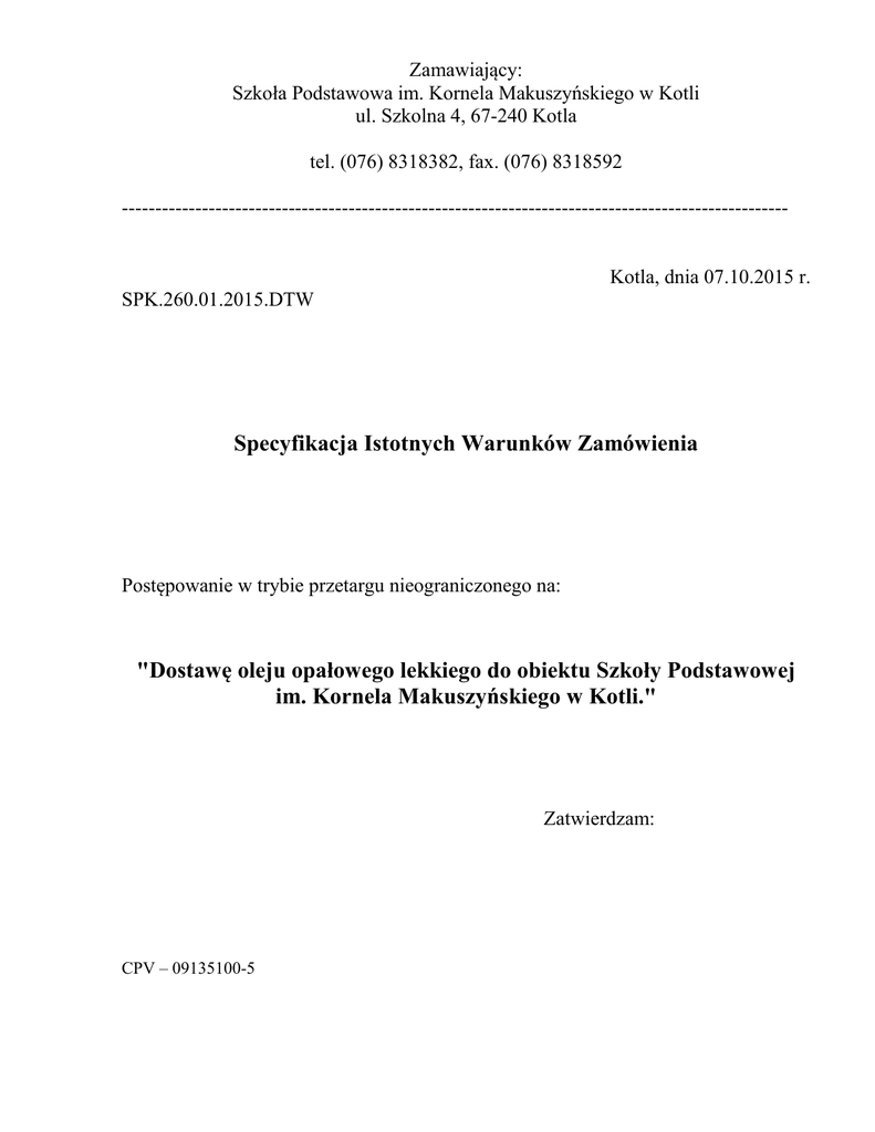 Zamawiający: Szkoła Podstawowa im. Kornela Makuszyńskiego w Kotli ul. Szkolna 4, 67-240 Kotla tel. (076) 8318382, fax. (076) 8318592 ---------------------------------------------------------------------------------------------------- Kotla, dnia 07.10.2015 r. SPK.260.01.2015.DTW Specyfikacja Istotnych Warunków Zamówienia Postępowanie w trybie przetargu nieograniczonego na: "Dostawę oleju opałowego lekkiego do obiektu Szkoły Podstawowej im. Kornela Makuszyńskiego w Kotli." Zatwierdzam: CPV – 09135100-5 1. Szkoła Podstawowa im. Kornela Makuszyńskiego w Kotli zaprasza do udziału w przetargu nieograniczonym zgodnie z ustawą z dnia 29 stycznia 2004 r. Prawo zamówień publicznych (Dz. U. z 2013 poz. 907 ze zm.). 2. Przedmiot zamówienia. 1) przedmiotem niniejszego zamówienia jest: "Dostawa oleju opałowego lekkiego w ilości ok. 55000 litrów do Szkoły Podstawowej im. Kornela Makuszyńskiego w Kotli. 2) Olej opałowy lekki L – 1 według Polskiej Normy PN C – 96024 powinien spełniać wymagania: 1) gęstość w 150 C, max 0,860g/m3, 2) wartość opałową, min. 42,6 MJ/kg, 3) temperatura zapłonu, min. 560 C, 4) lepkość kinematyczna w 200 C, max. 6,00 mm2/s 5) skład frakcyjny: do 2500 C destyluje, max. 65 % (V/V), 0 do 350 C destyluje, min. 85 % (V/V), 6) temperatura płynięcia, max. - 200 C, 7) pozostałość po koksowaniu z 10 % pozostałości destylacyjnej, max. 0,3 % (m/m), 8) zawartość siarki, max. 0,2 % (m/m), 9) zawartość wody, max. 200 mg/kg, 10)zawartość zanieczyszczeń stałych, max. 24 mg/kg, 11) pozostałość po spopieleniu, max. 0,01 % (m/m), 12) barwa czerwona, 3) dostawy oleju opałowego lekkiego będą realizowane sukcesywnie na podstawie zamówień składanych telefonicznie potwierdzonych fax-em przez Zamawiającego u Dostawcy, w terminie dwóch dni od daty telefonicznego złożenia zamówienia. Wykonawca dołączy atest na olej opałowy przy każdej dostawie. 4) Zamawiający nie dopuszcza składania ofert częściowych i wariantowych. 3. Termin wykonania zamówienia. 1) termin realizacji zamówienia - od 02.11.2015 r. do 30.06.2016 r. sukcesywnie wg telefonicznie zgłoszonego zapotrzebowania, 2) olej należy dostarczyć w terminie dwóch dni od daty zgłoszenia Zamawiającego. 4. Opis sposobu obliczania ceny. 1. Na cenę ofertową brutto za 1000 litrów oleju składa się: a) cena sprzedaży netto publikowana na stronie internetowej producenta na dzień 14.10.2015 r, przyjęta w celu obliczenia ceny oferty, b) marża wykonawcy lub upust wykonawcy netto stały/a przez cały okres realizacji zamówienia, zawierający/a wszelkie koszty związane z realizacją zamówienia, w tym koszty dostawy, wyładunku oraz wszystkie inne koszty wynikające z realizacji przedmiotu zamówienia, c) należny podatek VAT. 5. Kryteria oceny ofert. 1) przy wyborze oferty Zamawiający kierować się będzie kryteriami: a) cena zawierająca również koszty transportu – 100 % 2) cena w skali 0-100 punktów a) najniższa cena – 100 pkt, b) pozostała proporcjonalnie w/g wzoru: najniższa cena x100 pkt ------------------------------- x 100% (waga kryterium) cena oferty rozpatrywanej 3) za najkorzystniejszą zostanie uznana oferta, która zdobędzie najwyższą ilość punktów. 6. Termin związania ofertą. Wykonawcy pozostają związani ofertą przez 30 dni od upływu terminu składania ofert. 7. Miejsce i termin składania ofert. 1) ofertę należy złożyć w siedzibie Zamawiającego, tj. w sekretariacie Szkoły Podstawowej im. Kornela Makuszyńskiego w Kotli, przy ulicy Szkolnej 4, 67-240 Kotla, w terminie do 27.10.2014 r. do godziny 1300, 2) oferty złożone po terminie będą zwrócone oferentom bez otwierania, 3) oferta zostanie odrzucona bez rozpatrywania, gdy: a) jest sprzeczna z ustawą Prawo zamówień publicznych lub Specyfikacją Istotnych Warunków Zamówienia, b) jej złożenie stanowi czyn nieuczciwej konkurencji. 8. Miejsce i termin otwarcia ofert. Otwarcie ofert nastąpi w dniu 27.10.2014 r. o godzinie 13:10 w Szkole Podstawowej w Kotli przy ulicy Szkolnej 4, 67-240 Kotla. 9. Wybór oferty. 1) wybór najkorzystniejszej oferty nastąpi zgodnie z art. 91 ustawy z dnia 29 stycznia 2004 r. Prawo zamówień publicznych, 2) jeżeli w postępowaniu o udzielenie zamówienia nie można będzie dokonać wyboru oferty najkorzystniejszej ze względu na złożenie ofert o takiej samej marży handlowej, Zamawiający wezwie wykonawców do złożenia w określonym terminie ofert dodatkowych. 10. Tryb ogłoszenia wyników. 1) wszyscy wykonawcy zostaną powiadomieni pisemnie o wyborze ofert, 2) wybrany wykonawca zostanie poinformowany pisemnie o terminie i miejscu podpisania umowy. 11. Opis przygotowania oferty. 1) oferta winna być sporządzona na formularzu stanowiącym załącznik nr 1 do niniejszej SIWZ wraz z niezbędnymi załącznikami wynikającymi ze SIWZ, 2) w przypadku, gdy oferent jako załącznik do oferty dołączy kopię dokumentu, powyższa kopia winna być potwierdzona za zgodność z oryginałem przez osobę upoważnioną do reprezentowania oferenta, 3) złożone oferty winny być zgodne z wymogami SIWZ, 4) każdy wykonawca winien złożyć tylko jedną ofertę, 5) wykonawca ponosi wszelkie koszty związane z przygotowaniem i złożeniem oferty. Wymaga się aby wykonawca zdobył wszelkie informacje, które są konieczne do przygotowania oferty oraz podpisania umowy, 6) oferta winna być sporządzona w języku polskim, z zachowaniem formy pisemnej pod rygorem nieważności oraz podpisana przez upoważnionego przedstawiciela lub przedstawicieli wykonawcy. Upoważnienie do podpisania oferty winno być dołączone do oferty o ile nie wynika to z załączonych dokumentów do oferty. 7) miejsca, w których wykonawca naniósł zmiany winny być parafowane przez osoby upoważnione do reprezentowania wykonawcy, 8) ofertę wraz z wszystkimi załącznikami należy umieścić w zamkniętej i zabezpieczonej przed przypadkowym otwarciem kopercie. Koperta powinna b