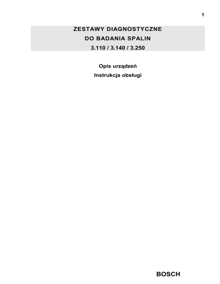 1 ZESTAWY DIAGNOSTYCZNE DO BADANIA SPALIN 3.110 / 3.140 / 3.250 Opis urządzeń Instrukcja obsługi BOSCH 2 Przed uruchomieniem i przystąpieniem do obsługi przyrządu jest konieczne dokładne zapoznanie się z instrukcją obsługi, a zwłaszcza z zasadami zachowania bezpieczeństwa. W ten sposób nabędzie się umiejętności posługiwania przyrządem, dla własnego bezpieczeństwa, a takŜe, aby zapobiec uszkodzeniom aparatury. Wszystkie czynności i zabiegi, jak równieŜ podłączanie przyrządów diagnostycznych w obszarze silnika i do układu zapłonowego mogą być wykonywane tylko przy zatrzymanym silniku i wyłączonym zapłonie. Te symbole, umieszczone na Państwa urządzeniu diagnostycznym, powinny stale przypominać o powyŜszych wskazówkach. MICROSOFT®, MS®, MS-DOS® i WINDOWS® są zastrzeŜonymi znakami towarowymi firmy Microsoft Corporation. 3 SPIS TREŚCI: Strona Zasady bezpiecznego uŜytkowania.............................................................................................4 1. Wskazówki ogólne..................................................................................................................8 1.1 Zakres stosowania urządzeń ................................................................................. 8 1.2 Grupa uŜytkowników urządzeń .............................................................................. 8 1.3 Gwarancja.............................................................................................................. 8 1.4 Opis programu ....................................................................................................... 8 1.5 Obsługa modułu do badania zadymienia RTM 430 ............................................... 8 1.6 Obsługa modułu do analizy spalin ETT 8.70 ......................................................... 8 1.7 Obsługa drukarki protokołów PDR 202.................................................................. 8 1.8 Obsługa drukarki protokołów PDR 201.................................................................. 9 1.9 Broszura „Badanie spalin (AU)” ............................................................................. 9 1.10 Broszura „Podłączanie urządzeń diagnostycznych do pojazdu” .......................... 9 2. Opis urządzeń.........................................................................................................................9 2.1 Zestaw diagnostyczny 3.110.................................................................................. 9 2.2 Zestaw diagnostyczny 3.140................................................................................ 10 2.3 Zestaw diagnostyczny 3.250................................................................................ 11 3. Zespoły urządzenia...............................................................................................................13 3.1 Monitor monochromatyczny 14” (1 687 023 212) ................................................ 13 3.2 Monitor kolorowy 14” (1 687 022 410) ................................................................. 13 3.3 Drukarka protokołów............................................................................................ 14 3.4 Pilot zdalnego sterowania (1 687 023 213).......................................................... 16 3.5 Klawiatura PC ...................................................................................................... 16 3.6 Komputer PC ....................................................................................................... 18 3.7 Moduł do diagnostyki silnika MTM (1 687 022 411)............................................. 18 3.8 Moduł do diagnostyki silnika MTM (1 687 022 412)............................................. 19 4. Sondy pomiarowe (wyposaŜenie dodatkowe) .......................................................................21 5. Uruchamianie........................................................................................................................23 5.1 Zasilanie prądem ................................................................................................. 23 5.2 Instalowanie oprogramowania ............................................................................. 24 6. Podłączenie do samochodu ..................................................................................................24 6.1 Warunki badania.................................................................................................. 24 6.2 Przygotowanie do pomiaru silnika o zapłonie iskrowym ...................................... 24 6.3 Przygotowanie do pomiaru silnika o zapłonie samoczynnym .............................. 25 7. Zakres dostawy.....................................................................................................................25 8. WyposaŜenie dodatkowe ......................................................................................................26 9. Części zamienne ..................................................................................................................28 10. Wskazówki dotyczące usterek ............................................................................................29 11. Dane techniczne .................................................................................................................32 4 Zasady bezpiecznego uŜytkowania Napięcia sieciowe Wysokie napięcie W instalacji elektrycznej pojazdu, tak jak w sieci elektrycznej, występują napięcia niebezpieczne dla zdrowia. Dotknięcie części pod napięciem (np. cewki zapłonowej) i przebicia napięciowe wskutek uszkodzeń izolacji (np. przegryzienia przez kuny przewodów zapłonowych) groŜą poraŜeniem elektrycznym. Dotyczy to obwodu wtórnego i pierwotnego układu zapłonowego, wiązki przewodów ze złączami wtykowymi, instalacji oświetleniowych (Litronic) oraz złączy przyrządu diagnostycznego. Śr