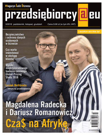 magazyn ludzi biznesu 3/2016 pażdziernik, listopad, grudzień Cena 9.90 zł (w tym 8% VAT) z dodatkiem Auto Moto Styl Bezpieczeństwo i ochrona danych osobowych w biznesie Czy warto inwestować w obsługę klienta? Wyniki międzynarodowego badania cenowego Global Pricing Study 2016 Leszek Mellibruda – Toksyczny przedsiębiorca Magdalena Radecka i Dariusz Romanowicz Cza$ na Afrykę NR INDEKSU 40540X Drodzy Czytelnicy, czas wakacyjnych szaleństw już minął, przed nami perspektywa ponad sześciu zimnych miesięcy. W sklepach pojawiły się już kolekcje jesienno-zimowe, a zatłoczone latem kąpieliska przeniosły się do miejskich pubów i kawiarni. Psychologowie twierdzą, że świetnym sposobem na powakacyjny stres jest powrót do letnich chwil dzięki oglądaniu zdjęć z wakacji i wspominaniu. Wielu z nas z końcem lata zaczyna planować kolejne wakacje, co też może okazać się skuteczną metodą na przetrwanie długich, zimowych dni. Niezależnie jednak od tego, do czego wracamy po urlopie, warto pamiętać, że po drodze do kolejnej wiosny i lata czeka nas kilka przyjemnych świątecznych przerw oraz wiele wydarzeń gospodarczych i kulturalnych, w których warto uczestniczyć. Zimowa pora to też idealny czas na dobrą lekturę, czyli nasz magazyn, który oddajemy w Wasze ręce. A w nim m.in. przedstawiamy sylwetki przedsiębiorców otwartych na rozwój i na nowe perspektywy. Przekazujemy też wiele przydatnych informacji i porad biznesowych z dziedziny prawa i ochrony danych osobowych. Warty szczególnej uwagi i przemyślenia jest tekst uznanego psychologa biznesu Leszka Mellibrudy na temat toksycznego przedsiębiorcy. Na poprawę humoru nie zaszkodzi poczytać, a nawet wybrać się na festiwal whisky albo do teatru na polecaną sztukę. Wspominając lub, lepiej, planując już kolejne wakacje, dajmy się zauroczyć fotografiami i opisami pejzaży porównywanej do planety Mars Namibii. Dla jeżdżących, a zwłaszcza tych szczególnie to lubiących, przygotowaliśmy dodatek Auto Moto Styl z newsami, premierami i testami ze świata motoryzacji. Zapraszam do lektury! Barbara Jończyk wydawca i redaktor naczelna magazynu „przedsiębiorcy@eu” Redakcja: ul. Kaliska 17 lok. 42, 02-316 Warszawa tel. 501 243 876 e-mail: [email protected], www.przedsiebiorcy.eu Redaktor naczelny: Barbara Jończyk Redaktor prowdząca: Aneta Sienicka Zespół redakcyjny: Izabela Włodarczyk, Izabella Jarska, Krzysztof Jończyk, Rafał Korzeniewski, Dora Rosłońska, Marta Buzalska, Ewa Maj, Jowita Łuczak, Olgierd Stańczak. Redakcja językowa i korekta: Natalia Kamińska Reklama: Aneta Sienicka [email protected], tel. 603 333 711 Konrad Gładysz [email protected], tel. 512 712 702 DTP i druk: MaxMedia, ul. Estrady 67, 01-932 Warszawa, tel. 22 832 42 51 [email protected] www.maxmedia.org.pl Wydawca: Europejskie Forum Przedsiębiorczości Sp. z o.o. ul. Kaliska 17 lok. 42, 02-316 Warszawa NIP: 701-020-11-00 Numer oddano do druku 10.10.2016 r. Redakcja nie ponosi odpowiedzialności za treść reklam oraz materiałów promocyjnych. Publikowane zdjęcia i materiały są własnością redakcji oraz prezentowanych firm i instytucji. Przedruk tylko za zgodą wydawcy. Redakcja zastrzega sobie prawo do skrótów. przedsiebiorcy@eu 3 W numerze: 6 24 TWARZE BIZNESU - Magdalena Radecka i Dariusz Romanowicz „Cza$ na Afrykę” - Andrzej Dachowski – Ambasador Przedsiębiorczości „Lubię pomagać ludziom” - Marek Krzemieniewski „W branży czystości liczy się jakość” - Jerzy Sułkowski „Meble z tradycją” - Marta Miklaszewska „Czy architekt wnętrz to dziś nowe „must have”?” - Renata Błażejewska „Z miłości do ludzi” - Krystyna Tarasiuk „Lider to wizjoner i twórca, który służy innym” - Robert Sienczewski „Rozwój osobisty a rozwój w biznesie” BIZNES I GOSPODARKA - Samorząd gospodarczy wczoraj a dziś – rozmowa z Waldemarem Piórkiem - Razem na rzecz polskiej marki – rozmowa z Ryszardem Marcińczakiem - Wyniki międzynarodowego badania cenowego Global Pricing Study 2016: Co druga firma aktywnie zaangażowana w wojnę cenową - Jak osiągnąć najwyższy poziom networkingu biznesowego? – zapowiedż Wolves Summit - Future Private Labels 2016 z sukcesami - Kolejna edycja targów IT Future Expo za nami! - China Homelife Show – podsumowanie 40 BLIŻEJ ŚWIATA - Proklamacja Antyterrorystyczna – skuteczna ochrona obywateli czy narzędzie represji w rękach władz Etiopii? - Zgoda buduje, niezgoda rujnuje 46 W PARAGRAFIE - Podróż służbowa w praktyce - Wygaśnięcie obowiązku alimentacyjnego wobec byłego małżonka oraz dzieci w praktyce - Rozwód czy separacja: „Chcę się rozwieść!” - Czego uczą nas wyroki sądowe. Anatomia współtwórczości 54 Z SZUFLADY EKSPERTA - Co to znaczy CRM? - Czy warto inwestować w obsługę klienta? - Jak kupować, żeby nie przepłacać - Radzenie sobie z tremą podczas wystąpień publicznych - Komunikacja na stronie: 5 grzechów polskich firm - Privacy by Design, czyli bezpieczeństwo i ochrona danych osobowych w biznesie - Jak zapewnić wysoką jakość tłumaczeń tekstów firmowych? - Toksyczny przedsiębiorca (menadżer, biznesmen, szef) 4 przedsiebiorcy@eu 72 KULTURA NA WIDELCU - W życiu prywatnym jesteśmy wulkanami – rozmowa z Beatą Bełtowską - Teatralna jesień – miniprzewodnik - Polski Festiwal Sztuki Orzeł 2016 78 STYL ŻYCIA - Festiwal w kolorze bursztynu, rubinu i złota – rozmowa z Jarosławem Bussem - Dlaczego warto powierzyć organizację przyjęcia profesjonaliście? - Zadbajmy o skórę po lecie 86 Z POTRZEBY SERCA - Jedzenie (nie) do wyrzucenia, czyli jak zapobiegać marnowaniu żywności 90 Z ALBUMU PODRÓŻNIKA - Namibia – planeta Mars Fot. Biuro podróży Africaline 94 AKADEMIA DOBREGO SMAKU - Szef kuchni poleca 98 WYDARZENIA - VI Letnia Gala Przedsiębiorców rodzinny piknik ludzi biznesu - Jak za dawnych czasów – relacja z X Ogólnopolskiego Turnieju Nalewek i Kuchni Kresowej -