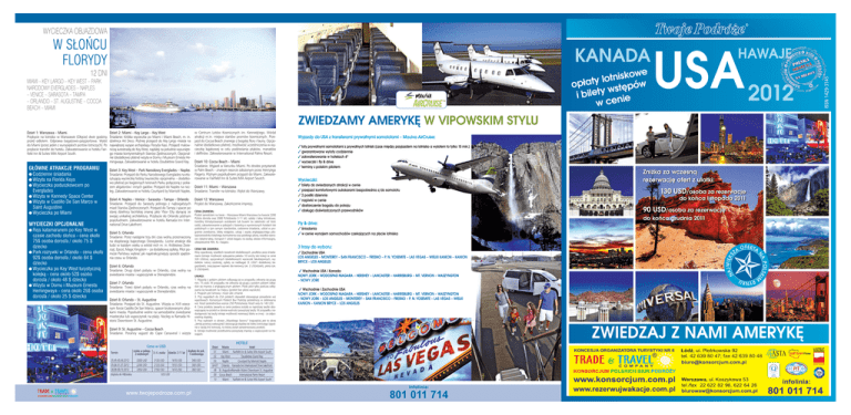 WYCIECZKA OBJAZDOWA KANADA kowe s i n t o l opłaty wstępów i bilety nie w ce 12 DNI MIAMI – KEY LARGO – KEY WEST – PARK NARODOWY EVERGLADES – NAPLES – VENICE – SARASOTA – TAMPA – ORLANDO – ST. AUGUSTINE – COCOA BEACH – MIAMI HAWAJE USA 2012 ZWIEDZAMY AMERYKĘ W VIPOWSKIM STYLU l Codzienne śniadania l Wizyta na Florida Keys l Wycieczka poduszkowcem po Everglades l Wizyta w Kennedy Space Center l Wizyta w Castillo De San Marco w Saint Augustine l Wycieczka po Miami WYCIECZKI OPCJONALNE l Rejs Śniadanie. Przejazd do Parku Narodowego Everglades na ekscytującą wycieczkę łodzią (wycieczka opcjonalna – dodatkowo płatna) po bagiennych terenach Parku połączoną z pokazem aligatorów i innych gadów. Przejazd do Naples na nocleg. Zakwaterowanie w hotelu Courtyard by Marriott Naples. Śniadanie. Wyjazd w kierunku Miami. Po drodze przystanek w Palm Beach – znanym resorcie założonym przez Henry'ego Flager'a. Późnym popołudniem przyjazd do Miami. Zakwaterowanie w Fairfield Inn & Suites MIA Airport Soutch. Dzień 11: Miami – Warszawa Śniadanie. Transfer na lotnisko. Wylot do Warszawy. Dzień 4: Naples – Venice – Sarasota – Tampa – Orlando Dzień 12: Warszawa Śniadanie. Przejazd do Sarasoty jednego z najbogatszych miast Stanów Zjednoczonych. Przejazd do Tampy i spacer po starej dzielnicy łacińskiej znanej jako Ybor City słynącej ze swojej unikalnej architektury. Przybycie do Orlando późnym popołudniem. Zakwaterowanie w hotelu Ramada Inn International Drive Lakefront. Przylot do Warszawy. Zakończenie imprezy. Dzień 5: Orlando Śniadanie. Przez następne trzy dni czas wolny przeznaczony na eksplorację bajecznego Disneylandu. Liczne atrakcje dla ludzi w każdym wieku a wśród nich m. in. Królestwo Zwierząt, Epcot, Magic Kingdom – za dodatkową opłatą. Pilot pomoże Państwu wybrać jak najatrakcyjniejszy sposób spędzenia czasu w Orlando. Dzień 7: Orlando Śniadanie. Trzeci dzień pobytu w Orlando, czas wolny na zwiedzanie miasta i wypoczynek w Disneylandzie. Dzień 8: Orlando – St. Augustine Śniadanie. Przejazd do St. Augustine. Wizyta w XVII wiecznym forcie Castillo De San Marco, spacer brukowanymi uliczkami miasta. Popołudnie wolne na samodzielne zwiedzanie miasteczka lub wypoczynek na plaży. Nocleg w Ramada Historic Downtown St. Augustine. Dzień 9: St. Augustine – Cocoa Beach Śniadanie. Poranny wyjazd do Cape Canaveral i wizyta UWAGI: 1. Wyjazdy z polskim pilotem odbywają się w przypadku zebrania się grupy min. 15 osób. W przypadku nie zebrania się grupy z polskim pilotem odbędzie się impreza z anglojęzycznym pilotem. Polski pilot tylko podczas odbywania się świadczeń na miejscu (przelot bez pilota wycieczki). 2. Program jest ramowy i może ulec zmianie. 3. Przy wyjazdach do USA polskich obywateli obowiązuje posiadanie wiz wjazdowych. Konsorcjum Polskich Biur Podróży pośredniczy w załatwianiu wiz. Koszt pośrednictwa wynosi 250 PLN/os/wizę. Koszt wizy to 140 USD. 4. Cena przelotu zawarta w cenie podana została w najniższej taryfie obowiązującej na przelot w okresie ważności powyższej taryfy. W przypadku niedostępności tej taryfy istnieje możliwość rezerwacji biletu w innej – za odpowiednią dopłatą. 5. Przy wylotach w okresie „Wysokiego Sezonu” (najczęściej jest to okres „letniej przerwy wakacyjnej") obowiązuje dopłata do biletu lotniczego (zgodnie z taryfą linii lotniczej, na której został zarezerwowany przelot). 6. Istnieje możliwość przedłużenia powyższej imprezy o wypoczynek na Hawajach. Cena w USD 25.05-05.06.2012 20.06-01.07.2012 28.09-09.10.2012 dopłata do HB/osoba 2200 USD 2200 USD 2350 USD 2120 USD 1610 USD 2120 USD 1610 USD 2150 USD 1610 USD 320 USD 130 USD/osoba za rezerwacje do końca listopada 2011 90 USD/osoba za rezerwację do końca grudnia 2011 Fly & drive: 3 śniadania 3 w cenie wynajem samochodów czekających na płycie lotniska 3 trasy do wyboru: 3 Zachodnie USA LOS ANGELES – MONTEREY – SAN FRANCISCO – FRESNO – P. N. YOSEMITE – LAS VEGAS – WIELKI KANION – KANION BRYCE – LOS ANGELES 3 Wschodnie USA i Kanada NOWY JORK – WODOSPAD NIAGARA – HERSHEY – LANCASTER – HARRISBURG – MT. VERNON – WASZYNGTON – NOWY JORK 300 USD 300 USD 300 USD O F ER T A ZWIEDZAJ Z NAMI AMERYKĘ Dzień Miasto Hotel 01 Miami Fairfield Inn & Suites MIA Airport South 02 Key West Doubletree Grand Key 03 Naples Courtyard by Marriott Naples 04-07 Orlando Ramada Inn International Drive Lakefront 08 St. AugustineRamada Historic Downtown St. Augustine 09 Cocoa Beach International Palms Resort 10 Miami Fairfield Inn & Suites MIA Airport South 42 639 80 47; fax 42 639 80 48 infolinia: www.twojepodroze.com.pl O ZA 3 Wschodnie i Zachodnie USA NOWY JORK – WODOSPAD NIAGARA – HERSHEY – LANCASTER – HARRISBURG – MT. VERNON – WASZYNGTON – NOWY JORK – LOS ANGELES – MONTEREY – SAN FRANCISCO – FRESNO – P. N. YOSEMITE – LAS VEGAS – WIELKI KANION – KANION BRYCE – LOS ANGELES HOTELE osoba w pokoju dopłata do pok. 2-osobowym 3.i 4. osoba dziecko 2-11 lat 1-osobowego Termin 3 bilety do zwiedzanych atrakcji w cenie 3 przejazd komfortowymi autokarami bezpośrednio z/do samolotu 3 2 posiłki dziennie 3 napiwki w cenie 3 dostarczenie bagażu do pokoju 3 obsługa doświadczonych przewodników I Śniadanie. Drugi dzień pobytu w Orlando, czas wolny na zwiedzanie miasta i wypoczynek w Disneylandzie. CENA NIE ZAWIERA: Wizy wjazdowej, wszelkich świadczeń dodatkowych, posiłków poza śniadaniami (istnieje możliwość wykupienia pakietu 10 lunchy lub kolacji w cenie 320 USD/os), opcjonalnych (dodatkowych) wycieczek fakultatywnych, wydatków natury osobistej, opłaty za nadbagaż (5 USD/1 dodatkowy bagaż/dzień), zwyczajowe napiwki dla kierowcy (ok. 2 USD/dzień), pilota (ok. 3 USD/dzień). Wycieczki: Zniżka za wczesną rezerwację ofert z ulotki: P OL S K Dzień 6: Orlando CENA ZAWIERA: Przelot samolotem na trasie – Warszawa-Miami-Warszawa (w k