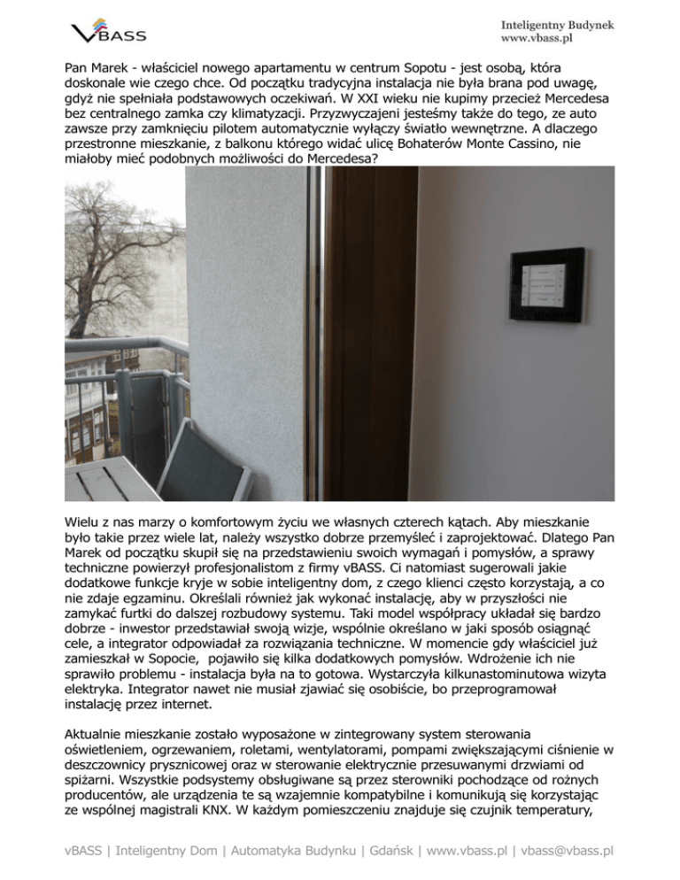 Pan Marek - właściciel nowego apartamentu w centrum Sopotu - jest osobą, która doskonale wie czego chce. Od początku tradycyjna instalacja nie była brana pod uwagę, gdyŜ nie spełniała podstawowych oczekiwań. W XXI wieku nie kupimy przecieŜ Mercedesa bez centralnego zamka czy klimatyzacji. Przyzwyczajeni jesteśmy takŜe do tego, ze auto zawsze przy zamknięciu pilotem automatycznie wyłączy światło wewnętrzne. A dlaczego przestronne mieszkanie, z balkonu którego widać ulicę Bohaterów Monte Cassino, nie miałoby mieć podobnych moŜliwości do Mercedesa? Wielu z nas marzy o komfortowym Ŝyciu we własnych czterech kątach. Aby mieszkanie było takie przez wiele lat, naleŜy wszystko dobrze przemyśleć i zaprojektować. Dlatego Pan Marek od początku skupił się na przedstawieniu swoich wymagań i pomysłów, a sprawy techniczne powierzył profesjonalistom z firmy vBASS. Ci natomiast sugerowali jakie dodatkowe funkcje kryje w sobie inteligentny dom, z czego klienci często korzystają, a co nie zdaje egzaminu. Określali równieŜ jak wykonać instalację, aby w przyszłości nie zamykać furtki do dalszej rozbudowy systemu. Taki model współpracy układał się bardzo dobrze - inwestor przedstawiał swoją wizje, wspólnie określano w jaki sposób osiągnąć cele, a integrator odpowiadał za rozwiązania techniczne. W momencie gdy właściciel juŜ zamieszkał w Sopocie, pojawiło się kilka dodatkowych pomysłów. WdroŜenie ich nie sprawiło problemu - instalacja była na to gotowa. Wystarczyła kilkunastominutowa wizyta elektryka. Integrator nawet nie musiał zjawiać się osobiście, bo przeprogramował instalację przez internet. Aktualnie mieszkanie zostało wyposaŜone w zintegrowany system sterowania oświetleniem, ogrzewaniem, roletami, wentylatorami, pompami zwiększającymi ciśnienie w deszczownicy prysznicowej oraz w sterowanie elektrycznie przesuwanymi drzwiami od spiŜarni. Wszystkie podsystemy obsługiwane są przez sterowniki pochodzące od roŜnych producentów, ale urządzenia te są wzajemnie kompatybilne i komunikują się korzystając ze wspólnej magistrali KNX. W kaŜdym pomieszczeniu znajduje się czujnik temperatury, vBASS | Inteligentny Dom | Automatyka Budynku | Gdańsk | www.vbass.pl | [email protected] który dostarcza informacje do sterownika ogrzewania. Pomiar temperatury jest przewaŜnie wbudowany w inteligentny klawisz. Istnieje bardzo szeroki wybór takich klawiszy, głównie pod kątem wizualnym. Panu Markowi wraz z Ŝoną od samego początku przypadł do gustu design oferowany przez niemieckiego producenta Gira. Klawisz, poza pomiarem temperatury, posiada programowalne pola przyciskowe. Sterują one oświetleniem, scenariuszami świetlnymi (sceny), roletami lub wywołują dodatkowe funkcje, jak wyłącz pomieszczenie, cały dom, obniŜ temperaturę, załącz symulacje obecności lub tzw funkcja paniki - załącz światło na 100% w całym mieszkaniu. Do tej pory wdroŜono wiele najrozmaitszych zaleŜności logicznych pomiędzy roŜnymi zdarzeniami w systemie, które automatyzują codzienne czynności. Jako przykład posłuŜy toaleta gościnna. JeŜeli zapali się tam przynajmniej jedno światło i pozostanie zapalone przez co najmniej 2 minuty, to system automatycznie załączy na najwyŜsze obroty wentylator i włączy radio. Przy wyjściu i zgaszeniu oświetlenia system po upływie dwóch minut wyłączy równieŜ wentylator i radio. Mieszkańcy doszli do wniosku, ze dłuŜsze korzystanie z toalety oznacza konieczność przewietrzenia pomieszczenia, a miłym akcentem będzie samoczynnie włączające się radio. To oni definiują czas, po którym system uruchamia i wyłącza wentylator oraz radio. Dokonują tego z poziomu wbudowanego w ścianę Gira Pro-Face ServerClient. Jest to 15-calowy ekran dotykowy do zarządzania całą instalacją inteligentnego domu. UmoŜliwia on zarządzanie światłem, ustalanie w jakich porach maja zamknąć się rolety w salonie i sypialni, kiedy ma grzać elektryczna mata podłogowa w łazience itp. Gira Pro-Face ServerClient dodatkowo dostarcza wykresy z temperaturami pomieszczeń oraz informuje w jakich porach grzejniki grzały. Okazuje się, Ŝe mieszkanie szybko się nagrzewa i wolno wychładza. W rezultacie system załączał grzejniki na mniej niŜ 10% w skali tygodnia, co niewątpliwie przekłada się na duŜe oszczędności energii grzewczej. W najbliŜszym czasie oszczędności jeszcze wzrosną, gdyŜ mieszkańcy wybierają się na (zasłuŜony) wypoczynek. Przed wyjazdem skorzystają z funkcji „urlop”, która całe ogrzewanie ustawi na tryb ekonomiczny, przy okazji rozłączając elektrozawór od wody uŜytkowej. W razie ewentualnej awarii nie zaleje vBASS | Inteligentny Dom | Automatyka Budynku | Gdańsk | www.vbass.pl | [email protected] sąsiada niŜej. System załączy teŜ symulację obecności, która wieczorami będzie sterować wybranymi światłami (np widocznymi z ulicy) zgodnie z tym co zostało zapisane w poprzednich tygodniach. Inteligentna instalacja zaczęła przynosić wymierne oszczędności (ogrzewanie, wyłączanie światła przez 'suma dom off'), zwiększyła poziom bezpieczeństwa (elektrozawór wody, funkcja paniki, symulacja obecności, automatyczne sterowanie roletami antywłamaniowymi). Teraz nadszedł więc czas na poprawienie komfortu i gadŜety. Sterowanie domem z pilota? Technicznie wykonalne. W związku z tym, Ŝe właściciel nie lubi banalnych rozwiązań, to pilotem będzie telefon komórkowy (iPhone). Rozwiązanie bardzo wygodne i w zupełności wystarczające do codziennych zastosowań. JednakŜe nie wszystko dobrze wygląda na małym ekranie, dlatego teŜ pojawił się pomysł na jeden główny pilot przenośny z większym wyświetlaczem. Wybór padł na tablet iPad z ciekłokrystalicznym ekranem o przekątnej 9.7", wydajnej baterii, który jednocześnie jest niezwykle lekki i elegancki. Jako interfejs HMS (Home Management System) sprawdza się