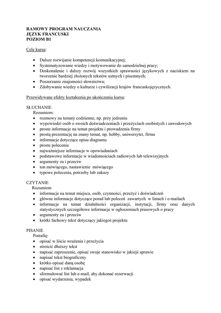 RAMOWY PROGRAM NAUCZANIA JĘZYK FRANCUSKI POZIOM B1 Cele kursu: • • • • • Dalsze rozwijanie kompetencji komunikacyjnej; Systematyzowanie wiedzy i motywowanie do samodzielnej pracy; Doskonalenie i dalszy rozwój wszystkich sprawności językowych z naciskiem na tworzenie bardziej złożonych tekstów ustnych i pisemnych; Poszerzanie znajomości słownictwa; Zdobywanie wiedzy o kulturze i cywilizacji krajów francuskojęzycznych. Przewidywane efekty kształcenia po ukończeniu kursu: SŁUCHANIE Rozumiem: • rozmowy na tematy codzienne, np. przy jedzeniu • wypowiedzi osób o swoich doświadczeniach i przeżyciach osobistych i zawodowych • proste informacje na temat projektu i prowadzenia firmy • prostą prezentację na znany temat, np. hobby, uniwersytet, firma • informacje dotyczące opisu diagramu • proste polecenia • najważniejsze informacje w opowiadaniach • podstawowe informacje w wiadomościach radiowych lub telewizyjnych • argumenty za i przeciw • ton mówiącego, nastawienie mówiącego • typowe polecenia, potrzeby lub zakazy CZYTANIE Rozumiem • informacje na temat miejsca, osób, czynności, przeżyć i doświadczeń • główne informacje dotyczące porad lub poleceń zawartych w listach i e-mailach • informacje na temat działalności organizacji, instytucji, firmy oraz danych statystycznych szczegółowe informacje w ogłoszeniach prasowych o pracy • argumenty za i przeciw • krótki fachowy tekst dotyczący jakiegoś projektu PISANIE Potrafię: • opisać w liście wrażenia i przeżycia • streścić dłuższy tekst • napisać zaproszenie, opisać swoje stanowisko w jakiejś sprawie • napisać tekst biograficzny • krótko opisać daną osobę • napisać list z reklamacja • sformułować list lub e-mail, aby dokonać rezerwacji • opisać wydarzenia, wypadek • • opisać strukturę instytucji, organizacji opisać projekt na podstawie krótkiego fachowego tekstu MÓWIENIE Umiem: • zaproponować wspólne spotkanie, wspólne spędzenie czasu • ustalić i omówić program spotkania • poinformować o swojej sytuacji osobistej • dyskutować o sposobach spędzania wolnego czasu • mówić o pogodzie, modzie, współczesnych zjawiskach • opowiedzieć o doświadczeniach z podróży, wakacji • mówić o problemach emigracji • opisać wypadek i przeprowadzić rozmowę w szpitalu • mówić o związkach, uczuciach, doświadczeniach życiowych • opisywać własne doświadczenia życiowe • wyrazić pogląd na aktualny temat • przekazywać informacje • opisać stanowisko pracy • wyrażać zażalenie • przedstawić krótką prezentację na podstawie wybranego tekstu • wygłosić krótki referat na wybrany temat związany z bliskim otoczeniem • opisywać rysunki, zdjęcia, obrazy • wyrażać i uzasadniać swoje stanowisko, opinię, pogląd Kształcone sprawności językowe: SŁUCHANIE głównego sensu wypowiedzi sformułowanej wyraźnie, w języku literackim, na znany temat, związany z pracą, szkołą, czasem wolnym itp.; najważniejszych informacji w programach radiowych i telewizyjnych dotyczących wydarzeń współczesnych lub tematów związanych z zainteresowaniami osobistymi lub zawodowymi, gdy mówi się dość wolno i wyraźnie. CZYTANIE artykułów, opowiadań, reportaży, zawierających najczęściej używane wyrażenia związane z życiem codziennym, akademickim i zawodowym; opisu wydarzeń, uczuć i życzeń zawartych w listach prywatnych. PISANIE prostego zwartego tekstu na znany lub interesujący temat, listu osobistego opisującego doświadczenia i wrażenia, opowiadania, recenzji filmu lub książki. MÓWIENIE: Porozumiewanie się w większości sytuacji, które mogą się zdarzyć w podróży lub w trakcie pobytu w kraju danego obszaru językowego; uczestniczenie bez przygotowania w rozmowach na tematy znane, interesujące lub odnoszące się do życia codziennego (np. rodzina, zainteresowania, podróże i wydarzenia bieżące) tematy; opisywanie doświadczeń i wydarzeń, marzeń, nadziei, ambicji; podawanie i uzasadnianie opinii i planów; opowiadanie historii, relacjonowanie treści filmu lub książki i opisywanie własnych reakcji. Tematyka kursu: Praca, uczelnia, sklep, ulica; Poszukiwanie pracy (życiorys, CV, odpowiedzi na ogłoszenie); Wiadomości o Francji i jej kulturze; Tradycje, obyczaje, święta; Miasta — Paryż, Marsylia, Dijon, itp.; Współczesny świat i jego problemy – ekonomia, polityka, wojny; Dom — relacje między członkami rodziny, porównanie modelu rodziny, warunki życia, mieszkaniowe, materialne; Kino, teatr, dyskoteka, basen, wycieczki; Pogoda, zjawiska przyrody, pory roku; Załatwianie różnych spraw — usługi; Na poczcie (list polecony, rozmowa telefoniczna, paczka, krawiec, pralnia, reperacja obuwia, auta, kupno-sprzedaż); Załatwianie spraw w urzędzie; Dziedzina edukacyjna — w dziekanacie, podanie o urlop dziekański; zdrowotny, podanie o przeniesienie egzaminu na inny termin. Wprowadzane funkcje językowe: • • • • • • • • • • • • • • • • • Wyrażanie podziękowania; Prostowanie wypowiedzi, wyrażanie niewiedzy; Wyrażanie przyczyny i skutku; Opisywanie drogi, miejsc, przestrzeni; Opisywanie sytuacji i zwyczajowych czynności z przeszłości; Opisywanie życiorysu; Wyrażanie czynności uprzedniej w przeszłości; Wyrażanie czynności uprzedniej w przyszłości; Wyrażanie czynności przyszłej w przeszłości; Wyrażanie warunku dla czynności przeszłych, teraźniejszych i przyszłych; Wyrażanie stanów psychicznych i uczuć: zdziwienia, radości, smutku, obawy; Ocenianie wydarzeń z przeszłości; Wyrażanie opinii, sądów i ich uzasadnianie; Wyrażanie stopnia pewności (wątpliwości) co do wydarzeń teraźniejszych i przeszłych; Wyrażanie pragnień i oczekiwań; zwracanie się z prośbą, pytanie o pozwolenie; Udzielanie rad, udzielanie instrukcji, rozkazywanie i nakazywanie, udzielanie (lub nie) 