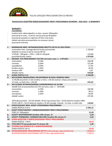 KALKULACJA KOSZTÓW ROBOCZOGODZINY PRACY PRACOWNIKA OCHRONY - ROK 2015 - 4 WARIANTY 1. 2. 3. 4. 5. 6. 7. 8. 9. 10. 11. 12. 13. WARIANT I ZAŁOŻENIA: średnia ilość roboczogodzin w mies. wynosi 168 godzin pracownik w mies., w porze nocnej pracuje 60 godzin pracownik posiada co najmniej 10 letni staż pracy zakład zatrudnia pracowników na umowę o pracę pracownik ochrony MINIMALNE MIES. WYNAGRODZENIE BRUTTO OD 01.01.2015 ROKU minimalne mies. wynagrodzenie brutto pracownika dodatek za pracę w porze nocnej (20 %) 1750,00 : 168 godz. x 20% = 2,08 zł x 60 godz. przychód brutto razem: SKŁADKI ZUS PRACODAWCY (19,74% od sumy z poz. 1 - 1 874,80 ) emerytalna 9,76% rentowa 6,50% wypadkowa 0,93% fundusz pracy 2,45% fundusz GŚP 0,10% składki razem: SUMA POZYCJI 1+2 WYLICZENIE ŚWIADCZENIA URLOPOWEGO W SKALI JEDNEGO MIES. 2 244,89 przychód: 21 dni średnio w mies. x 26 dni wymiar urlopu pracownika: 12 mies. w skali roku = 231,62 WYLICZENIE WYNAGRODZENIA CHOROBOWEGO ZA 33 DNI składki ZUS za pracownika (13,71% od sumy z poz. 1 - 1874,80) emerytalna 9,76% rentowa 1,50% chorobowa 2,45% składki razem: 1 750,00 124,80 1 874,80 182,98 121,86 17,44 45,93 1,87 370,09 2 244,89 231,62 182,98 28,12 45,93 257,04 1874,80 przychód - 257,04 składki: 30 dni wg ustawy ZUS = 53,93 dzienna stawka 100% 53,93 x 80 % = 43,14 dzienna stawka x 33 dni wynagr. chorob.: 12 mies. w skali roku 118,64 PODSTAWOWY MIES. KOSZT UTRZYMANIA PRACOWNIKA SUMA POZYCJI 3+4+5 2 595,15 KOSZT PODSTAWOWY 1 ROBOCZOGODZINY PRACY PRACOWNIKA 2595,15: 168 godzin 15,45 KOSZTY BEZPOŚREDNIE (średnio 10% od poz. 7) 1,54 KOSZTY POŚREDNIE I ADMINISTARCYJNE (średnio 8% od poz.7) 1,24 SUMA KOSZTÓW 1 ROBOCZOGODZINY PRACY PRACOWNIKA SUMA POZYCJI 7+8+9 18,23 ZYSK BRUTTO (przynajmniej 7% od poz 10) 1,28 STAWKA DLA KLIENTA ZA 1 ROBOCZOGODZINĘ SUMA POZYCJI 10+11 19,50 WYNAGRODZENIE PRACOWNIKA NETTO (odliczającego ulgę podatkową) 1 372,17 WYNAGRODZENIE PRACOWNIKA NETTO (bez ulgi podatkowej) 1 326,17 KALKULACJA KOSZTÓW ROBOCZOGODZINY PRACY PRACOWNIKA OCHRONY - ROK 2015 - 4 WARIANTY 1. 2. 3. 4. 5. 6. 7. 8. 9. 10. 11. 12. 13. WARIANT II ZAŁOŻENIA: średnia ilość roboczogodzin w mies. wynosi 168 godzin pracownik w mies., w porze nocnej pracuje 60 godzin pracownik posiada co najmniej 10 letni staż pracy zakład zatrudnia pracowników na umowę o pracę pracownik ochrony MINIMALNE MIES. WYNAGRODZENIE BRUTTO OD 01.01.2014 ROKU zasadnicze mies. wynagrodzenie brutto pracownika dodatek za pracę w porze nocnej (20 %) 17500,00 : 168 godz. x 20% = 2,00 zł x 60 godz. przychód brutto razem: SKŁADKI ZUS PRACODAWCY (19,74% od sumy z poz.1 - 1750,00) emerytalna 9,76% rentowa 6,50% wypadkowa 0,93% fundusz pracy 2,45% fundusz GŚP 0,10% składki razem: SUMA POZYCJI 1+2 WYLICZENIE ŚWIADCZENIA URLOPOWEGO W SKALI JEDNEGO MIES. 2095,45 przychód: 21 dni średnio w mies. x 26 dni wymiar urlopu pracownika: 12 mies. w skali roku = 216,20 WYLICZENIE WYNAGRODZENIA CHOROBOWEGO ZA 33 DNI składki ZUS za pracownika (13,71% od sumy z poz.1 - 1750,00) emerytalna 9,76% rentowa 1,50% chorobowa 2,45% składki razem: 1 625,20 124,80 1 750,00 170,80 113,75 16,28 42,88 1,75 345,45 2 095,45 216,20 170,80 26,25 42,88 239,93 1750,00 przychód - 239,93 składki: 30 dni wg ustawy ZUS = 50,34 dzienna stawka 100% 50,34 x 80 % = 40,27 dzienna stawka x 33 dni wynagr. chorob.: 12 mies. w skali roku: 110,74 PODSTAWOWY MIES KOSZT UTRZYMANIA PRACOWNIKA SUMA POZYCJI 3+4+5 2 422,39 KOSZT PODSTAWOWY 1 ROBOCZOGODZINY PRACY PRACOWNIKA 2422,39: 168 godzin 14,42 KOSZTY BEZPOŚREDNIE (średnio 10% od poz. 7) 1,44 KOSZTY POŚREDNIE I ADMINISTARCYJNE (średnio 8% od poz. 7) 1,15 SUMA KOSZTÓW 1 ROBOCZOGODZINY PRACY PRACOWNIKA SUMA POZYCJI 7+8+9 17,01 ZYSK BRUTTO (przynajmniej 7% od poz. 10) 1,19 STAWKA DLA KLIENTA ZA 1 ROBOCZOGODZINĘ 18,21 SUMA POZYCJI 10+11 WYNAGRODZENIE PRACOWNIKA NETTO (odliczającego ulgę podatkową) 1 286,16 WYNAGRODZENIE PRACOWNIKA NETTO (bez ulgi podatkowej) 1 239,16 KALKULACJA KOSZTÓW ROBOCZOGODZINY PRACY PRACOWNIKA OCHRONY - ROK 2015 - 4 WARIANTY 1. 2. 3. 4. 5. 6. 7. 8. 9. WARIANT III ZAŁOŻENIA: średnia ilość roboczo godzin w mies. wynosi 168 godzin zakład zatrudnia zleceniobiorców, za których odprowadza do ZUS tylko składkę zdrowotną zleceniobiorca w mies., w porze nocnej pracuje 60 godzin (zakład nie wypłaca dodatku) zleceniodawca nie wypłaca świadczenia za urlop zleceniodawca nie wypłaca świadczenia za czas choroby BRUTTO PODSTAWOWY M-CZNY KOSZT UTRZYMANIA ZLECENIOBIORCY KOSZT PODSTAWOWY 1 ROBOCZOGODZINY ZLECENIOBIORCY 1750 : 168 godzin KOSZTY BEZPOŚREDNIE ( średnio 10% z poz.3 ) KOSZTY POŚREDNIE I ADMINISTARCYJNE ( średnio 8% od poz.3) SUMA KOSZTÓW 1 ROBOCZOGODZINY PRACY ZLECENIOBIORCY SUMA POZYCJI 3+4+5 ZYSK BRUTTO ( przynajmniej 7% od poz 6 ) STAWKA DLA KLIENTA ZA 1 ROBOCZOGODZINĘ SUMA POZYCJI 6+7 WYNAGRODZENIE ZLECENIOBIORCY NETTO 1 750,00 1 750,00 10,42 1,04 0,83 12,30 0,86 13,16 1 476,50 KALKULACJA KOSZTÓW ROBOCZOGODZINY PRACY PRACOWNIKA OCHRONY - ROK 2015 - 4 WARIANTY - 1. 2. 3. 4. 5. 6. 7. 8. 9. 10. WARIANT IV ZAŁOŻENIA: średnia ilość roboczogodzin w mies. wynosi 168 godzin zakład zatrudnia zleceniobiorców, z którymi ma podpisaną również umowę o pracę odprowadza pełne składki ZUS zleceniobiorca w mies., w porze nocnej pracuje 60 godzin (zakład nie wypłaca dodatku) zleceniodawca nie wypłaca świadczenia za urlop zleceniodawca wypłaca świadczenia za czas choroby zleceniobiorcy ponieważ odprowadza wszystkie składki ZUS, jednak to świadczenie nie jest kosztem zleceniodawcy BRUTTO SKŁADKI ZUS PRACODAWCY (19,74% od sumy z poz. 1 - 1750,00) emerytalna 9,76% rentowa 6,50% wypadkowa 0,93% fundusz pracy 2,45% fundusz GŚP 0,10% składki razem PODSTAWOWY MIES. KOSZT UTRZYMANIA ZLECENIOBIORCY SUMA POZYCJI 1+2 KOSZT PODSTAWOWY 1 ROBOCZOGODZINY PRACY ZLECENIOBIORCY 2095,45: 168 KOSZTY BEZPOŚREDNIE (średnio 10% od poz. 4) KOSZTY POŚREDNIE I ADMINISTARCYJNE (średnio 8% od poz.4) SUMA KOSZTÓW 1 ROBOCZOGODZINY PRACY Z