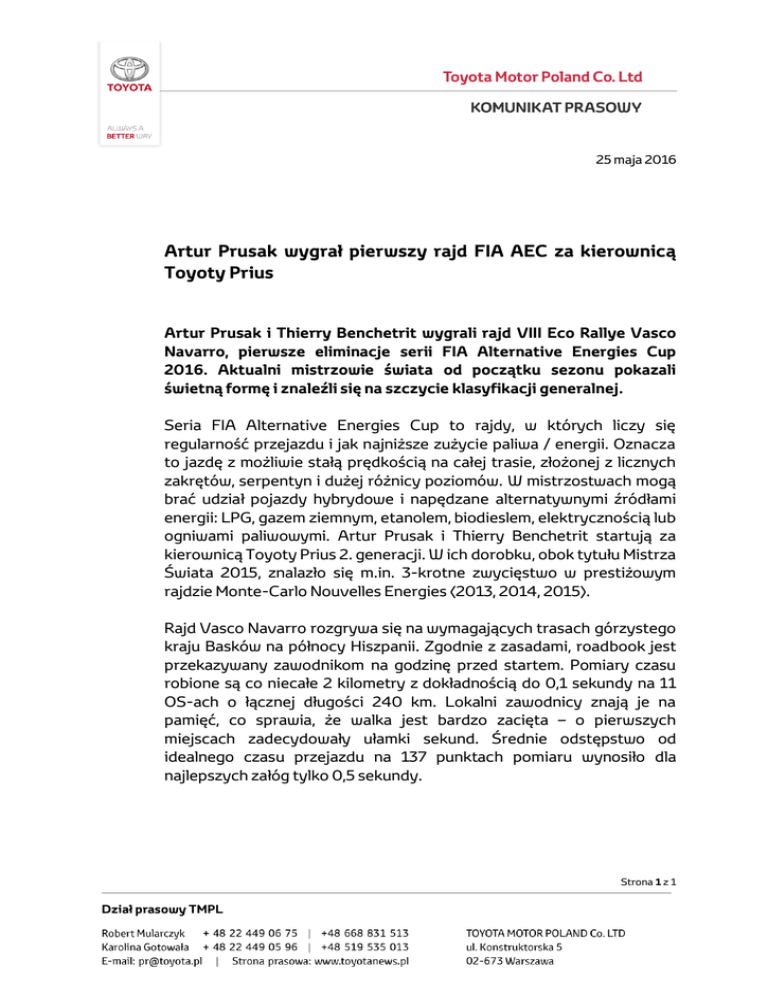 25 maja 2016 Artur Prusak wygrał pierwszy rajd FIA AEC za kierownicą Toyoty Prius Artur Prusak i Thierry Benchetrit wygrali rajd VIII Eco Rallye Vasco Navarro, pierwsze eliminacje serii FIA Alternative Energies Cup 2016. Aktualni mistrzowie świata od początku sezonu pokazali świetną formę i znaleźli się na szczycie klasyfikacji generalnej. Seria FIA Alternative Energies Cup to rajdy, w których liczy się regularność przejazdu i jak najniższe zużycie paliwa / energii. Oznacza to jazdę z możliwie stałą prędkością na całej trasie, złożonej z licznych zakrętów, serpentyn i dużej różnicy poziomów. W mistrzostwach mogą brać udział pojazdy hybrydowe i napędzane alternatywnymi źródłami energii: LPG, gazem ziemnym, etanolem, biodieslem, elektrycznością lub ogniwami paliwowymi. Artur Prusak i Thierry Benchetrit startują za kierownicą Toyoty Prius 2. generacji. W ich dorobku, obok tytułu Mistrza Świata 2015, znalazło się m.in. 3-krotne zwycięstwo w prestiżowym rajdzie Monte-Carlo Nouvelles Energies (2013, 2014, 2015). Rajd Vasco Navarro rozgrywa się na wymagających trasach górzystego kraju Basków na północy Hiszpanii. Zgodnie z zasadami, roadbook jest przekazywany zawodnikom na godzinę przed startem. Pomiary czasu robione są co niecałe 2 kilometry z dokładnością do 0,1 sekundy na 11 OS-ach o łącznej długości 240 km. Lokalni zawodnicy znają je na pamięć, co sprawia, że walka jest bardzo zacięta – o pierwszych miejscach zadecydowały ułamki sekund. Średnie odstępstwo od idealnego czasu przejazdu na 137 punktach pomiaru wynosiło dla najlepszych załóg tylko 0,5 sekundy. Strona 1 z 1