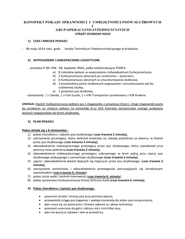 KONSPEKT POKAZU SPRAWNOŚCI I UMIEJĘTNOŚCI PSÓW SŁUŻBOWYCH I GRUP OPERACYJNO-INTERWENCYJNYCH STRAŻY OCHRONY KOLEI 1) CZAS I MIEJSCE POKAZU - 06 maja 2014 roku godz. boisko Technikum Telekomunikacyjnego w Krakowie. 2) WYPOSAŻENIE I ZABEZPIECZENIE LOGISTYCZNE - pistolety P-99 i PM - 98, kajdanki, RMG, pałka wielofunkcyjna TONFA a) 8 członków pokazu w wyposażeniu indywidualnym funkcjonariusza, b) 2 funkcjonariuszy ubranych po cywilnemu – pozoranci, c) 6 funkcjonariuszy ubranych w umundurowanie służbowe, d) 2 przewodnicy psów służbowych wyposażeni i umundurowani jak do codziennej służby, e) 1 pozorant psy służbowe, - samochody : 1 x Skoda, 1 x Fiat Scudo, 1 x VW Transporter oznakowany z IOK Kraków. UWAGA: Dwóch funkcjonariuszy pobiera po 1 magazynku z amunicją (15szt.), drugi magazynek pusty po przybyciu na miejsce pokazu na komendę d-cy GOI Konrada Jachymczyka nastąpi podpięcie pustych magazynków do broni służbowej. 3) PLAN POKAZU Pokaz składa się z 8 elementów : 1) pokaz charakteru i ciętości psa służbowego (czas trwania 2 minuty), 2) zatrzymanie przestępcy, który dokonał kradzieży na szkodę podróżnej na dworcu w tłumie przez psa służbowego (czas trwania 2 minuty), 3) obezwładnienie niebezpiecznego przestępcy przez psa służbowego, który zaatakował przy pomocy noża podróżną (czas trwania 2 minuty), 4) obezwładnienie niebezpiecznego przestępcy uzbrojonego w broń palną przy użyciu psa służbowego atakującego z samochodu służbowego (czas trwania 3 minuty), 5) ujęcie i obezwładnienie dwóch bijących się mężczyzn przez psa służbowego, (czas trwania 2 minuty), 6) zatrzymanie samochodu i obezwładnienie przestępców poruszających się skradzionym samochodem (czas trwania 4, minuty). 7) pokaz sztuk walki i technik interwencji (czas trwania 6, minuty), 8) pokaz sprawności funkcjonariuszy Straży Ochrony Kolei (czas trwania 4, minuty), 4) Pokaz charakteru i ciętości psa służbowego. pozorant strzela i straszy psa przy pomocy pejcza, przewodnik ściąga psu kaganiec i wydaje komendę do ataku psa na pozoranta, pies rzuca się na pozoranta i chwyta zębami za rękaw ochronny, pozorant unosi psa do góry i obraca się z nim kilka razy, pies nie puszcza rękawa i wisi w powietrzu, przewodnik w miedzy czasie strzela kilka razy pejczem blisko psa i udaje że go uderza trzonkiem pejcza, pomimo strzałów i uderzeń pies nie puszcza rękawa, następnie pozorant zrzuca rękaw i odchodzi, pies zadowolony odchodzi z rękawem trzymając go w pysku i biegnie jedno okrążenie. 5) Zatrzymanie niebezpiecznego przestępcy uzbrojonego w broń palną w tłumie przy użyciu psa służbowego. patrol zauważa przestępcę, który wyrwał podróżnej torebkę, przestępca ucieka w tłum, przewodnik puszcza psa który obezwładnia przestępcę, f-sze po obezwładnieniu przeszukują, zakładają kajdanki i wyprowadzają z miejsca zdarzenia. 6) obezwładnienie niebezpiecznego przestępcy przez psa służbowego, który zaatakował przy pomocy noża podróżną, Osoba postronna (kobieta) zostaje napadnięta przez złodzieja, który usiłuje odebrać jej torebkę. Napastnik zwraca się do kobiety z żądaniem oddania torebki. Kobieta odmawia, przestępca usiłuje wyrwać kobiecie torebkę. Napadnięta broni się i wzywa pomocy. Patrol funkcjonariuszy w składzie dwuosobowym w tym pies służbowy podejmuje interwencję. Na widok funkcjonariuszy przestępca wyciąga nóż, chwyta kobietę i przystawia jej nóż do gardła. Dowódca patrolu - (krótka negocjacja), co pan robi, zastaw kobietę itp.). W trakcie rozmowy dowódcy patrolu z przestępcą przewodnik psa służbowego zachodzi przestępcę z boku. Podczas negocjacji napastnik jest zdezorientowany, na umówione wcześniej hasło przewodnik jednym ruchem odpina psu kaganiec i głośno krzyczy w kierunku przestępcy. Napastnik reaguje na krzyk i odwraca głowę oraz rękę w której trzyma nóż w kierunku przewodnika. W momencie odwrócenia uwagi oraz głowy przewodnik wydaje polecenie psu który natychmiast atakuje przestępcę chwytając go za rękę w której trzyma niebezpieczne narzędzie. Następnie dowódca patrolu doskakuje do napastnika i obezwładnia go. Przewodnik psa cały czas asekuruje i zabezpiecza przebieg interwencji. Napastnik zostaje obezwładniony, skuty i obszukany. 7) Obezwładnienie niebezpiecznego przestępcy uzbrojonego w broń palną przy użyciu psa służbowego atakującego z samochodu służbowego. przestępca spostrzega zmotoryzowany patrol i odwrotnie, przestępca zostaje wezwany do porzucenia broni i zachowania zgodnego z prawem oraz podporządkowania się poleceniom funkcjonariuszy (polecenia przez megafon z samochodu), przestępca nie reaguje, wyciąga i używa broni palnej, strzela w kierunku samochodu SOK, przestępca ucieka i strzela, z samochodu zostaje puszczony pies, pies służbowy zatrzymuje niebezpiecznego przestępcę chwytając go zębami za rękaw, nogę lub górną cześć ciała i przewraca go, samochód dojeżdża do zatrzymanego przez psa, funkcjonariusze odbierają i zabezpieczają broń, zakładają kajdanki przy asekuracji f-sza i psa, po obszukaniu przestępcy i po doprowadzeniu do samochodu odjazd z zatrzymanym 8) Ujęcie i obezwładnienie dwóch bijących się mężczyzn przez psa służbowego Dwaj mężczyźni przepychają się i szarpią, dwu osobowy patrol z psem służbowym podejmuje interwencję. Wzywa mężczyzn do podporządkowania się poleceniom. Na widok funkcjonariuszy jeden z mężczyzn uderza i przewraca na ziemię drugiego a następnie ucieka. Przewodnik psa służbowego ostrzega że zostanie użyty pies. Uciekający nie reaguje na wezwanie funkcjonariusza. Przewodnik używa psa – pies w biegu przeskakuje nad leżącym mężczyzną a następnie chwyta uciekającego za rękę i przewraca na ziemię. Funkcjonariusze po obezwładnieniu przeszukują, zakładają kajdanki i wyprowadzają z miejsca zdarzenia w/w mężczyzn. 9) Za