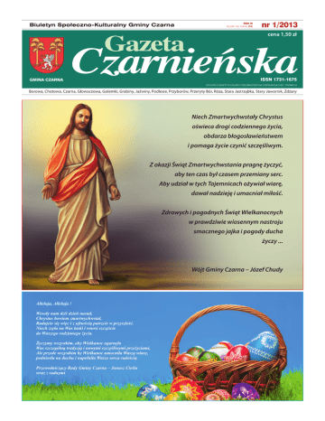 ROK XI styczeń, luty, marzec (64) nr 1/2013 cena 1,50 zł GMINA CZARNA Borowa, Chotowa, Czarna, Głowaczowa, Golemki, Grabiny, Jaźwiny, Podlesie, Przyborów, Przeryty Bór, Róża, Stara Jastrząbka, Stary Jawornik, Żdżary Niech Zmartwychwstały Chrystus oświeca drogi codziennego życia, obdarza błogosławieństwem i pomaga życie czynić szczęśliwym. Z okazji Świąt Zmartwychwstania pragnę życzyć, aby ten czas był czasem przemiany serc. Aby udział w tych Tajemnicach ożywiał wiarę, dawał nadzieję i umacniał miłość. Zdrowych i pogodnych Świąt Wielkanocnych w prawdziwie wiosennym nastroju smacznego jajka i pogody ducha życzy ... Wójt Gminy Czarna – Józef Chudy Alleluja, Alleluja ! Wesoły nam dziś dzień nastał, Chrystus bowiem zmartwychwstał, Radujcie się więc i z ufnością patrzcie w przyszłość. Niech zsyła na Was łaski i wnosi szczęście do Waszego rodzinnego życia. Życzymy wszystkim, aby Wielkanoc ogarnęła Was szczególną tradycją i nowymi szczęśliwymi przeżyciami, Ale przede wszystkim by Wielkanoc umocniła Waszą wiarę, podniosła na duchu i napełniła Wasze serca radością Przewodniczący Rady Gminy Czarna – Janusz Cieśla wraz z radnymi Gazeta Czarnieńska str. 2 FOTOREPORTAŻ nr 1 BAL KARNAWAŁOWY W PRZYBOROWIE „W karnawale same bale”. W Przedszkolu w Przyborowie nie mogło, więc być inaczej. W Tłusty Czwartek odbył się długo oczekiwany bal przebierańców. Na imprezę przybyły m.in. księżniczki, wróżki, motylki w towarzystwie strażaków, policjantów, piratów, Batmanów, Spidermanów i innych bajkowych superbohaterów. Nawet panie nauczycielki w tym dniu nie były sobą. W Sali ozdobionej balonami, kolorową bibułą i serpentynami przedszkolaki bawiły się przy znanych dziecięcych melodiach, i oczywiście przy dyskotekowych rytmach. Podczas zabawy organizowane były różne gry i konkursy. Na koniec, jak karze tradycja tego dnia wszyscy zajadali się pysznymi pączkami. Gabriela Kozioł Księżniczki i piraci na balu w Przedszkolu w Przyborowie. Pamiątkowe zdjęcie uczestników balu. Piękne stroje z wielu bajek dominowały w Żdżarach. Lemoniadowy konkurs? Pani Ewa w roli wodzireja. Tańcom nie było końca. Rodzice tym razem w roli widzów. Pirat to obowiązkowy strój na bal karnawałowy. BAL KARNAWAŁOWY W ŻDŻARACH Gazeta Czarnieńska nr 1 str. 3 NIE MA WINDY DO SUKCESU – TRZEBA WYJŚĆ PO SCHODACH Uczniowie szkół podstawowych z terenu Gminy Czarna od września 2012 roku uczestniczą w projekcie „Indywidualizacja nauczania – nie ma windy do sukcesu, trzeba wyjść po schodach” w ramach Programu Operacyjnego Kapitał Ludzki, Priorytet IX. Rozwój wykształcenia i kompetencji w regionach, działanie 9.1. Wyrównywanie szans edukacyjnych i zapewnienie wysokiej, jakości usług edukacyjnych świadczonych w systemie oświaty, Poddziałanie 9.1.2. Wyrównywanie szans edukacyjnych uczniów z grup o utrudnionym dostępie do edukacji oraz zmniejszanie różnic w jakości usług edukacyjnych. Realizacja projektu polega na doposażeniu szkół w sprzęt, materiały i pomoce dydaktyczne niezbędne do realizacji zaplanowanych w szkołach zajęć dodatkowych wynikających z procesu indywidualizacji nauczania. W poszczególnych zajęciach biorą udział dzieci z klas I - III, u których wcześniej zdiagnozowano określone problemy oraz uzdolnienia. Wszystkie zajęcia dodatkowe są prowadzone przez nauczycieli w ramach art. 42 Karty Nauczyciela. Uczniowie biorą udział w zajęciach wyrównawczych i wzbogacających za- interesowania, m.in. zajęcia dla dzieci ze specyficznymi trudnościami w czytaniu i pisaniu, w tym także zagrożonych ryzykiem dysleksji, zajęcia dla dzieci z trudnościami w zdobywaniu umiejętności matematycznych, zajęcia logopedyczne dla dzieci z zaburzeniami rozwoju mowy, gimnastyka korekcyjna dla dzieci z wadami postawy, zajęcia rozwijające zainteresowania uczniów szczególnie uzdolnionych ze szczególnym uwzględnieniem nauk matematyczno-przyrodniczych oraz w zajęciach artystycznych. Zakupione zostały różnorodne pomoce dydaktyczne, zgodne z potrzebami uczestników zajęć, które uatrakcyjniają proces dydaktyczny, mobilizują uczniów do większego wysiłku umysłowego, rozbudzają u nich ciekawość poznawczą świata, wpływają na wzrost ich aspiracji edukacyjnych, potwierdzają, że nauka nie musi być nudna. Sprawiają, że dzieci bardzo chętnie i z wielkim zaangażowaniem uczestniczą w prowadzonych zajęciach. Wszystkie zajęcia są bardzo atrakcyjne dla dzieci. Osoby prowadzące wykorzystują na nich nowoczesne środki dydaktyczne, którymi doposażono placówki. Szczególnie chętnie wykorzystywane są pro- gramy komputerowe, plansze tematyczne, modele, gry edukacyjne, liczmany, wagi, mikroskopy itp. Dzieci z dużym zaangażowaniem uczestniczą w zajęciach. Pozwala im to zaspokoić ciekawość poznawczą, zmobilizować się do nauki i odkrywać tajniki wiedzy. Uczniowie poszerzają wiadomości, wykonują doświadczenia z wykorzystaniem małego laboratorium, organizują praktyczne zabawy i gry edukacyjne. Ponadto stale doskonalą umiejętności w zakresie czytania, pisania i liczenia. Na takich zajęciach uczniowie niwelują trudności w zakresie realizowanych treści programowych, kształtują umiejętność dobrej orientacji w przestrzeni, usprawniają percepcję wzrokową, słuchową, podnoszą sprawność manualną, rozwijają umiejętność skupiania uwagi. Zakupione pomoce dydaktyczne wspomagają naukę czytania i pisania, umożliwią korygowanie wad wymowy i postawy, pomagają rozwijać zdolności matematyczne, przyrodnicze oraz artystyczne. Łączna wartość realizowanego projektu wynosi 313 063,00 zł, którą Gmina Czarna pozyskała ze środków unijnych. Projekt współfinansowany przez Unię Europejską w ramach Europejskiego Funduszu Społecznego Biuletyn Społeczno-Kulturalny Gminy Czarna redaktor naczelny: Stanisław Zieliński skład redakcji: