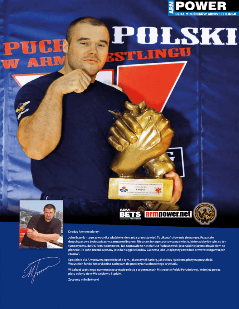 Drodzy Armwrestlerzy! John Brzenk – tego zawodnika właściwie nie trzeba przedstawiać. To „ikona” siłowania się na ręce. Przez całe dotychczasowe życie związany z armwrestlingiem. Nie znam innego sportowca na świecie, który zdobyłby tyle, co ten sympatyczny, dziś 47-letni sportowiec. Tak naprawdę to nie Mariusz Pudzianowski jest najsilniejszym człowiekiem na planecie. To John Brzenk wpisany jest do Księgi Rekordów Guinessa jako „Najlepszy zawodnik armwrestlingu wszech czasów”. Specjalnie dla Armpowera opowiedział o tym, jak zaczynał karierę, jak ćwiczy i jakie ma plany na przyszłość. Wszystkich fanów Amerykanina zachęcam do przeczytania obszernego wywiadu. W dalszej części tego numeru przeczytacie relację z tegorocznych Mistrzostw Polski Południowej, które już po raz piąty odbyły się w Wodzisławiu Śląskim. Życzymy miłej lektury! JOHN BRZENK PRAWDZIWA HISTORIA MISTRZA Na świecie jest kilka sportowych nazwisk, na dźwięk których samoczynnie podnosimy się od razu z miejsca. Mowa tutaj oczywiście o „ikonach” poszczególnych dyscyplin sportowych. Podobnie jest także w siłowaniu na ręce, gdzie miłośnicy tego sportu mają swoich celebrytów armwrestlingowych. Jednym z nich jest na pewno żywa legenda siłowania na ręce, amerykański zawodnik polskiego pochodzenia – John Brzenk. P raktycznie przez całe życie Johna Brzenka przewija się armwrestling. Nie znam innego sportowca na świecie, który zdobyłby tyle, co ten sympatyczny, dziś czterdziestosiedmioletni sportowiec. I tak naprawdę to nie Pudzian, ale amerykański armwrestler John Brzenk jest najsilniejszym człowiekiem na planecie. Tak Imię i nazwisko: John Brzenk Data urodzenia: 15 lipca 1964 Waga: 95 kg – 100 kg Wzrost: 180 cm Miejsce zam.: Sandy, Utah (USA) Wykształcenie: 2 lata Airframe College / Inżynier elektryk Stan cywilny: żonaty Hobby: jazda na motocyklu/ skuterze śnieżnym KiF nr 3 / 2011 przynajmniej podaje Księga Rekordów Guinessa, która uhonorowała go tytułem „Najlepszego zawodnika armwrestlingu wszech czasów”. Od 2004 roku, dzięki promotorowi polskiego oraz zawodowego armwrestlingu – Igorowi Mazurence z Gdyni, polscy zawodnicy oraz kibice mają możliwość oglądania na żywo tego zawodnika w akcji. Choć John wcześniej startował już na europejskich turniejach (w latach dziewięćdziesiątych na turnieju „Złoty Niedźwiedź” w Rosji, czy też na Super Bras de Fer w Paryżu), to, jak sam twierdzi: na tę chwilę jest jeden turniej w Europie, gdzie startują najsilniejsi armwrestlerzy świata. Wygrana na tym turnieju jest równoznaczna z uzyskaniem tytułu: „najsilniejszy, profesjonalny zawodnik w armwrestlingu”. Jest to coroczny Puchar Świata Zawodowców - Nemiroff World Cup organizowany w Polsce. Dzięki współpracy z zawodową organizacją PAL (Professional Armwrestling League) od 2005 roku John Brzenk z powodzeniem startuje również w sześciorundowych starciach Armfight. Do tej pory stoczył siedem takich pojedynków, i jak na mistrza przystało oczywiście wszystkie je wygrał. Dodatkowo John jest posiadaczem dwóch pasów Mistrza Świata organizacji PAL na rękę prawą (jeden pas w kategorii 95 kg – zdobyty w 2005 oraz jeden pas w kategorii +95kg – zdobyty w 2008 roku i obroniony w 2010 roku). Poziom przygotowania tego zawodnika sprawia, że był, jest i jeszcze długo będzie gwiazdą siłowania na ręce. Jak to się stało, że w ogóle zaczął trenować armwrestling, jak wygląda jego trening oraz gdzie i jaką wygrał największą nagrodę w historii armwrestlingu? Odpowiedzi na te i inne pytania przeczytacie w obszernym wywiadzie z arcymistrzem Johnem Brzenkiem z USA. Wywiad • JOHN BRZENK 85 Przygodę z armwrestlingiem zacząłem na poważnie w wieku 17 lat Ile miałeś lat kiedy zacząłeś siłować się na rękę ze swoim ojcem i gdzie wtedy mieszkałeś? John Brzenk: Zacząłem się siłować na długo przedtem, zanim ojciec wciągnął mnie w profesjonalne zawody. Pamiętam, jak siłowałem się przez całe trzy lata w liceum Parkland w McHenry Illinois. Każdego ranka, przed lekcjami mieliśmy dwudziestominutowe apele. W tym czasie uprawialiśmy armwrestling. Czwórka, może piątka dzieciaków robiła to codziennie rano. Byłem niewątpliwie najlepszy. Przed ukończeniem 13 lat nie siłowałem się regularnie. W tym wieku złamałem łokieć, siłując się z kolegą mojego taty, który był mistrzem wagi muszej. Regularne treningi odłożyłem na około trzy lata, nie licząc miesięcy letnich, ponieważ przeprowadziłem się do Utah i mieszkałem z moją mamą przez pierwsze trzy lata liceum. Po powrocie do Illinois, przed ostatnią klasą liceum, razem z tatą rozpocząłem swoją przygodę z armwrestlingiem na poważnie. Miałem wtedy jakieś 17 lat. Moja kariera w siłowaniu na rękę rozpoczęła się w Midwest Chicago. Co spowodowało, że Twój ojciec zaczął siłować się na rękę i jak długo trenował sam zanim spróbowałeś pierwszy raz? JB: Mój ojciec był po prostu silnym facetem, który lubił być w formie i pracować nad swoją wagą. Miał własną kręgielnię i przez większość czasu pracował tam za barem. Jeden z klientów powiedział mu o zawodach w armwrestlingu, które odbywały się właśnie w Chicago. Nie wiem, jak dobrze mu poszło, ale właśnie to obudziło w nim zamiłowanie do tego sportu. Miałem wtedy 11 może 12 lat. I nie zacząłem siłować się z nim będąc nastolatkiem. John Brzenk z Igorem Mazurenko z Polski było towarzyszenie mojemu tacie w barze podczas jego pracy. Od razu się wciągnąłem i dalej, co drugi tydzień, chodziłem na wszystkie zawody razem z nim. nauczyłem się wiele od tego szczupłego mężczyzny, który mógł pochodzić z południa Bert Whitfield. On był wspaniały i pomógł mi zrozumieć różne chwyty. Top roll i technikę dźwigni. Co sądzisz o swoim występie w pierwszym turnieju? Do jakiej kategorii wagowej należa