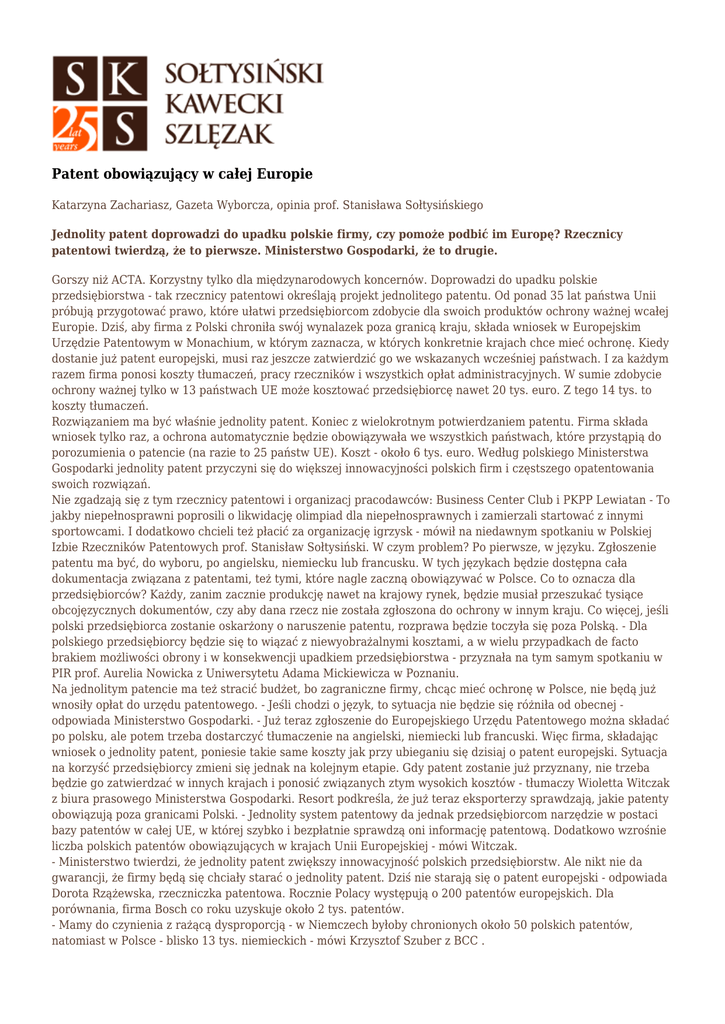 Patent obowiązujący w całej Europie Katarzyna Zachariasz, Gazeta Wyborcza, opinia prof. Stanisława Sołtysińskiego Jednolity patent doprowadzi do upadku polskie firmy, czy pomoże podbić im Europę? Rzecznicy patentowi twierdzą, że to pierwsze. Ministerstwo Gospodarki, że to drugie. Gorszy niż ACTA. Korzystny tylko dla międzynarodowych koncernów. Doprowadzi do upadku polskie przedsiębiorstwa - tak rzecznicy patentowi określają projekt jednolitego patentu. Od ponad 35 lat państwa Unii próbują przygotować prawo, które ułatwi przedsiębiorcom zdobycie dla swoich produktów ochrony ważnej wcałej Europie. Dziś, aby firma z Polski chroniła swój wynalazek poza granicą kraju, składa wniosek w Europejskim Urzędzie Patentowym w Monachium, w którym zaznacza, w których konkretnie krajach chce mieć ochronę. Kiedy dostanie już patent europejski, musi raz jeszcze zatwierdzić go we wskazanych wcześniej państwach. I za każdym razem firma ponosi koszty tłumaczeń, pracy rzeczników i wszystkich opłat administracyjnych. W sumie zdobycie ochrony ważnej tylko w 13 państwach UE może kosztować przedsiębiorcę nawet 20 tys. euro. Z tego 14 tys. to koszty tłumaczeń. Rozwiązaniem ma być właśnie jednolity patent. Koniec z wielokrotnym potwierdzaniem patentu. Firma składa wniosek tylko raz, a ochrona automatycznie będzie obowiązywała we wszystkich państwach, które przystąpią do porozumienia o patencie (na razie to 25 państw UE). Koszt - około 6 tys. euro. Według polskiego Ministerstwa Gospodarki jednolity patent przyczyni się do większej innowacyjności polskich firm i częstszego opatentowania swoich rozwiązań. Nie zgadzają się z tym rzecznicy patentowi i organizacj pracodawców: Business Center Club i PKPP Lewiatan - To jakby niepełnosprawni poprosili o likwidację olimpiad dla niepełnosprawnych i zamierzali startować z innymi sportowcami. I dodatkowo chcieli też płacić za organizację igrzysk - mówił na niedawnym spotkaniu w Polskiej Izbie Rzeczników Patentowych prof. Stanisław Sołtysiński. W czym problem? Po pierwsze, w języku. Zgłoszenie patentu ma być, do wyboru, po angielsku, niemiecku lub francusku. W tych językach będzie dostępna cała dokumentacja związana z patentami, też tymi, które nagle zaczną obowiązywać w Polsce. Co to oznacza dla przedsiębiorców? Każdy, zanim zacznie produkcję nawet na krajowy rynek, będzie musiał przeszukać tysiące obcojęzycznych dokumentów, czy aby dana rzecz nie została zgłoszona do ochrony w innym kraju. Co więcej, jeśli polski przedsiębiorca zostanie oskarżony o naruszenie patentu, rozprawa będzie toczyła się poza Polską. - Dla polskiego przedsiębiorcy będzie się to wiązać z niewyobrażalnymi kosztami, a w wielu przypadkach de facto brakiem możliwości obrony i w konsekwencji upadkiem przedsiębiorstwa - przyznała na tym samym spotkaniu w PIR prof. Aurelia Nowicka z Uniwersytetu Adama Mickiewicza w Poznaniu. Na jednolitym patencie ma też stracić budżet, bo zagraniczne firmy, chcąc mieć ochronę w Polsce, nie będą już wnosiły opłat do urzędu patentowego. - Jeśli chodzi o język, to sytuacja nie będzie się różniła od obecnej odpowiada Ministerstwo Gospodarki. - Już teraz zgłoszenie do Europejskiego Urzędu Patentowego można składać po polsku, ale potem trzeba dostarczyć tłumaczenie na angielski, niemiecki lub francuski. Więc firma, składając wniosek o jednolity patent, poniesie takie same koszty jak przy ubieganiu się dzisiaj o patent europejski. Sytuacja na korzyść przedsiębiorcy zmieni się jednak na kolejnym etapie. Gdy patent zostanie już przyznany, nie trzeba będzie go zatwierdzać w innych krajach i ponosić związanych ztym wysokich kosztów - tłumaczy Wioletta Witczak z biura prasowego Ministerstwa Gospodarki. Resort podkreśla, że już teraz eksporterzy sprawdzają, jakie patenty obowiązują poza granicami Polski. - Jednolity system patentowy da jednak przedsiębiorcom narzędzie w postaci bazy patentów w całej UE, w której szybko i bezpłatnie sprawdzą oni informację patentową. Dodatkowo wzrośnie liczba polskich patentów obowiązujących w krajach Unii Europejskiej - mówi Witczak. - Ministerstwo twierdzi, że jednolity patent zwiększy innowacyjność polskich przedsiębiorstw. Ale nikt nie da gwarancji, że firmy będą się chciały starać o jednolity patent. Dziś nie starają się o patent europejski - odpowiada Dorota Rzążewska, rzeczniczka patentowa. Rocznie Polacy występują o 200 patentów europejskich. Dla porównania, firma Bosch co roku uzyskuje około 2 tys. patentów. - Mamy do czynienia z rażącą dysproporcją - w Niemczech byłoby chronionych około 50 polskich patentów, natomiast w Polsce - blisko 13 tys. niemieckich - mówi Krzysztof Szuber z BCC .