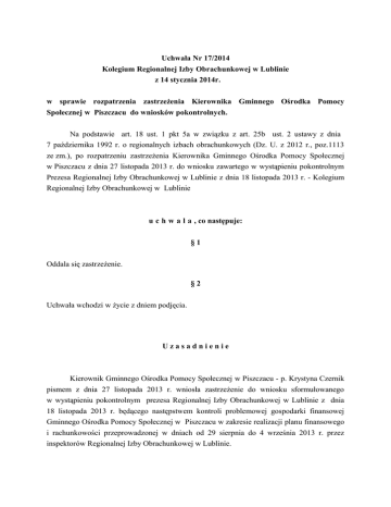 Uchwała Nr 17/2014 Kolegium Regionalnej Izby Obrachunkowej w Lublinie z 14 stycznia 2014r. w sprawie rozpatrzenia zastrzeżenia Kierownika Gminnego Ośrodka Pomocy Społecznej w Piszczacu do wniosków pokontrolnych. Na podstawie art. 18 ust. 1 pkt 5a w związku z art. 25b ust. 2 ustawy z dnia 7 października 1992 r. o regionalnych izbach obrachunkowych (Dz. U. z 2012 r., poz.1113 ze zm.), po rozpatrzeniu zastrzeżenia Kierownika Gminnego Ośrodka Pomocy Społecznej w Piszczacu z dnia 27 listopada 2013 r. do wniosku zawartego w wystąpieniu pokontrolnym Prezesa Regionalnej Izby Obrachunkowej w Lublinie z dnia 18 listopada 2013 r. - Kolegium Regionalnej Izby Obrachunkowej w Lublinie u c h w a l a , co następuje: §1 Oddala się zastrzeżenie. §2 Uchwała wchodzi w życie z dniem podjęcia. Uzasadnienie Kierownik Gminnego Ośrodka Pomocy Społecznej w Piszczacu - p. Krystyna Czernik pismem z dnia 27 listopada 2013 r. wniosła zastrzeżenie do wniosku sformułowanego w wystąpieniu pokontrolnym prezesa Regionalnej Izby Obrachunkowej w Lublinie z dnia 18 listopada 2013 r. będącego następstwem kontroli problemowej gospodarki finansowej Gminnego Ośrodka Pomocy Społecznej w Piszczacu w zakresie realizacji planu finansowego i rachunkowości przeprowadzonej w dniach od 29 sierpnia do 4 września 2013 r. przez inspektorów Regionalnej Izby Obrachunkowej w Lublinie. 2 W oparciu o ustalenia kontroli do Kierownika Gminnego Ośrodka Pomocy Społecznej w Piszczacu skierowane zostało wystąpienie pokontrolne, w którym stwierdzono nieuwzględnienie w podstawie naliczenia dodatkowego wynagrodzenia rocznego za rok 2012 dodatku za wieloletnią pracę, należnego pracownikom korzystającym ze zwolnienia chorobowego - za okres trwania choroby. Zalecono, aby do podstawy naliczenia dodatkowego wynagrodzenia rocznego wliczać dodatek za wieloletnią pracę przysługujący pracownikowi za dni, za które otrzymuje wynagrodzenie oraz za dni nieobecności w pracy z powodu niezdolności do pracy wskutek choroby albo konieczności osobistego sprawowania opieki nad dzieckiem lub chorym członkiem rodziny, za które pracownik otrzymuje z tego tytułu zasiłek z ubezpieczenia społecznego, zgodnie z przepisami § 7 ust. 2 rozporządzenia Rady Ministrów z 18 marca 2009 r. w sprawie wynagradzania pracowników samorządowych ( Dz. U z 2013 r., poz. 1050 z późn. zm. ) oraz art. 4 ust. 1 ustawy z dnia 12 grudnia 1997 r. o dodatkowym wynagrodzeniu rocznym pracowników sfery budżetowej ( Dz. U. z 2013 r., poz. 1144 ). W ocenie Kierownika Gminnego Ośrodka Pomocy Społecznej ( GOPS ) wskazane wyżej ustalenia i wynikające z nich wnioski zawarte w wystąpieniu pokontrolnym są niezasadne. Zgodnie bowiem z art. 4 ust. 1 ustawy z dnia 12 grudnia 1997 r. o dodatkowym wynagrodzeniu rocznym pracowników jednostek sfery budżetowej (Dz. U. z 2013 r., poz. 1144) wynagrodzenie roczne ustala się w wysokości 8,5 % sumy wynagrodzenia za pracę otrzymanego przez pracownika w ciągu roku kalendarzowego, za który przysługuje to wynagrodzenie, uwzględniając wynagrodzenie i inne świadczenia ze stosunku pracy przyjmowane do obliczenia ekwiwalentu pieniężnego za urlop wypoczynkowy, a także wynagrodzenie za urlop wypoczynkowy oraz wynagrodzenie za czas pozostawania bez pracy przysługujące pracownikowi, który podjął pracę w wyniku przywrócenia do pracy. Przepisy rozporządzenia Ministra Pracy i Polityki Społecznej z dnia 8 stycznia 1997 r. w sprawie szczegółowych zasad udzielania urlopu wypoczynkowego, ustalania i wypłacania wynagrodzenia za czas urlopu oraz ekwiwalentu pieniężnego za urlop ( Dz. U. Nr 2, poz. 14 z późn. zm.), § 14 w związku z § 6 określają, że do podstawy dodatkowego wynagrodzenia rocznego nie wlicza się wynagrodzenia za czas innej usprawiedliwionej nieobecności w pracy (§ 6 pkt 4 ), a więc nie wlicza się wynagrodzenia za urlop okolicznościowy, wynagrodzenia za dwa dni opieki nad zdrowym dzieckiem do 14 lat. Mając na uwadze powyższe Kierownik GOPS uważa, że dodatek za wieloletnią pracę wypłacany za czas usprawiedliwionej nieobecności w pracy wskutek choroby jest inną usprawiedliwioną nieobecnością w pracy i wobec tego nie jest przyjmowany do podstawy ekwiwalentu pieniężnego za urlop wypoczynkowy, a tym samym nie wlicza się go do podstawy dodatkowego wynagrodzenia rocznego Przystępując do analizy sprawy, Kolegium Regionalnej Izby Obrachunkowej w Lublinie ustaliło, że zastrzeżenia złożone przez Kierownika Gminnego Ośrodka Pomocy Społecznej w Piszczacu odpowiadają wymogom formalnym określonym w art. 9 ust. 4 ustawy 3 o regionalnych izbach obrachunkowych. Zostały bowiem złożone we właściwym terminie, a ich podstawą jest zarzut naruszenia wskazanego przez skarżącą prawa poprzez błędną jego wykładnię. Odnosząc się do zastrzeżenia należy zauważyć, że kwestią sporną było to, czy w podstawie naliczenia dodatkowego wynagrodzenia rocznego należy uwzględnić dodatek za wieloletnią pracę należny pracownikom korzystającym ze zwolnienia chorobowego za okres trwania choroby. W trakcie kontroli bowiem stwierdzono przypadki nieprawidłowego naliczania i wypłacenia pracownikom Gminnego Ośrodka Pomocy Społęcznej dodatkowego wynagrodzenia rocznego, w wyniku nieuwzględnienia w podstawie jego naliczenia dodatku za wieloletnią pracę, należnego pracownikom korzystającym ze zwolnienia chorobowego – za okres trwania choroby. W ocenie Kolegium skoro dodatek za wieloletnią pracę przysługuje pracownikowi także za dni usprawiedliwionej nieobecności w pracy, i za te dni pracownik go otrzymuje, to również i w tej części ( oprócz dodatku za dni przepracowane ) powinien wchodzić do podstawy naliczania dodatkowego wynagrodzenia rocznego, które - zgodnie z przepisami art. 4 ust. 1 ustawy z dnia 1997 r o dodatkowym wynagrodzeniu rocznym dla pracowników jednostek sfery budżetowej ( Dz. U. z 2013 r., poz.1144 ) - ustala się w wysokości 8,5